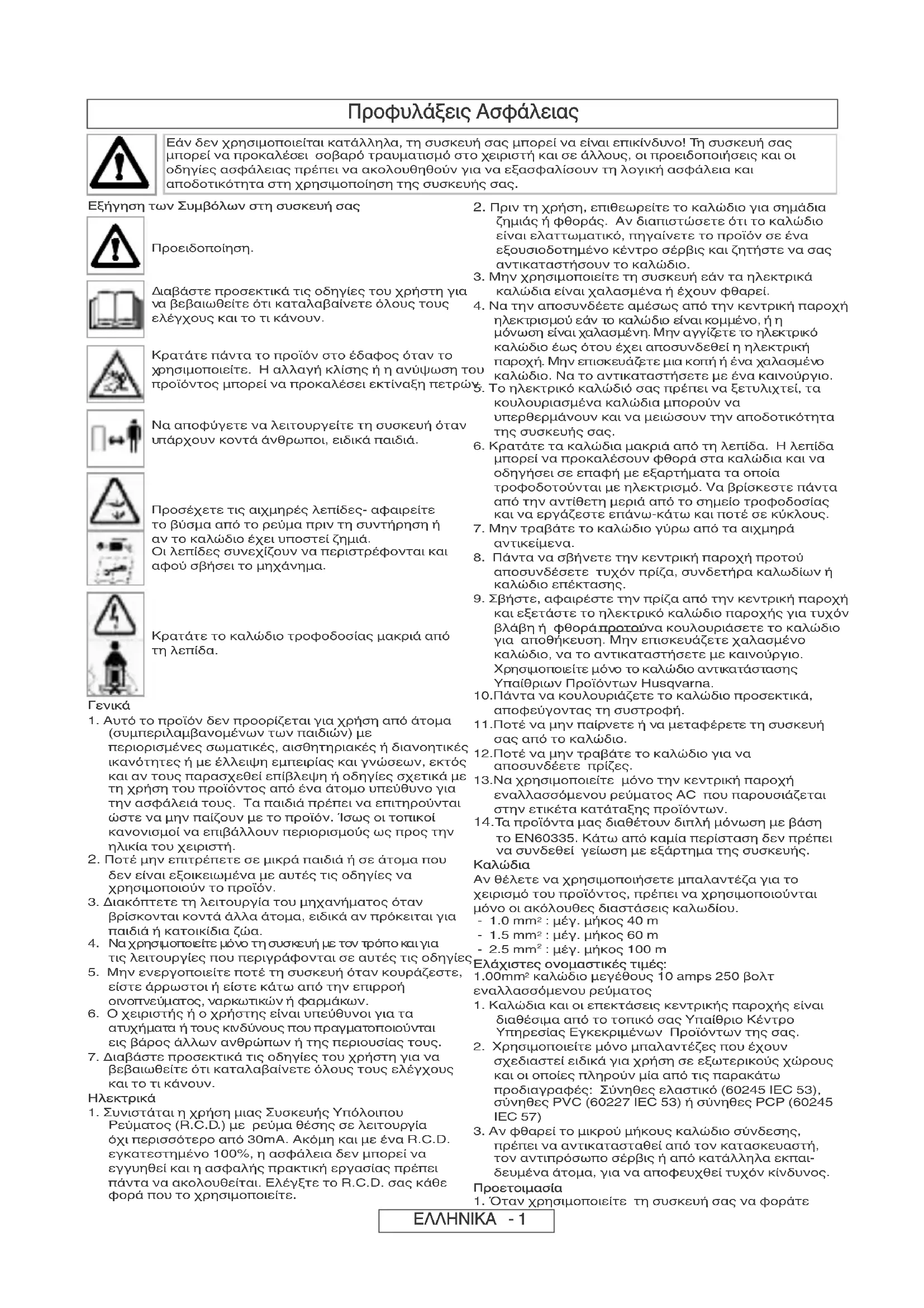 ΕΛΛΗΝΙΚΑ - 1Προφυλάξεις Ασφάλειας πάντα στιβαρά υποδήµατα και µακρύ παντελόνι. Μην χειρίζεστε τον εξοπλισμό ξυπόλυτοι ή ενώ φοράτε ανοικτά πέδιλα