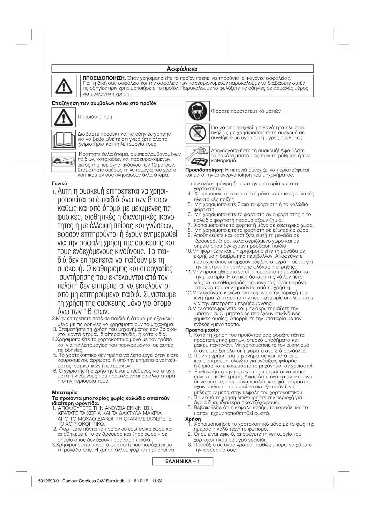 ΠΡΟΕΙΔΟΠΟΙΗΣΗ. Όταν χρησιμοποιείτε το προϊόν πρέπει να τηρούνται οι κανόνες ασφαλείας. Για τη δική σας ασφάλεια και την ασφάλεια των παρευρισκομένων παρακαλούμε να διαβάσετε αυτές τις οδηγίες πριν χρησιμοποιήσετε το προϊόν. Παρακαλούμε να φυλάξετε τις οδηγίες σε ασφαλές μέρος για μελλοντική χρήση. Επεξήγηση των συμβόλων πάνω στο προϊόν Προειδοποίηση Διαβάστε προσεκτικά τις οδηγίες χρήσης για να βεβαιωθείτε ότι γνωρίζετε όλα τα χειριστήρια και τη λειτουργία τους. Κρατήστε άλλα άτομα, συμπεριλαμβανομένων παιδιών, κατοικιδίων και παρευρισκομένων, εκτός της περιοχής κινδύνου των 10 μέτρων. Σταματήστε αμέσως τη λειτουργία του χορτο- κοπτικού αν σας πλησιάσουν άλλα άτομα. Φοράτε προστατευτικό ματιών Για να αποφευχθεί η πιθανότητα ηλεκτρο- πληξίας μη χρησιμοποιείτε τη συσκευή σε συνθήκες με υγρασία ή υγρές συνθήκες. Απενεργοποιήστε τη συσκευή! Αφαιρέστε το πακέτο μπαταρίας πριν τη ρύθμιση ή τον