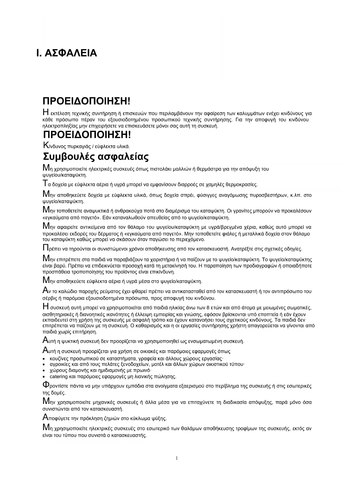 Μην χρησιμοποιείτε μηχανικές συσκευές ή άλλα μέσα για να επιταχύνετε τη διαδικασία απόψυξης, παρά μόνο όσα συνιστώνται από τον κατασκευαστή. Αποφύγετε την πρόκληση ζημιών στο κύκλωμα ψύξης. Μη χρησιμοποιείτε ηλεκτρικές συσκευές στο εσωτερικό των θαλάμων αποθήκευσης τροφίμων της συσκευής, εκτός αν είναι του τύπου που συνιστά ο κατασκευαστής.2 Μην αποθηκεύετε εκρηκτικές ουσίες όπως δοχεία αερολύματος με εύφλεκτο περιεχόμενο σε αυτή τη συσκευή. Αυτή η συσκευή δεν προορίζεται για χρήση από άτομα (συμπεριλαμβανομένων των παιδιών) με μειωμένες φυσικές, κινητικές ή διανοητικές ικανότητες ή χωρίς εμπειρία και γνώσεις, εκτός και εάν εποπτεύονται ή έχουν λάβει οδηγίες αναφορικά με τη χρήση της συσκευής από πρόσωπο υπεύθυνο για την ασφάλειά τους. Τα παιδιά πρέπει να εποπτεύονται συνεχώς ώστε να διασφαλιστεί ότι δεν παίζουν με τη συσκευή. - ΠΡΟΕΙΔΟΠΟΙΗΣΗ: Φροντίστε πάντα να μην υπάρχουν εμπόδια στα ανοίγματα εξαερισμού στο περίβλημα της συσκευής ή στις εσωτερικές της δομές. - ΠΡΟΕΙΔΟΠΟΙΗΣΗ: Μην χρησιμοποιείτε μηχανικές συσκευές ή άλλα μέσα για να επιταχύνετε τη διαδικασία απόψυξης, παρά μόνο όσα συνιστώνται από τον κατασκευαστή. - ΠΡΟΕΙΔΟΠΟΙΗΣΗ: Αποφύγετε την πρόκληση ζημιών στο κύκλωμα ψύξης. - ΠΡΟΕΙΔΟΠΟΙΗΣΗ: Μην χρησιμοποιείτε ηλεκτρικές συσκευές μέσα στα διαμερίσματα αποθήκευσης τροφίμων της συσκευής, εκτός εάν είναι του τύπου που συνιστά ο κατασκευαστής. - ΠΡΟΕΙΔΟΠΟΙΗΣΗ: Οι ψυκτικές συσκευές και ιδιαίτερα ο ψυγειοκαταψύκτης τύπου Ι, ενδέχεται να μην λειτουργούν με συνέπεια (πιθανότητα απόψυξης του περιεχομένου ή να ανέβει η θερμοκρασία και να γίνει πολύ ζεστή στο χώρο των κατεψυγμένων τροφίμων) όταν έχει ρυθμιστεί για μεγάλο χρονικό διάστημα κάτω από το όριο ψύχους του εύρους των θερμοκρασιών οι οποίες έχουν σχεδιαστεί για την ψυκτική συσκευή. - ΠΡΟΕΙΔΟΠΟΙΗΣΗ: Είναι αναγκαίο, επίσης, οι πόρτες ή τα καλύμματα να είναι εφοδιασμένα με κλειδαριές και κλειδιά, με τα κλειδιά αυτά να πρέπει να φυλάσσονται μακριά από παιδιά και όχι κοντά στην ψυκτική συσκευή, προκειμένου να αποφευχθεί το κλείδωμα των παιδιών. - ΠΡΟΕΙΔΟΠΟΙΗΣΗ: Το ψυκτικό υγρό και τα μονωτικά υλικά που χρησιμοποιούνται στη συσκευή απαιτούν ειδικές διαδικασίες απόρριψης. - ΠΡΟΕΙΔΟΠΟΙΗΣΗ: Κατά την τοποθέτηση της συσκευής διασφαλίστε ότι το καλώδιο τροφοδοσίας δεν έχει παγιδευτεί ή υποστεί ζημιά. - ΠΡΟΕΙΔΟΠΟΙΗΣΗ: Μην τοποθετείτε πολλαπλές φορητές πρίζες ή φορητά τροφοδοτικά στο πίσω μέρος της συσκευής Τα παιδιά ηλικίας από 3 έως 8 ετών επιτρέπεται να φορτώνουν και να ξεφορτώνουν τις ψυκτικές συσκευές. Για την αποφυγή της μόλυνσης των τροφίμων, ακολουθήστε τις παρακάτω οδηγίες: - Το άνοιγμα της πόρτας για μεγάλα (χρονικά) διαστήματα μπορεί να προκαλέσει σημαντική αύξηση της θερμοκρασίας στους θαλάμους της συσκευής. - Καθαρίζετε τακτικά τις επιφάνειες που έρχονται σε επαφή με τρόφιμα και προσβάσιμα συστήματα αποστράγγισης. - Καθαρίζετε τα δοχεία νερού, εάν δεν έχουν χρησιμοποιηθεί για 48 ώρες. Ξεπλύνετε το σύστημα νερού που συνδέεται σε παροχή νερού, εάν δεν έχει εκτελεστεί άντληση νερού για 5 ημέρες. - Αποθηκεύετε το ωμό κρέας και τα ψάρια σε κατάλληλα δοχεία στο ψυγείο, ώστε να μην έρχονται σε επαφή και να μην στάζουν επάνω σε άλλα τρόφιμα. - Οι θάλαμοι κατεψυγμένων τροφίμων δύο αστέρων είναι κατάλληλοι για την αποθήκευση προ-κατεψυγμένων τροφίμων, την αποθήκευση ή παρασκε