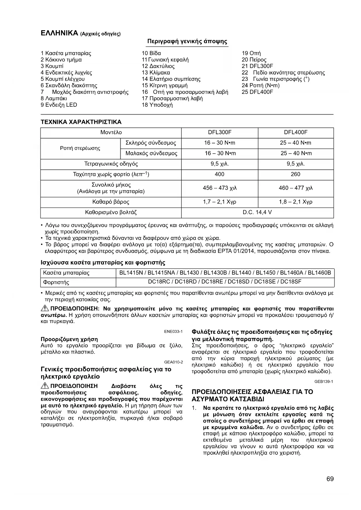 - Selvitä käyttäjän suojaamiseksi tarvittavat varotoimet todellisissa käyttöolosuhteissa tapahtuvan arvioidun altistumisen mukaisesti (ottaen huomioon käyttöjakso kokonaisuudessaan, myös jaksot, joiden aikana laite on sammutettuna tai käy tyhjäkäynnillä).68 EY-VAATIMUSTENMUKAISUUSVAKUUTUS Koskee vain Euroopan maita EY-vaatimustenmukaisuusvakuutus sisältyy tämän käyttöoppaan liitteeseen A.69 ΕΛΛΗΝΙΚΑ (Αρχικές οδηγίες) Περιγραφή γενικής άποψης 1 Κασέτα μπαταρίας 2 Κόκκινο τμήμα 3 Κουμπί 4 Ενδεικτικές λυχνίες 5 Κουμπί ελέγχου 6 Σκανδάλη διακόπτης 7 Μοχλός διακόπτη αντιστροφής 8 Λαμπάκι 9 Ενδειξη LED 10 Βίδα 11 Γωνιακή κεφαλή 12 Δακτύλιος 13 Κλίμακα 14 Ελατήριο συμπίεσης 15 Κίτρινη γραμμή 16 Οπή για προσαρμοστική λαβή 17 Προσαρμοστική λαβή 18 Υποδοχή 19 Οπή 20 Πείρος 21 DFL300F 22 Πεδίο ικανότητας στερέωσης 23 Γωνία περιστροφής (°) 24 Ροπή (N•m) 25 DFL400F ΤΕΧΝΙΚΑ ΧΑΡΑΚΤΗΡΙΣΤΙΚΑ