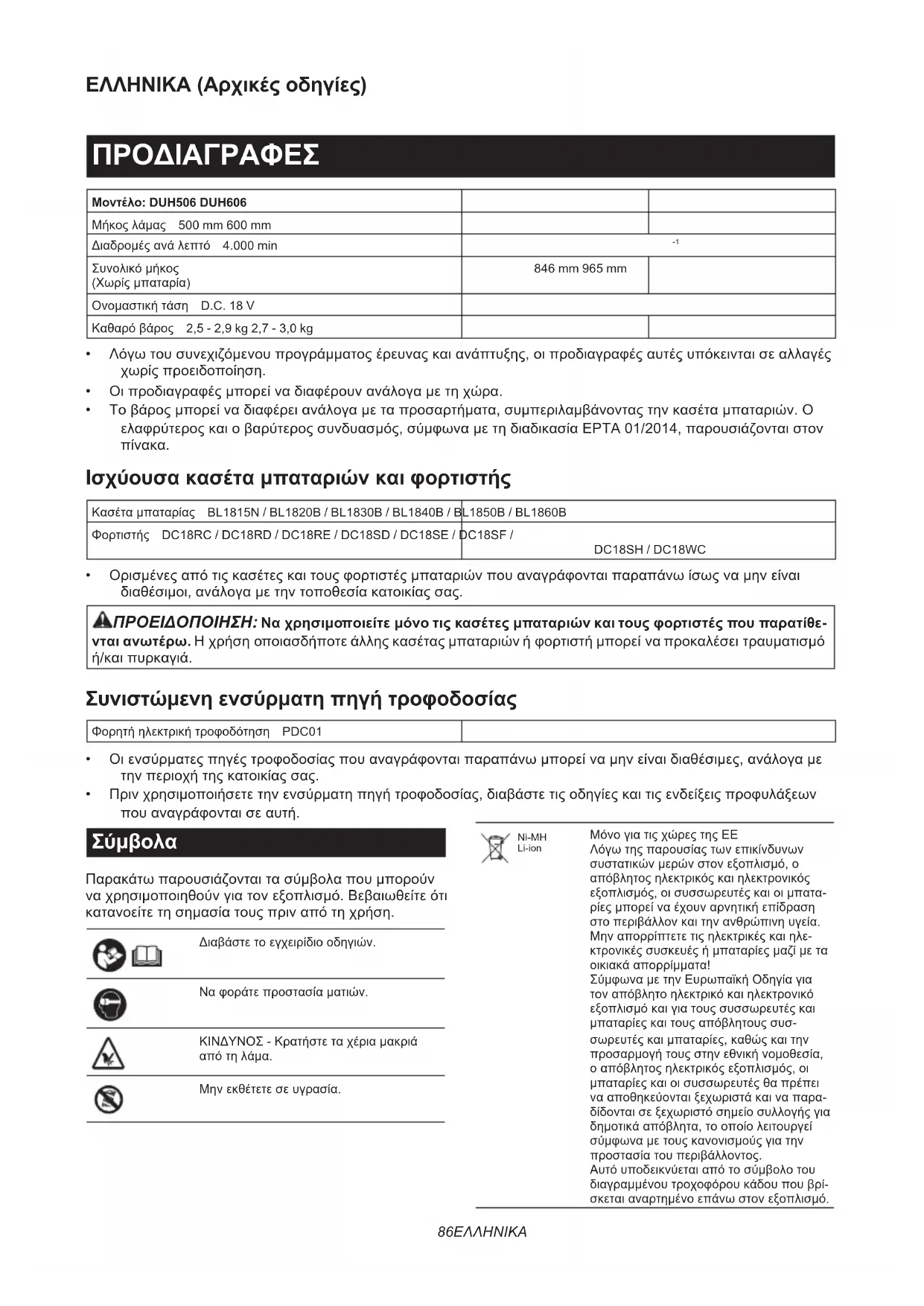 Συνολικόμήκος (Χωρίςμπαταρία) 846 mm 965 mm Ονομαστικήτάση D.C. 18 V Καθαρόβάρος 2,5 - 2,9 kg 2,7 - 3,0 kg