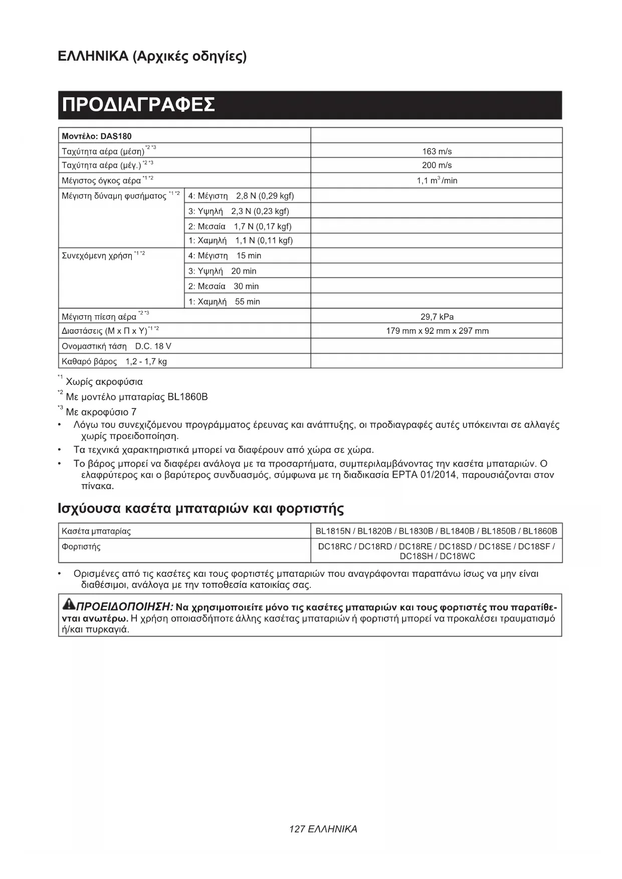 /min Μέγιστηδύναμηφυσήματος *1 *2 4:Μέγιστη 2,8 N (0,29 kgf) 3:Υψηλή 2,3 N (0,23 kgf) 2:Μεσαία 1,7 N (0,17 kgf) 1:Χαμηλή 1,1 N (0,11 kgf) Συνεχόμενηχρήση *1 *2 4:Μέγιστη 15 min 3:Υψηλή 20 min 2:Μεσαία 30 min 1:Χαμηλή 55 min Μέγιστηπίεσηαέρα *2 *3 29,7 kPa Διαστάσεις(ΜxΠxΥ) *1 *2 179 mm x 92 mm x 297 mm Ονομαστικήτάση D.C. 18 V Καθαρόβάρος 1,2 - 1,7 kg