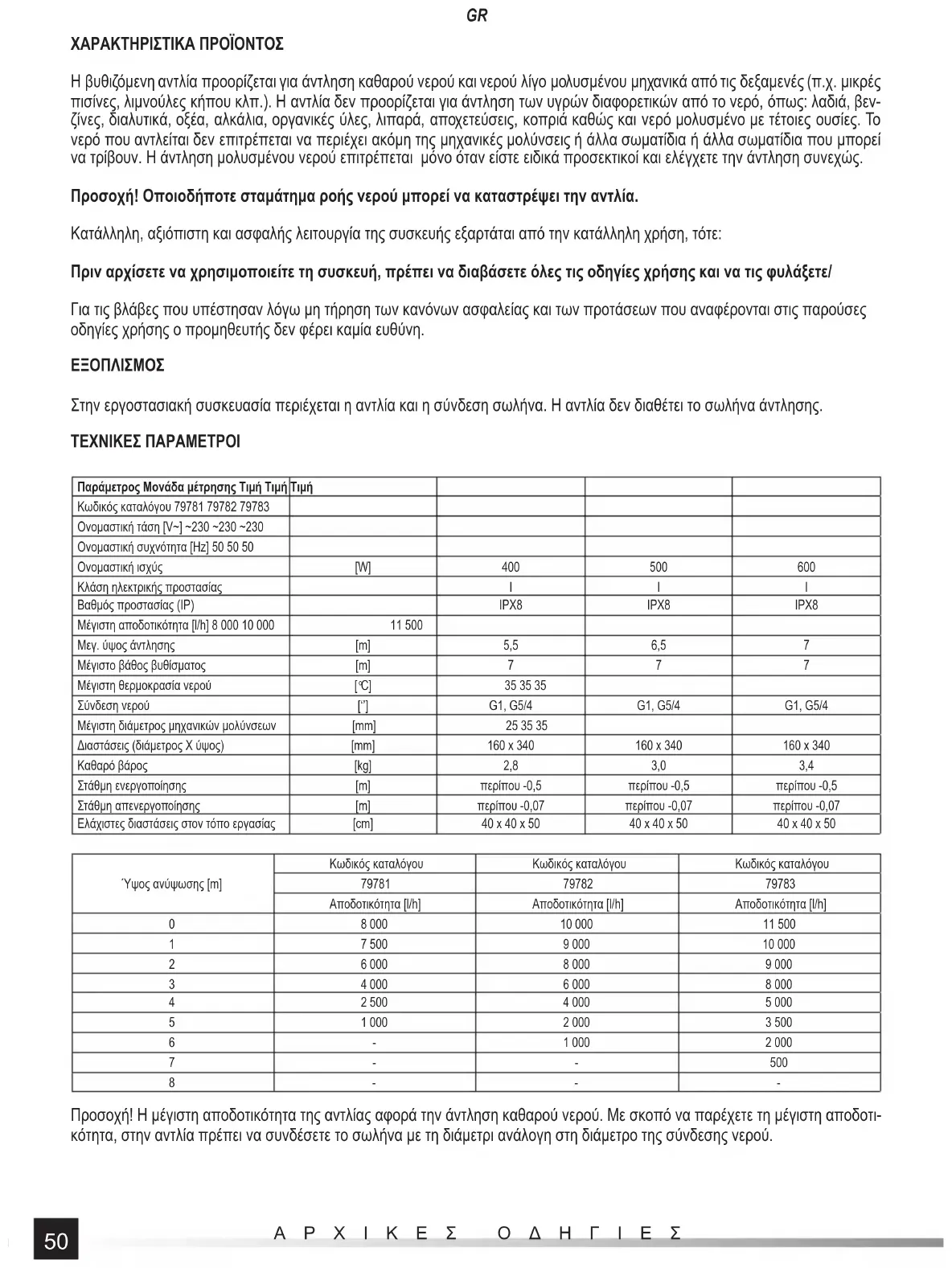 Στην εργοστασιακή συσκευασία περιέχεται η αντλία και η σύνδεση σωλήνα. Η αντλία δεν διαθέτει το σωλήνα άντλησης. ΤΕΧΝΙΚΕΣ ΠΑΡΑΜΕΤΡΟΙ Παράμετρος Μονάδα μέτρησης Τιμή Τιμή Τιμή Κωδικός καταλόγου 79781 79782 79783 Ονομαστική τάση [V~] ~230 ~230 ~230 Ονομαστική συχνότητα [Hz] 50 50 50 Ονομαστική ισχύς [W] 400 500 600 Κλάση ηλεκτρικής προστασίας I I I Βαθμός προστασίας (IP) IPX8 IPX8 IPX8 Μέγιστη αποδοτικότητα [l/h] 8 000 10 000 11 500 Μεγ. ύψος άντλησης [m] 5,5 6,5 7 Μέγιστο βάθος βυθίσματος [m] 7 7 7 Μέγιστη θερμοκρασία νερού [