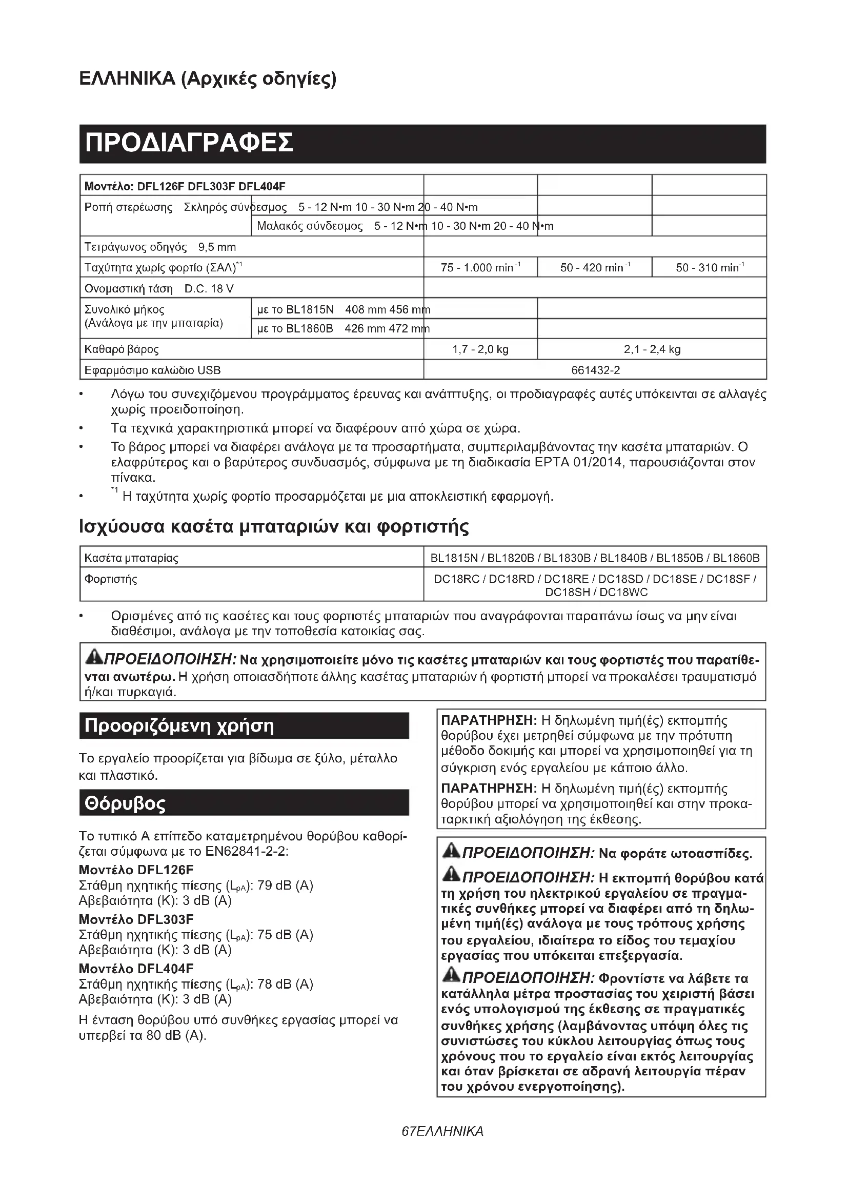 ): 79 dB (A) Αβεβαιότητα(Κ):3dB(A) Μοντέλο DFL303F Στάθμηηχητικήςπίεσης(L