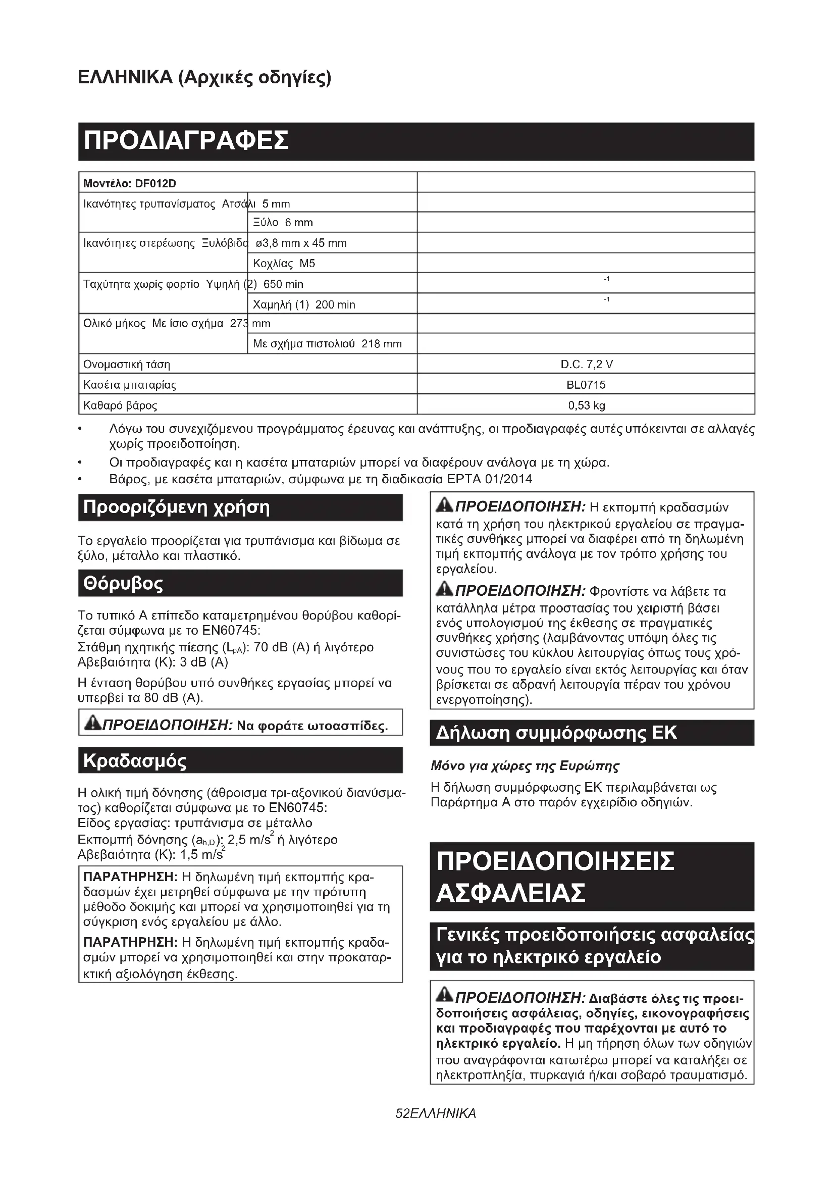 - OriginalMakita-akkuogoplader BEMÆRK:Nogletingpådennelistekanværeinklu- deretiværktøjspakkensomstandardtilbehør.Detkan væreforskelligefralandtilland.52 ΕΛΛΗΝΙΚΑ ΕΛΛΗΝΙΚΑ (Αρχικές οδηγίες) ΠΡΟΔΙΑΓΡΑΦΕΣ Μοντέλο: DF012D Ικανότητεςτρυπανίσματος Ατσάλι 5 mm Ξύλο 6 mm Ικανότητεςστερέωσης Ξυλόβιδα ø3,8mmx45mm Κοχλίας M5 Ταχύτηταχωρίςφορτίο Υψηλή(2) 650 min