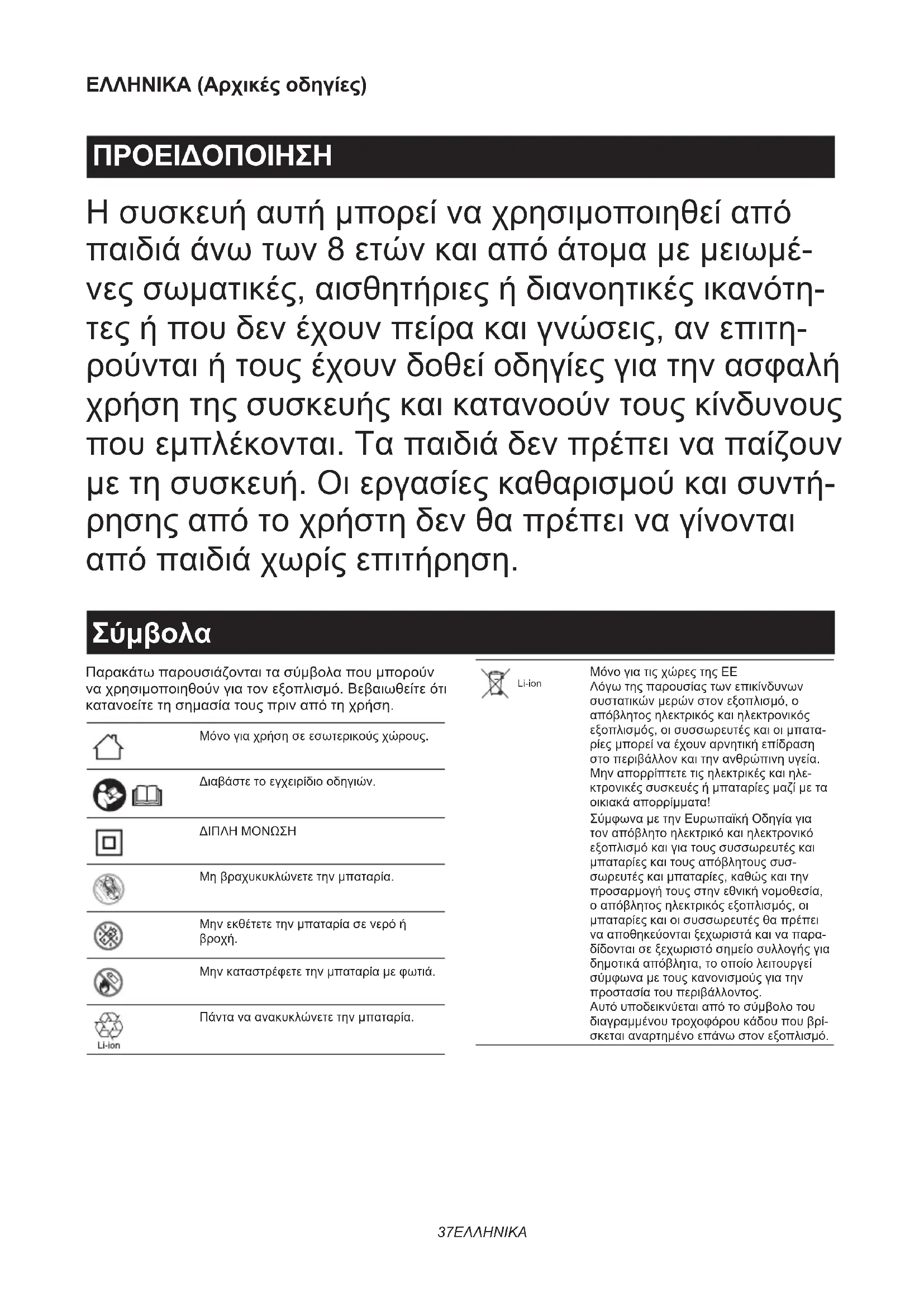► Fig.637 ΕΛΛΗΝΙΚΑ ΕΛΛΗΝΙΚΑ (Αρχικές οδηγίες) ΠΡΟΕΙΔΟΠΟΙΗΣΗ Η συσκευή αυτή μπορεί να χρησιμοποιηθεί από παιδιά άνω των 8 ετών και από άτομα με μειωμέ- νες σωματικές, αισθητήριες ή διανοητικές ικανότη- τες ή που δεν έχουν πείρα και γνώσεις, αν επιτη- ρούνται ή τους έχουν δοθεί οδηγίες για την ασφαλή χρήση της συσκευής και κατανοούν τους κίνδυνους που εμπλέκονται. Τα παιδιά δεν πρέπει να παίζουν με τη συσκευή. Οι εργασίες καθαρισμού και συντή- ρησης από το χρήστη δεν θα πρέπει να γίνονται από παιδιά χωρίς επιτήρηση.