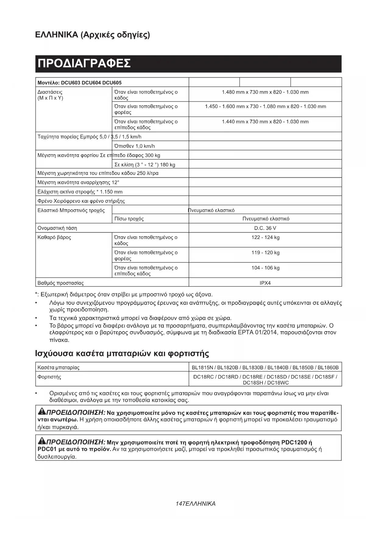 Ταχύτητα πορείας Εμπρός 5,0 / 3,5 / 1,5 km/h Όπισθεν 1,0 km/h Μέγιστη ικανότητα φορτίου Σε επίπεδο έδαφος 300 kg Σε κλίση (3 ° - 12 °) 180 kg Μέγιστη χωρητικότητα του επίπεδου κάδου 250 λίτρα Μέγιστη ικανότητα αναρρίχησης 12° Ελάχιστη ακτίνα στροφής * 1.150 mm Φρένο Χειρόφρενο και φρένο στήριξης Ελαστικό Μπροστινός τροχός Πνευματικό ελαστικό Πίσω τροχός Πνευματικό ελαστικό Ονομαστική τάση D.C. 36 V Καθαρό βάρος Όταν είναι τοποθετημένος ο