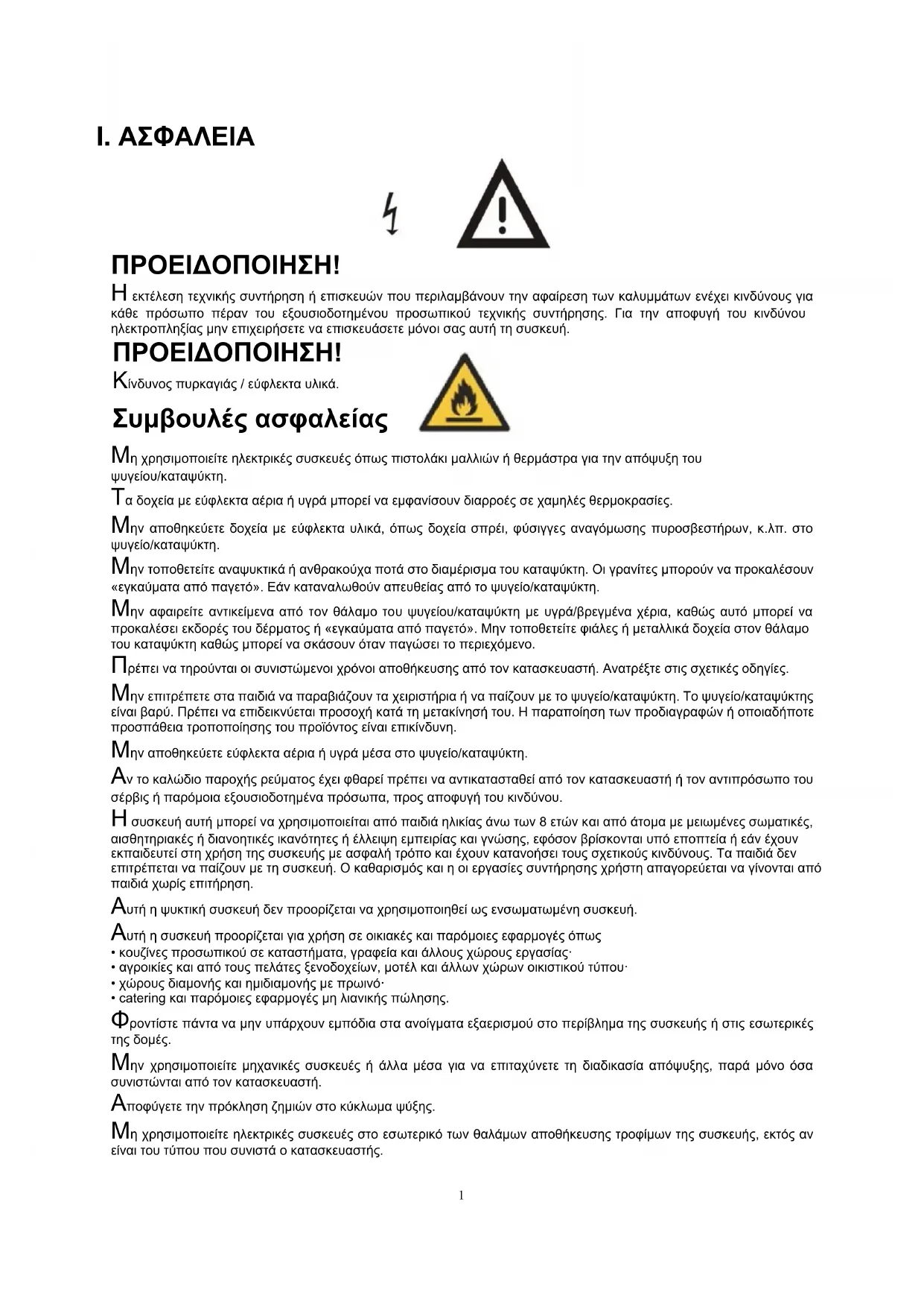 ΠΡΟΕΙΔΟΠΟΙΗΣΗ! Η εκτέλεση τεχνικής συντήρηση ή επισκευών που περιλαμβάνουν την αφαίρεση των καλυμμάτων ενέχει κινδύνους για κάθε πρόσωπο πέραν του εξουσιοδοτημένου προσωπικού τεχνικής συντήρησης. Για την αποφυγή του κινδύνου ηλεκτροπληξίας μην επιχειρήσετε να επισκευάσετε μόνοι σας αυτή τη συσκευή. ΠΡΟΕΙΔΟΠΟΙΗΣΗ! Κίνδυνος πυρκαγιάς / εύφλεκτα υλικά. Συμβουλές ασφαλείας Μη χρησιμοποιείτε ηλεκτρικές συσκευές όπως πιστολάκι μαλλιών ή θερμάστρα για την απόψυξη του ψυγείου/καταψύκτη. Τα δοχεία με εύφλεκτα αέρια ή υγρά μπορεί να εμφανίσουν διαρροές σε χαμηλές θερμοκρασίες. Μην αποθηκεύετε δοχεία με εύφλεκτα υλικά, όπως δοχεία σπρέι, φύσιγγες αναγόμωσης πυροσβεστήρων, κ.λπ. στο ψυγείο/καταψύκτη. Μην τοποθετείτε αναψυκτικά ή ανθρακούχα ποτά στο διαμέρισμα του καταψύκτη. Οι γρανίτες μπορούν να προκαλέσουν «εγκαύματα από παγετό». Εάν καταναλωθούν απευθείας από το ψυγείο/καταψύκτη. Μην αφαιρείτε αντικείμενα από τον θάλαμο του ψυγείου/καταψύκτη με υγρά/βρεγμένα χέρια, καθώς αυτό μπορεί να προκαλέσει εκδορές του δέρματος ή «εγκαύματα από παγετό». Μην τοποθετείτε φιάλες ή μεταλλικά δοχεία στον θάλαμο του καταψύκτη καθώς μπορεί να σκάσουν όταν παγώσει το περιεχόμενο. Πρέπει να τηρούνται οι συνιστώμενοι χρόνοι αποθήκευσης από τον κατασκευαστή. Ανατρέξτε στις σχετικές οδηγίες. Μην επιτρέπετε στα παιδιά να παραβιάζουν τα χειριστήρια ή να παίζουν με το ψυγείο/καταψύκτη. Το ψυγείο/καταψύκτης είναι βαρύ. Πρέπει να επιδεικνύεται προσοχή κατά τη μετακίνησή του. Η παραποίηση των προδιαγραφών ή οποιαδήποτε προσπάθεια τροποποίησης του προϊόντος είναι επικίνδυνη. Μην αποθηκεύετε εύφλεκτα αέρια ή υγρά μέσα στο ψυγείο/καταψύκτη. Αν το καλώδιο παροχής ρεύματος έχει φθαρεί πρέπει να αντικατασταθεί από τον κατασκευαστή ή τον αντιπρόσωπο του σέρβις ή παρόμοια εξουσιοδοτημένα πρόσωπα, προς αποφυγή του κινδύνου. Η συσκευή αυτή μπορεί να χρησιμοποιείται από παιδιά ηλικίας άνω των 8 ετών και από άτομα με μειωμένες σωματικές, αισθητηριακές ή διανοητικές ικανότητες ή έλλειψη εμπειρίας και γνώσης, εφόσον βρίσκονται υπό εποπτεία ή εάν έχουν εκπαιδευτεί στη χρήση της συσκευής με ασφαλή τρόπο και έχουν κατανοήσει τους σχετικούς κινδύνους. Τα παιδιά δεν επιτρέπεται να παίζουν με τη συσκευή. Ο καθαρισμός και η οι εργασίες συντήρησης χρήστη απαγορεύεται να γίνονται από παιδιά χωρίς επιτήρηση. Αυτή η ψυκτική συσκευή δεν προορίζεται να χρησιμοποιηθεί ως ενσωματωμένη συσκευή. Αυτή η συσκευή προορίζεται για χρήση σε οικιακές και παρόμοιες εφαρμογές όπως