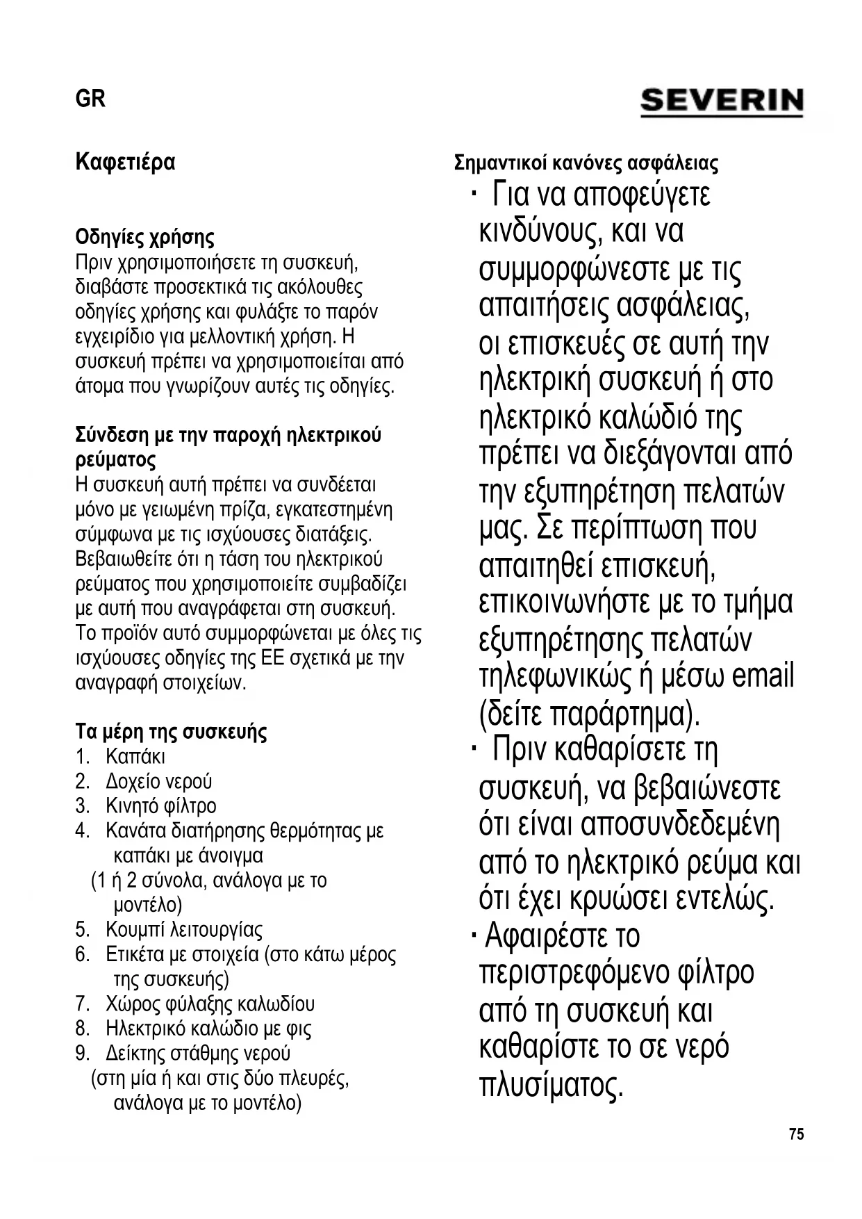 (στημίαήκαιστιςδύοπλευρές, ανάλογαμετομοντέλο) Σημαντικοί κανόνες ασφάλειας ∙ Γιανααποφεύγετε κινδύνους,καινα συμμορφώνεστεμετις απαιτήσειςασφάλειας, οιεπισκευέςσεαυτήτην ηλεκτρικήσυσκευήήστο ηλεκτρικόκαλώδιότης πρέπειναδιεξάγονταιαπό τηνεξυπηρέτησηπελατών μας.Σεπερίπτωσηπου απαιτηθείεπισκευή, επικοινωνήστεμετοτμήμα εξυπηρέτησηςπελατών τηλεφωνικώςήμέσωemail (δείτεπαράρτημα). ∙ Πρινκαθαρίσετετη συσκευή,ναβεβαιώνεστε ότιείναιαποσυνδεδεμένη απότοηλεκτρικόρεύμακαι ότιέχεικρυώσειεντελώς. ∙ Αφαιρέστετο περιστρεφόμενοφίλτρο απότησυσκευήκαι καθαρίστετοσενερό πλυσίματος. GR76 104 x 142 mm ∙ Μετάτηχρήση,ξεπλύνετε τοεσωτερικότηςκανάτας καισκουπίστετοεξωτερικό τηςμεέναυγρόπανί. ∙ Γιααναλυτικές πληροφορίεςγιατον καθαρισμότηςσυσκευής, ανατρέξτεστηνπαράγραφο «Γενικός καθαρισμός και
