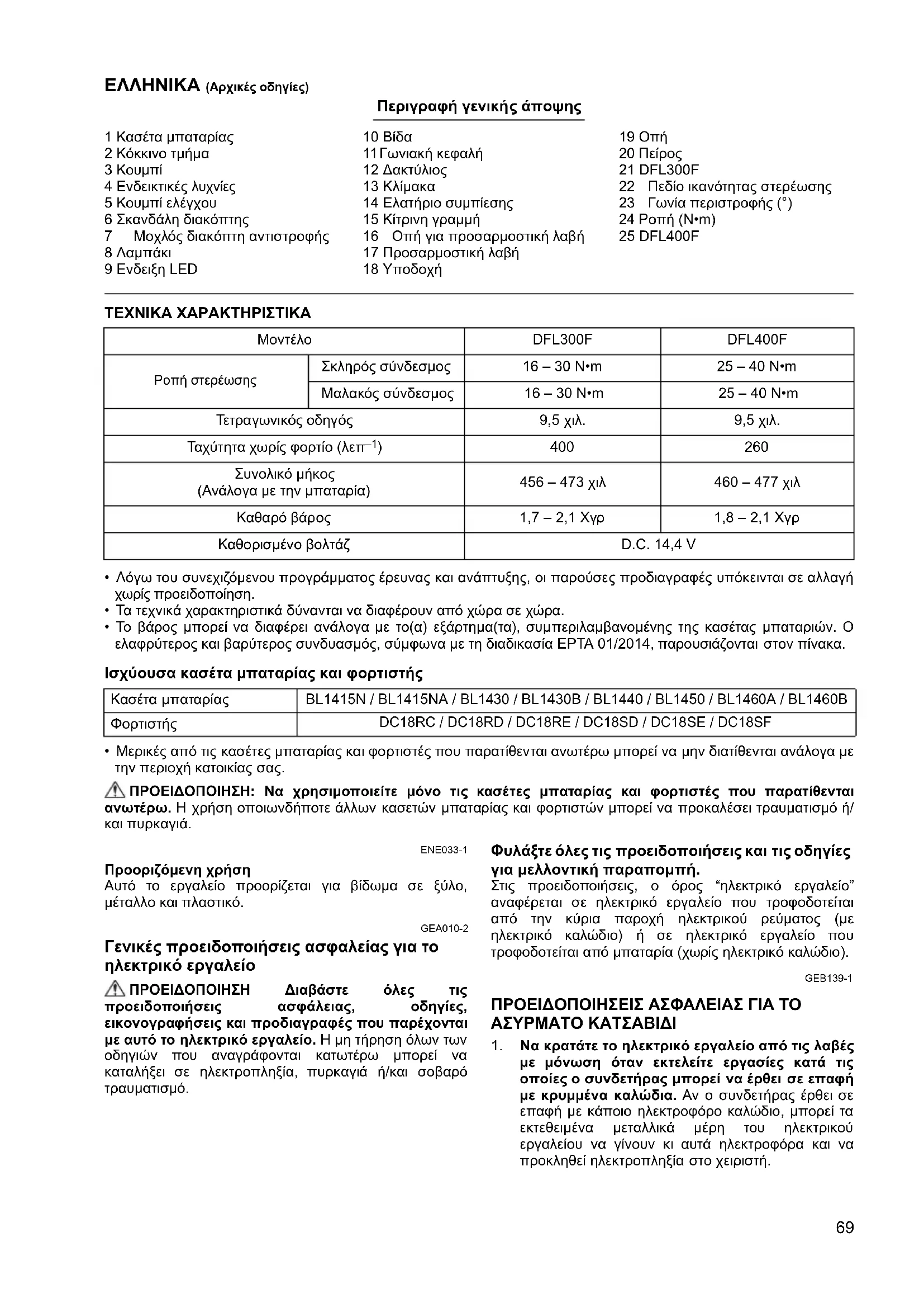 - Selvitä käyttäjän suojaamiseksi tarvittavat varotoimet todellisissa käyttöolosuhteissa tapahtuvan arvioidun altistumisen mukaisesti (ottaen huomioon käyttöjakso kokonaisuudessaan, myös jaksot, joiden aikana laite on sammutettuna tai käy tyhjäkäynnillä).68 EY-VAATIMUSTENMUKAISUUSVAKUUTUS Koskee vain Euroopan maita EY-vaatimustenmukaisuusvakuutus sisältyy tämän käyttöoppaan liitteeseen A.69 ΕΛΛΗΝΙΚΑ (Αρχικές οδηγίες) Περιγραφή γενικής άποψης 1 Κασέτα μπαταρίας 2 Κόκκινο τμήμα 3 Κουμπί 4 Ενδεικτικές λυχνίες 5 Κουμπί ελέγχου 6 Σκανδάλη διακόπτης 7 Μοχλός διακόπτη αντιστροφής 8 Λαμπάκι 9 Ενδειξη LED 10 Βίδα 11 Γωνιακή κεφαλή 12 Δακτύλιος 13 Κλίμακα 14 Ελατήριο συμπίεσης 15 Κίτρινη γραμμή 16 Οπή για προσαρμοστική λαβή 17 Προσαρμοστική λαβή 18 Υποδοχή 19 Οπή 20 Πείρος 21 DFL300F 22 Πεδίο ικανότητας στερέωσης 23 Γωνία περιστροφής (°) 24 Ροπή (N•m) 25 DFL400F ΤΕΧΝΙΚΑ ΧΑΡΑΚΤΗΡΙΣΤΙΚΑ