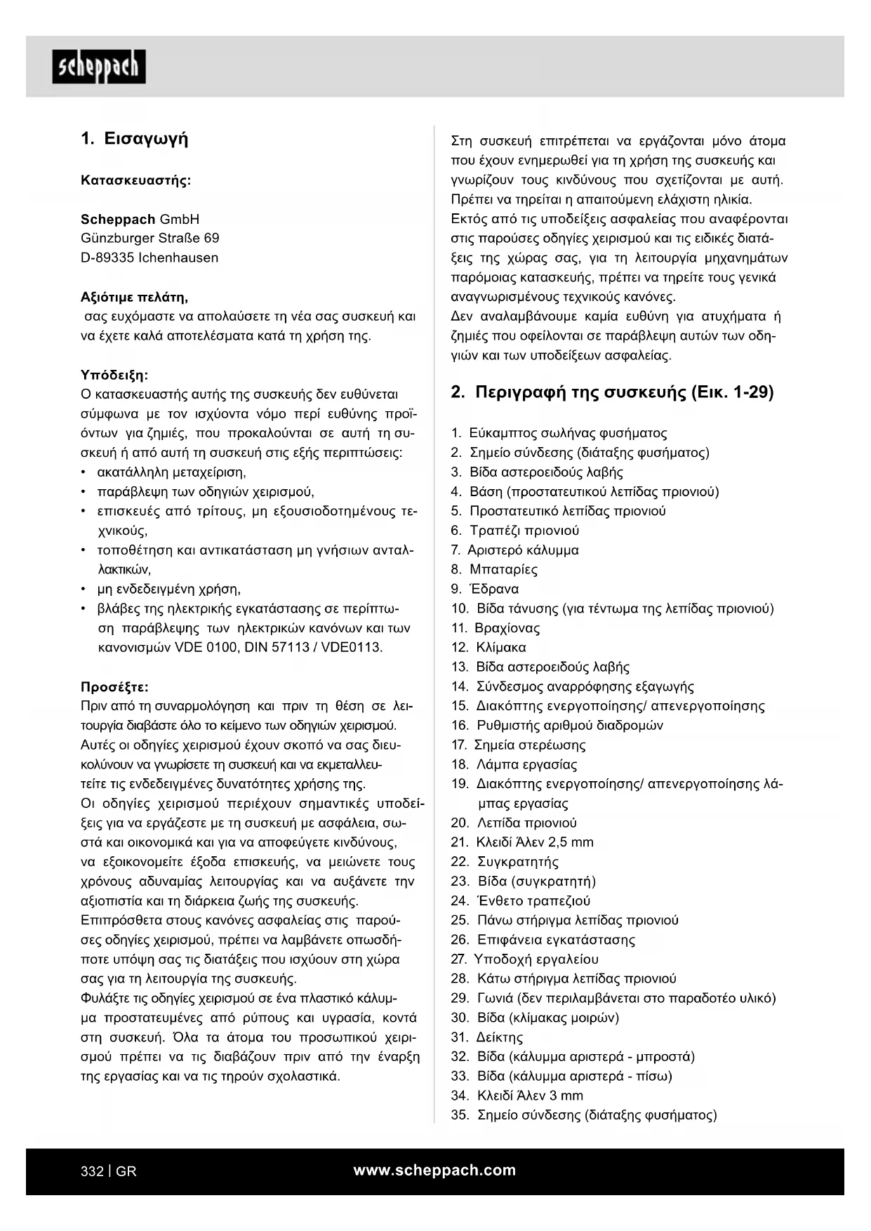 Πριν από τη συναρμολόγηση και πριν τη θέση σε λει- τουργία διαβάστε όλο το κείμενο των οδηγιών χειρισμού. Αυτές οι οδηγίες χειρισμού έχουν σκοπό να σας διευ- κολύνουν να γνωρίσετε τη συσκευή και να εκμεταλλευ- τείτε τις ενδεδειγμένες δυνατότητες χρήσης της. Οι οδηγίες χειρισμού περιέχουν σημαντικές υποδεί- ξεις για να εργάζεστε με τη συσκευή με ασφάλεια, σω- στά και οικονομικά και για να αποφεύγετε κινδύνους, να εξοικονομείτε έξοδα επισκευής, να μειώνετε τους χρόνους αδυναμίας λειτουργίας και να αυξάνετε την αξιοπιστία και τη διάρκεια ζωής της συσκευής. Επιπρόσθετα στους κανόνες ασφαλείας στις παρού- σες οδηγίες χειρισμού, πρέπει να λαμβάνετε οπωσδή- ποτε υπόψη σας τις διατάξεις που ισχύουν στη χώρα σας για τη λειτουργία της συσκευής. Φυλάξτε τις οδηγίες χειρισμού σε ένα πλαστικό κάλυμ- μα προστατευμένες από ρύπους και υγρασία, κοντά στη συσκευή. Όλα τα άτομα του προσωπικού χειρι- σμού πρέπει να τις διαβάζουν πριν από την έναρξη της εργασίας και να τις τηρούν σχολαστικά.www.scheppach.com