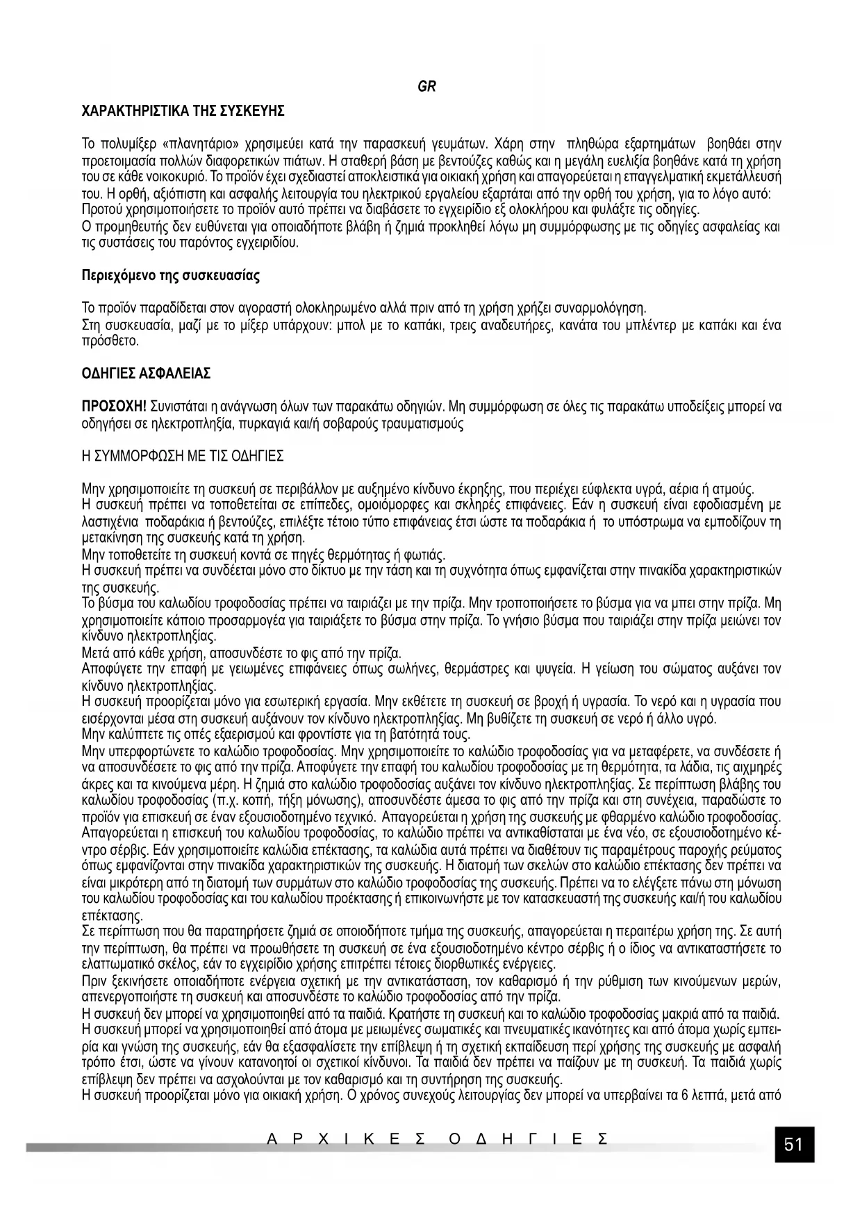 Σε περίπτωση που θα παρατηρήσετε ζημιά σε οποιοδήποτε τμήμα της συσκευής, απαγορεύεται η περαιτέρω χρήση της. Σε αυτή την περίπτωση, θα πρέπει να προωθήσετε τη συσκευή σε ένα εξουσιοδοτημένο κέντρο σέρβις ή ο ίδιος να αντικαταστήσετε το ελαττωματικό σκέλος, εάν το εγχειρίδιο χρήσης επιτρέπει τέτοιες διορθωτικές ενέργειες. Πριν ξεκινήσετε οποιαδήποτε ενέργεια σχετική με την αντικατάσταση, τον καθαρισμό ή την ρύθμιση των κινούμενων μερών, απενεργοποιήστε τη συσκευή και αποσυνδέστε το καλώδιο τροφοδοσίας από την πρίζα. Η συσκευή δεν μπορεί να χρησιμοποιηθεί από τα παιδιά. Κρατήστε τη συσκευή και το καλώδιο τροφοδοσίας μακριά από τα παιδιά. Η συσκευή μπορεί να χρησιμοποιηθεί από άτομα με μειωμένες σωματικές και πνευματικές ικανότητες και από άτομα χωρίς εμπει- ρία και γνώση της συσκευής, εάν θα εξασφαλίσετε την επίβλεψη ή τη σχετική εκπαίδευση περί χρήσης της συσκευής με ασφαλή τρόπο έτσι, ώστε να γίνουν κατανοητοί οι σχετικοί κίνδυνοι. Τα παιδιά δεν πρέπει να παίζουν με τη συσκευή. Τα παιδιά χωρίς επίβλεψη δεν πρέπει να ασχολούνται με τον καθαρισμό και τη συντήρηση της συσκευής. Η συσκευή προορίζεται μόνο για οικιακή χρήση. Ο χρόνος συνεχούς λειτουργίας δεν μπορεί να υπερβαίνει τα 6 λεπτά, μετά από52 ΑΡΧΙΚΕΣ ΟΔΗΓΙΕΣ