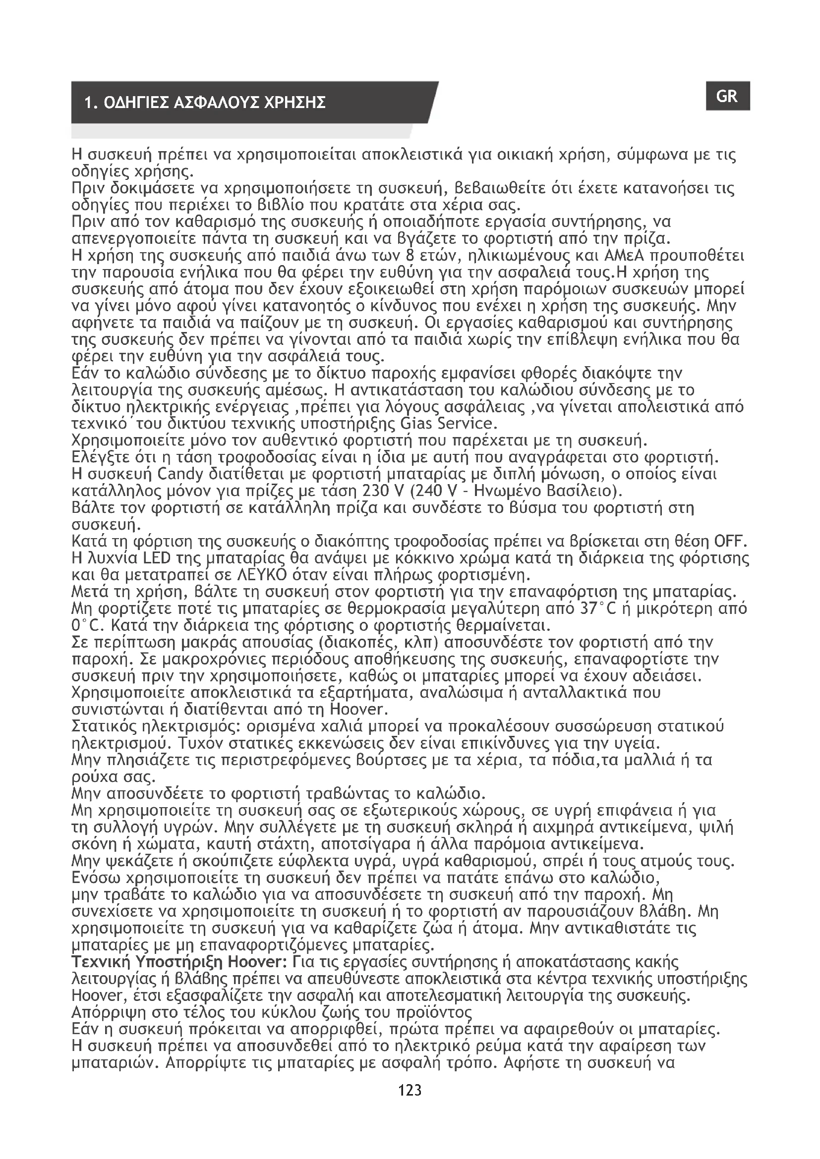 H συσκευή πρέπει να χρησιμοποιείται αποκλειστικά για οικιακή χρήση, σύμφωνα με τις οδηγίες χρήσης. Πριν δοκιμάσετε να χρησιμοποιήσετε τη συσκευή, βεβαιωθείτε ότι έχετε κατανοήσει τις οδηγίες που περιέχει το βιβλίο που κρατάτε στα χέρια σας. Πριν από τον καθαρισμό της συσκευής ή οποιαδήποτε εργασία συντήρησης, να απενεργοποιείτε πάντα τη συσκευή και να βγάζετε το φορτιστή από την πρίζα. Η χρήση της συσκευής από παιδιά άνω των 8 ετών, ηλικιωμένους και ΑΜεΑ προυποθέτει την παρουσία ενήλικα που θα φέρει την ευθύνη για την ασφαλειά τους.Η χρήση της συσκευής από άτομα που δεν έχουν εξοικειωθεί στη χρήση παρόμοιων συσκευών μπορεί να γίνει μόνο αφού γίνει κατανοητός ο κίνδυνος που ενέχει η χρήση της συσκευής. Μην αφήνετε τα παιδιά να παίζουν με τη συσκευή. Οι εργασίες καθαρισμού και συντήρησης της συσκευής δεν πρέπει να γίνονται από τα παιδιά χωρίς την επίβλεψη ενήλικα που θα φέρει την ευθύνη για την ασφάλειά τους. Εάν το καλώδιο σύνδεσης με το δίκτυο παροχής εμφανίσει φθορές διακόψτε την λειτουργία της συσκευής αμέσως. Η αντικατάσταση του καλώδιου σύνδεσης με το δίκτυο ηλεκτρικής ενέργειας ,πρέπει για λόγους ασφάλειας ,να γίνεται απολειστικά από τεχνικό΄του δικτύου τεχνικής υποστήριξης Gias Service. Χρησιμοποιείτε μόνο τον αυθεντικό φορτιστή που παρέχεται με τη συσκευή. Ελέγξτε ότι η τάση τροφοδοσίας είναι η ίδια με αυτή που αναγράφεται στο φορτιστή. Η συσκευή Candy διατίθεται με φορτιστή μπαταρίας με διπλή μόνωση, ο οποίος είναι κατάλληλος μόνον για πρίζες με τάση 230 V (240 V - Ηνωμένο Βασίλειο). Βάλτε τον φορτιστή σε κατάλληλη πρίζα και συνδέστε το βύσμα του φορτιστή στη