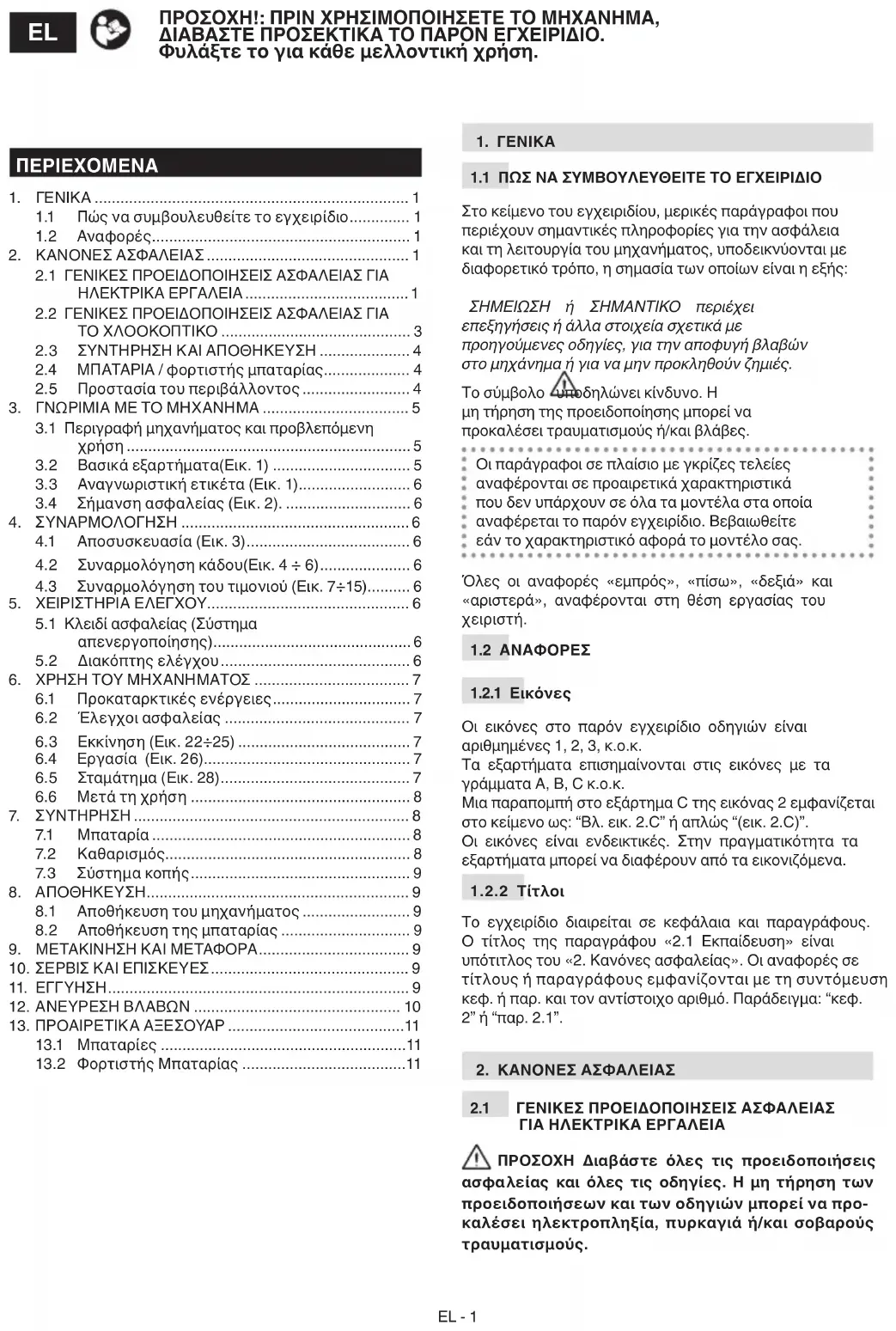 κτρικού εργαλείου a) Μην υπερφορτώνετε το ηλεκτρικό εργαλείο. Χρη- σιμοποιείτε το κατάλληλο ηλεκτρικό εργαλείο για κάθε εργασία. Το κατάλληλο ηλεκτρικό εργαλείο εκτελεί καλύτερα και ασφαλέστερα την εργασία, με την ταχύτητα για την οποία έχει σχεδιαστεί. b) Μη χρησιμοποιείτε το ηλεκτρικό εργαλείο εάν δεν τίθεται σε λειτουργία και δεν ακινητοποιείται ομαλά με το διακόπτη. Ένα ηλεκτρικό εργαλείο που δεν ελέγ- χεται με το διακόπτη είναι επικίνδυνο και απαιτεί επισκευή. c) Αφαιρέστε τον συσσωρευτή από την θέση του πριν από κάθε ρύθμιση ή αντικατάσταση εξαρτημά- των και πριν φυλάξετε το ηλεκτρικό εργαλείο. Αυτά τα προληπτικά μέτρα ασφαλείας μειώνουν τον κίνδυνο τυ- χαίας εκκίνησης του ηλεκτρικού εργαλείου. d) Φυλάξτε τα εργαλεία που δεν χρησιμοποιείτε μακριά από παιδιά και μην επιτρέπετε τη χρήση του ηλεκτρικού εργαλείου σε άτομα που δεν έχουν εξοι- κειωθεί με το εργαλείο και δεν έχουν μελετήσει τις παρούσες τις οδηγίες. Τα ηλεκτρικά εργαλεία είναι επι- κίνδυνα στα χέρια άπειρων χρηστών. e) Φροντίζετε πάντα για τη συντήρηση των ηλεκτρι- κών εργαλείων. Να ελέγχετε εάν τα κινητά μέρη είναι ευθυγραμμισμένα και κινούνται ελεύθερα, και βεβαιωθείτε ότι δεν υπάρχουν βλάβες εξαρτημάτων ή οποιαδήποτε άλλη συνθήκη που μπορεί να επηρε- άσει τη λειτουργία του μηχανήματος. Σε περίπτωση βλάβης, το ηλεκτρικό εργαλείο πρέπει να επισκευ- αστεί πριν χρησιμοποιηθεί. Πολλά ατυχήματα οφείλο- νται σε κακή συντήρηση. f) Διατηρείτε τροχισμένα και καθαρά τα όργανα κο- πής. Η σωστή συντήρηση των οργάνων κοπής με καλάEL - 3 τροχισμένα δόντια, μειώνει την πιθανότητα εμπλοκής και καθιστά ευκολότερο τον έλεγχο. g) Να χρησιμοποιείτε το ηλεκτρικό εργαλείο και τα σχετικά εξαρτήματα σύμφωνα με τις οδηγίες που παρέχονται, λαμβάνοντας υπόψη τις συνθήκες ερ- γασίας και τον τύπο εργασίας που απαιτείται. Η χρή- ση ενός ηλεκτρικού εργαλείου για εργασίες διαφορετικές από τις προβλεπόμενες μπορεί να προκαλέσει καταστά- σεις κινδύνου. h) Διατηρείτε πάντα τις χειρολαβές στεγνές, κα- θαρές και χωρίς ίχνη λαδιού ή γράσου. Οι γλιστερές χειρολαβές δεν βοηθούν στον ασφαλή χειρισμό και έλεγχο του εργαλείου σε απρόβλεπτες καταστάσεις.