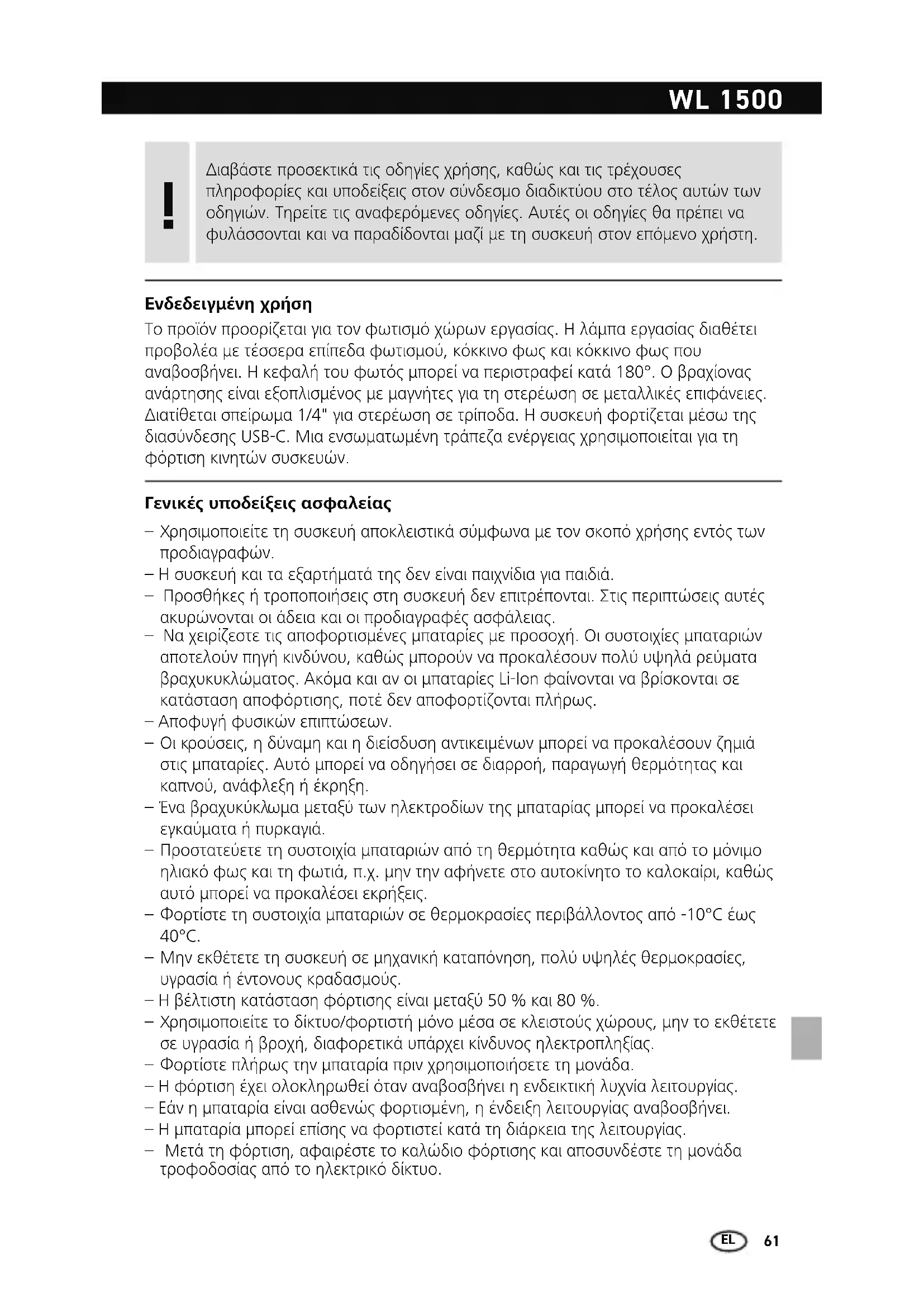 Ενδεδειγμένη χρήση Το προϊόν προορίζεται για τον φωτισμό χώρων εργασίας. Η λάμπα εργασίας διαθέτει προβολέα με τέσσερα επίπεδα φωτισμού, κόκκινο φως και κόκκινο φως που αναβοσβήνει. Η κεφαλή του φωτός μπορεί να περιστραφεί κατά 180°. Ο βραχίονας ανάρτησης είναι εξοπλισμένος με μαγνήτες για τη στερέωση σε μεταλλικές επιφάνειες. Διατίθεται σπείρωμα 1/4" για στερέωση σε τρίποδα. Η συσκευή φορτίζεται μέσω της διασύνδεσης USB-C. Μια ενσωματωμένη τράπεζα ενέργειας χρησιμοποιείται για τη φόρτιση κινητών συσκευών. Γενικές υποδείξεις ασφαλείας