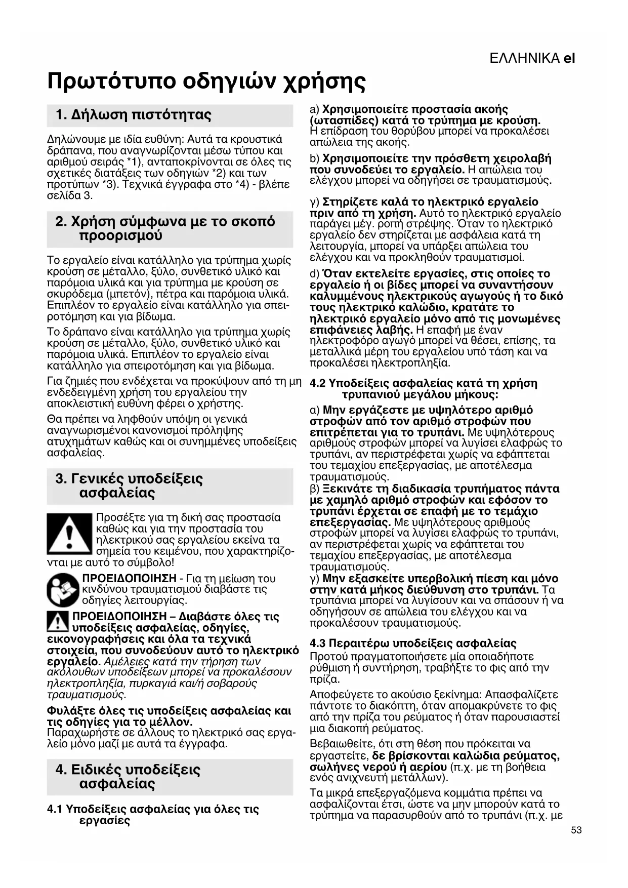 Πρωτότυπο οδηγιών χρήσης Δηλώνουμε με ιδία ευθύνη: Αυτά τα κρουστικά δράπανα, που αναγνωρίζονται μέσω τύπου και αριθμού σειράς *1), ανταποκρίνονται σε όλες τις σχετικές διατάξεις των οδηγιών *2) και των προτύπων *3). Τεχνικά έγγραφα στο *4) - βλέπε σελίδα 3. Το εργαλείο είναι κατάλληλο για τρύπημα χωρίς κρούση σε μέταλλο, ξύλο, συνθετικό υλικό και παρόμοια υλικά και για τρύπημα με κρούση σε σκυρόδεμα (μπετόν), πέτρα και παρόμοια υλικά. Επιπλέον το εργαλείο είναι κατάλληλο για σπει- ροτόμηση και για βίδωμα. Το δράπανο είναι κατάλληλο για τρύπημα χωρίς κρούση σε μέταλλο, ξύλο, συνθετικό υλικό και παρόμοια υλικά. Επιπλέον το εργαλείο είναι κατάλληλο για σπειροτόμηση και για βίδωμα. Για ζημιές που ενδέχεται να προκύψουν από τη μη ενδεδειγμένη χρήση του εργαλείου την αποκλειστική ευθύνη φέρει ο χρήστης. Θα πρέπει να ληφθούν υπόψη οι γενικά αναγνωρισμένοι κανονισμοί πρόληψης ατυχημάτων καθώς και οι συνημμένες υποδείξεις
