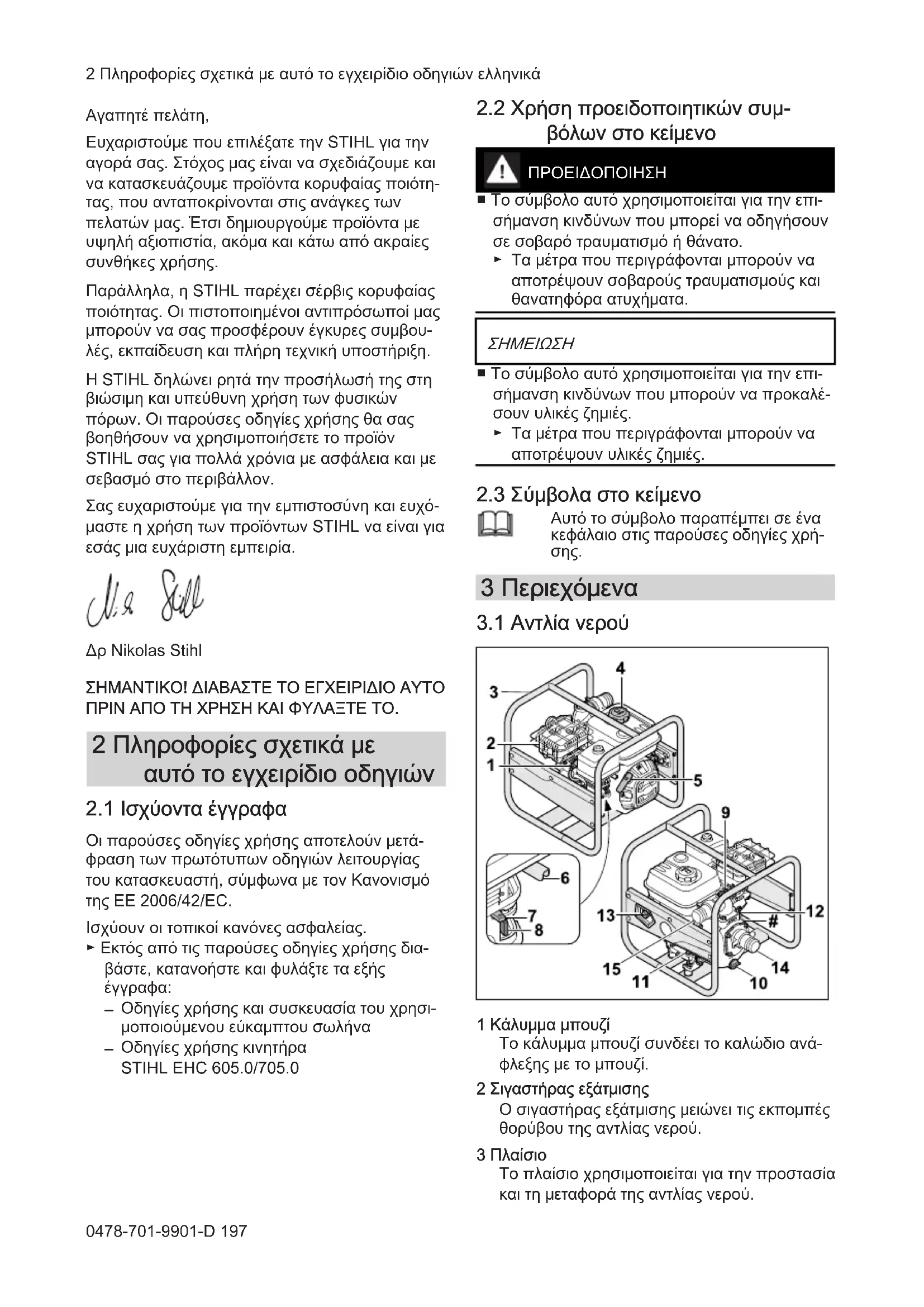 - 22 Πιστοποιητικό συμβατότητας UKCA 1 Πρόλογος ελληνικά 22 Pernyataan kesesuaian UKCA 196 0478-701-9901-D © ANDREAS STIHL AG & Co. KG 2023 0478-701-9901-D. VA0.C23. Τυπώθηκε σε χαρτί λευκασμένο χωρίς χλώριο. Το χαρτί είναι ανακυκλώσιμο. Μετάφραση του αρχικού εγχειριδίου οδηγιών 0000010020_014_GRΑγαπητέ πελάτη, Ευχαριστούμε που επιλέξατε την STIHL για την αγορά σας. Στόχος μας είναι να σχεδιάζουμε και να κατασκευάζουμε προϊόντα κορυφαίας ποιότη‐ τας, που ανταποκρίνονται στις ανάγκες των πελατών μας. Έτσι δημιουργούμε προϊόντα με υψηλή αξιοπιστία, ακόμα και κάτω από ακραίες συνθήκες χρήσης. Παράλληλα, η STIHL παρέχει σέρβις κορυφαίας ποιότητας. Οι πιστοποιημένοι αντιπρόσωποί μας μπορούν να σας προσφέρουν έγκυρες συμβου‐ λές, εκπαίδευση και πλήρη τεχνική υποστήριξη. Η STIHL δηλώνει ρητά την προσήλωσή της στη βιώσιμη και υπεύθυνη χρήση των φυσικών πόρων. Οι παρούσες οδηγίες χρήσης θα σας βοηθήσουν να χρησιμοποιήσετε το προϊόν STIHL σας για πολλά χρόνια με ασφάλεια και με σεβασμό στο περιβάλλον. Σας ευχαριστούμε για την εμπιστοσύνη και ευχό‐ μαστε η χρήση των προϊόντων STIHL να είναι για εσάς μια ευχάριστη εμπειρία. Δρ Nikolas Stihl ΣΗΜΑΝΤΙΚΟ! ΔΙΑΒΑΣΤΕ ΤΟ ΕΓΧΕΙΡΙΔΙΟ ΑΥΤΟ ΠΡΙΝ ΑΠΟ ΤΗ ΧΡΗΣΗ ΚΑΙ ΦΥΛΑΞΤΕ ΤΟ. 2 Πληροφορίες σχετικά με αυτό το εγχειρίδιο οδηγιών p. 212