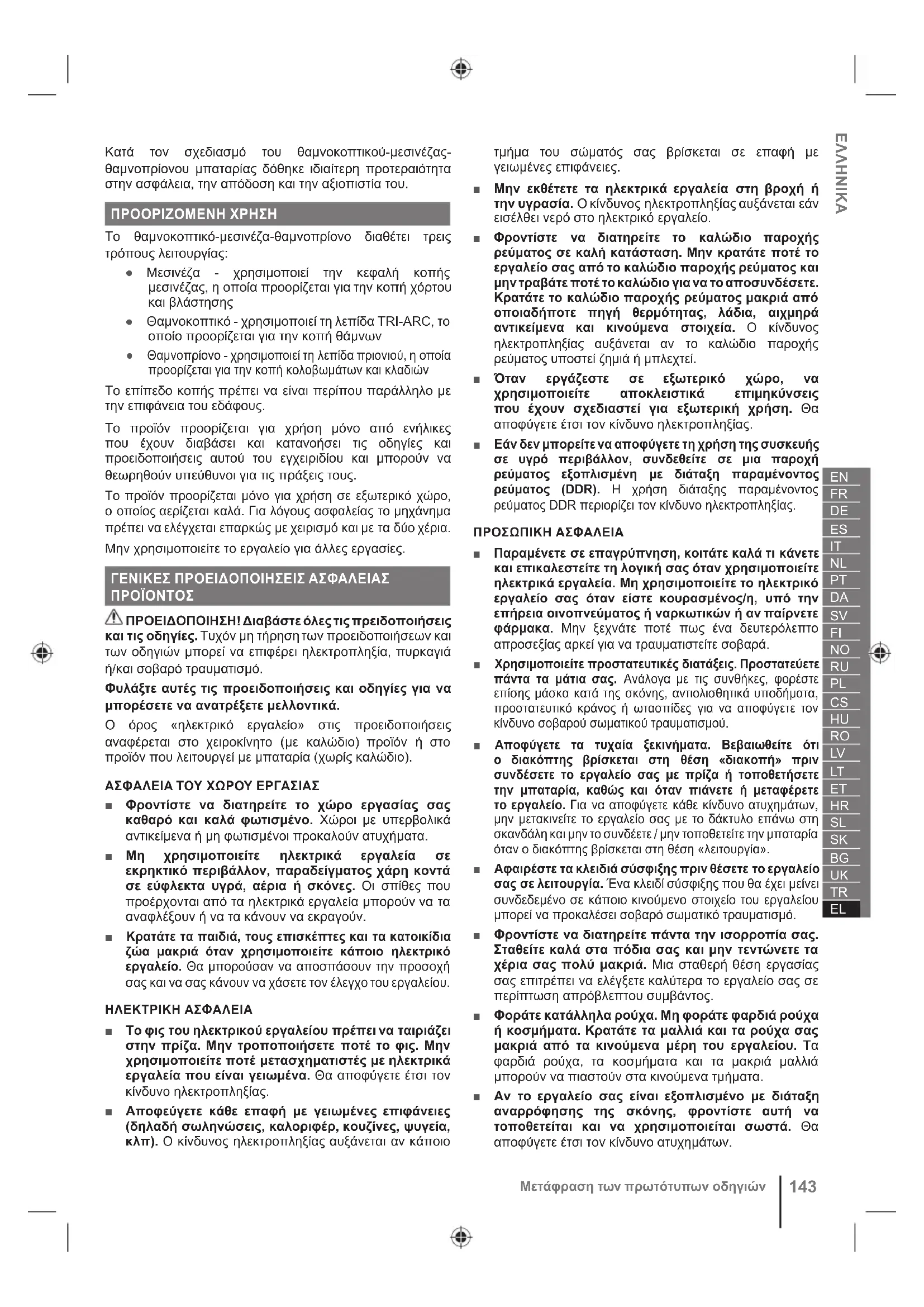 ■ Οι επιδιορθώσεις πρέπει να πραγματοποιούνται από ειδικευμένο τεχνικό και μόνο με γνήσια ανταλλακτικά. Θα μπορείτε έτσι να χρησιμοποιήσετε το ηλεκτρικό σας εργαλείο με πλήρη ασφάλεια. ■ Ποτέ μην επισκευάζετε μπαταρίες που φέρουν φθορές. Η επισκευή των μπαταριών πρέπει να πραγματοποιείται μόνο από τον κατασκευαστή ή εξουσιοδοτημένους παροχείς σέρβις. ΠΡΟΕΙΔΟΠΟΙΗΣΕΙΣ ΑΣΦΑΛΕΙΑΣ ΘΑΜΝΟΚΟΠΤΙΚΟΥ-ΜΕΣΙΝΕΖΑΣ-ΘΑΜΝΟΠΡΙΟΝΟΥ ■ Αποφύγετε την χρήση του μηχανήματος σε κακές καιρικές συνθήκες, ιδίως όταν υπάρχει κίνδυνος κεραυνών. Αυτό μειώνει τον κίνδυνο να χτυπηθείτε από κεραυνό. ■ Επιθεωρήστε ενδελεχώς τον χώρο στον οποίο πρόκειται να χρησιμοποιηθεί το μηχάνημα για τυχόν άγρια ζώα. Μπορεί να υποστούν τραυματισμό κατά τη λειτουργία του μηχανήματος. ■ Ελέγξτε προσεκτικά την περιοχή, στην οποία πρόκειται να χρησιμοποιηθεί το μηχάνημα και απομακρύνετε τυχόν πέτρες, κλαδιά, μέταλλα, καλώδια, οστά, παιχνίδια ή άλλα ξένα αντικείμενα. Τυχόν εκτοξευόμενα αντικείμενα μπορεί να προκαλέσουν ατομικό τραυματισμό. ■ Πριν χρησιμοποιήσετε το μηχάνημα, ελέγχετε πάντα οπτικά για να βεβαιωθείτε ότι ο κόφτης ή το μαχαίρι δεν έχει υποστεί ζημιά. Τα μέρη με ζημιές αυξάνουν τον κίνδυνο τραυματισμού. ■ Ακολουθήστε τις οδηγίες αλλαγής εξαρτημάτων. Τα ακατάλληλα σφιγμένα παξιμάδια ή μπουλόνια στερέωσης του μαχαιριού μπορεί είτε να καταστρέψουν ή να προκαλέσουν απόσπαση του μαχαιριού.ΕΛΛΗΝΙΚΑ