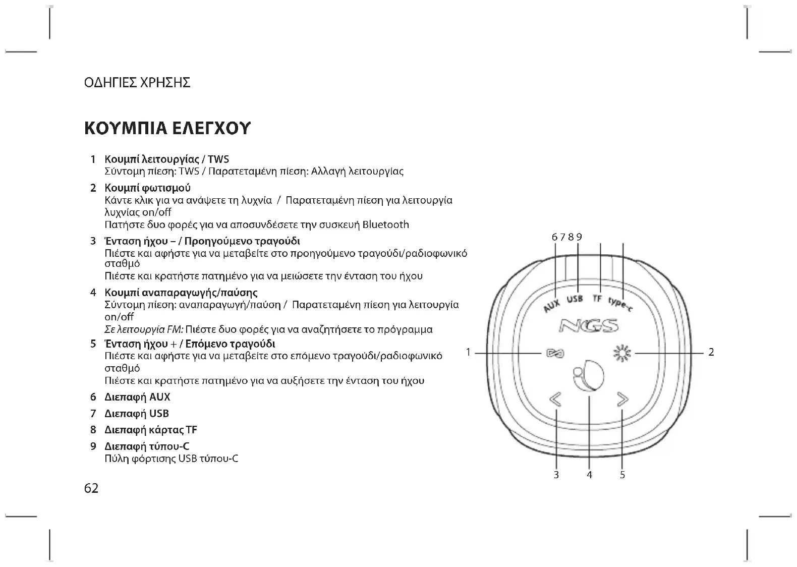 Κουμπί λειτουργίας / TWS Σύντομη πίεση: TWS / Παρατεταμένη πίεση: Αλλαγή λειτουργίας Κουμπί φωτισμού Κάντε κλικ για να ανάψετε τη λυχνία / Παρατεταμένη πίεση για λειτουργία λυχνίας on/o Πατήστε δυο φορές για να αποσυνδέσετε την συσκευή Bluetooth Ένταση ήχου – / Προηγούμενο τραγούδι Πιέστε και αφήστε για να μεταβείτε στο προηγούμενο τραγούδι/ραδιοφωνικό