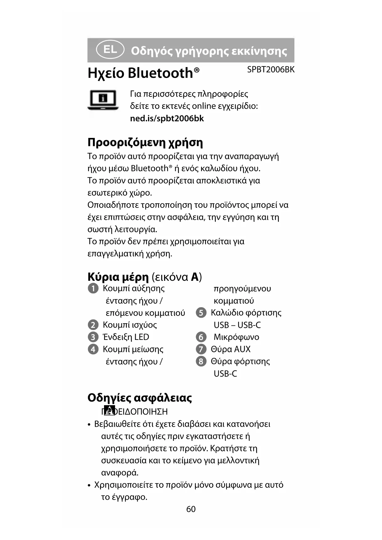 Οδηγός γρήγορης εκκίνησης Ηχείο Bluetooth® SPBT2006BKΓια περισσότερες πληροφορίες δείτε το εκτενές online εγχειρίδιο: ned.is/spbt2006bk Προοριζόμενη χρήση Το προϊόν αυτό προορίζεται για την αναπαραγωγή ήχου μέσω Bluetooth® ή ενός καλωδίου ήχου.Το προϊόν αυτό προορίζεται αποκλειστικά για εσωτερικό χώρο.Οποιαδήποτε τροποποίηση του προϊόντος μπορεί να έχει επιπτώσεις στην ασφάλεια, την εγγύηση και τη σωστή λειτουργία.Το προϊόν δεν πρέπει χρησιμοποιείται για επαγγελματική χρήση. Κύρια μέρη (εικόνα A) 1 Κουμπί αύξησης έντασης ήχου / επόμενου κομματιού 2 Κουμπί ισχύος 3 Ένδειξη LED 4 Κουμπί μείωσης έντασης ήχου / προηγούμενου κομματιού 5 Καλώδιο φόρτισης USB – USB-C 6 Μικρόφωνο 7 Θύρα AUX 8 Θύρα φόρτισης USB-C Οδηγίες ασφάλειας