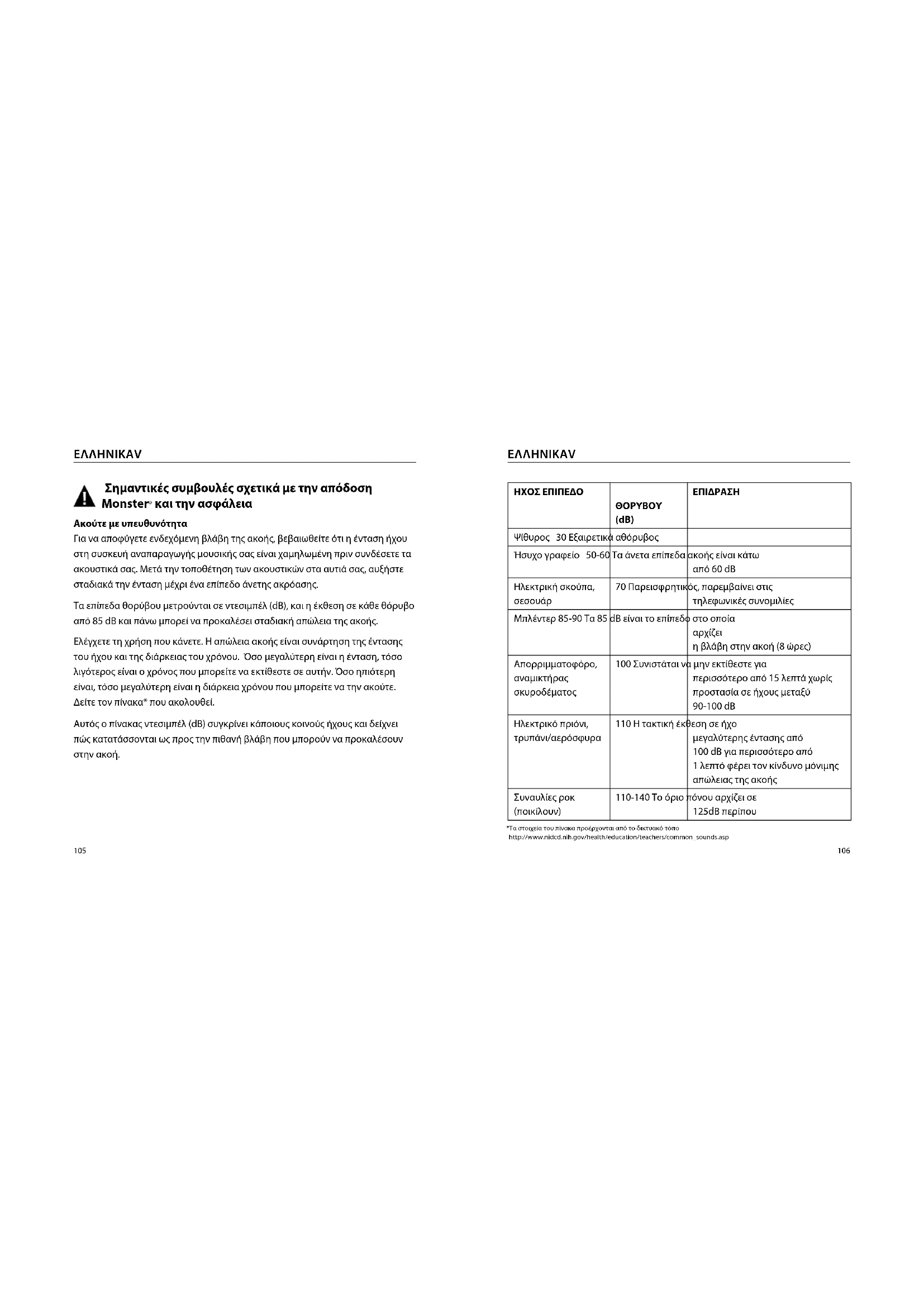 ΕΛΛΗΝΙΚΆV “…. ο μέσος άνθρωπος μπορεί να ακούει με ασφάλεια ένα iPod για 4,6 ώρες την ημέρα σε 70% της έντασης ήχου.” “…. η γνώση των επιπέδων που ακούει κάποιος μουσική, καθώς και για πόσο χρονικό διάστημα, είναι πολύ σημαντικά στοιχεία.” Από τον ιστότοπο http://www.cbc.ca/health/story/2006/10/19/music-earphones.html Μπορείτε να εκμεταλλευτείτε στο έπακρο τις δυνατότητες της συσκευής σας και να απολαύσετε τέλεια απόδοση ήχου ακόμα και σε ασφαλή επίπεδα. Τα ακουστικά μας σας επιτρέπουν να ακούτε περισσότερες λεπτομέρειες σε χαμηλότερα επίπεδα έντασης ήχου όσο ποτέ πριν. Φυσιολογία του αυτιού και της ακοής Για περισσότερες πληροφορίες σχετικά με τις επιπτώσεις των δυνατών θορύβων στο αυτί σας και για αναφορά στον πίνακα, ανατρέξτε στη διεύθυνση http://www.abelard.org/hear/hear.php#loud-music Χρησιμοποιείτε τα ακουστικά με υπευθυνότητα Μη χρησιμοποιείτε τα ακουστικά σας όταν κάτι τέτοιο δεν εγγυάται ασφάλεια – ενώ οδηγείτε ένα όχημα, διασχίζετε μια διάβαση ή σε οποιαδήποτε δραστηριότητα ή περιβάλλον όπου απαιτείται όλη η προσοχή σας. Είναι επικίνδυνο να οδηγείτε φορώντας ακουστικά, και σε πολλές περιπτώσεις, παράνομο, καθότι μειώνεται η δυνατότητά σας να ακούτε σημαντικούς για την ασφάλειά σας ήχους εκτός του οχήματός σας, όπως η κόρνα κάποιου άλλου αυτοκινήτου και οι σειρήνες οχημάτων έκτακτης ανάγκης. Αποφεύγετε να φοράτε τα ακουστικά σας κατά την οδήγηση. Αντ’ αυτού, χρησιμοποιείτε έναν από τους πομπούς FM της Monster για να ακούτε τις κινητές συσκευές των μέσων σας. Ενημερωθείτε για τον τρόπο που μπορείτε να καθιερώσετε ένα ασφαλές επίπεδο ακρόασης και επανεξετάστε άλλες σημαντικές οδηγίες ασφαλείας από την Ενωση Καταναλωτών Ηλεκτρονικών (Consumer Electronics Association - CEA) στη διεύθυνση www.ce.org και το Ινστιτούτο Ερευνών Κώφωσης στη διεύθυνση www.drf.org.109 ΕΛΛΗΝΙΚΆV