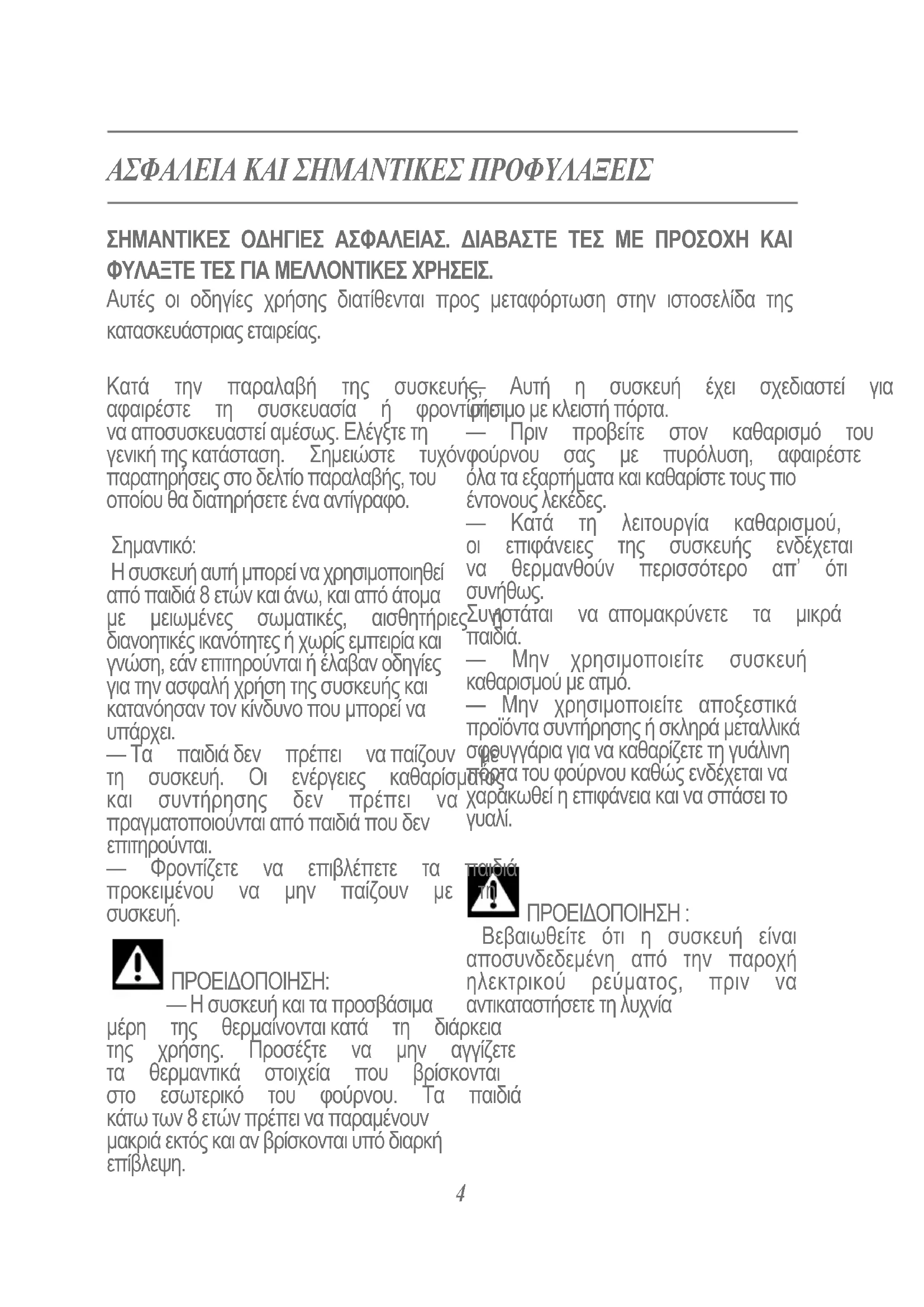 ΠΡΟΕΙΔΟΠΟΙΗΣΗ: —Ησυσκευήκαιταπροσβάσιμα μέρη της θερμαίνονταικατά τη διάρκεια της χρήσης. Προσέξτε να μην αγγίζετε τα θερμαντικά στοιχεία που βρίσκονται στο εσωτερικό του φούρνου. Τα παιδιά κάτωτων8ετώνπρέπειναπαραμένουν μακριάεκτόςκαιανβρίσκονταιυπόδιαρκή