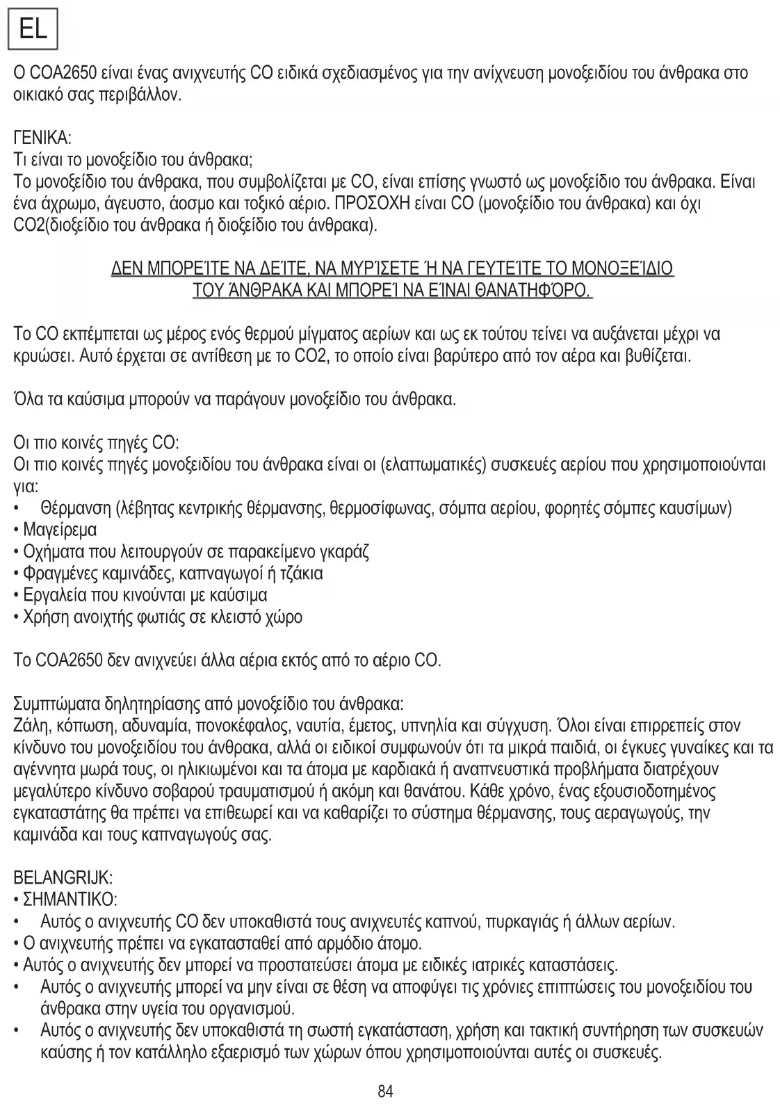 - Αυτός ο ανιχνευτής δεν υποκαθιστά τη σωστή εγκατάσταση, χρήση και τακτική συντήρηση των συσκευών καύσης ή τον κατάλληλο εξαερισμό των χώρων όπου χρησιμοποιούνται αυτές οι συσκευές.85