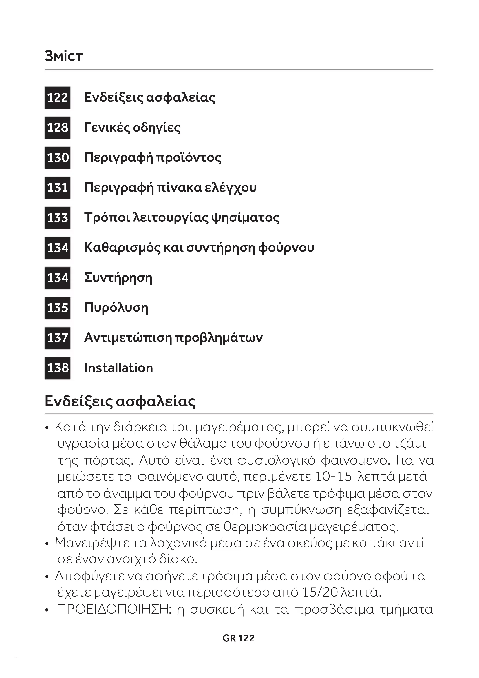 - Εάν έχει τοποθετηθεί εστία πάνω από τον φούρνο, μην χρησιμοποιείτε ποτέ την εστία ενώ ταυτόχρονα λειτουργεί το Pyrolizer, αυτό θα αποτρέψει την υπερθέρμανση της εστίας.GR 128 Γενικές οδηγίες Ενδείξεις ασφαλείας Σας ευχαριστούμε που επιλέξατε ένα από τα προϊόντα μας. Για να έχετε τα καλύτερα αποτελέσματα με τον φούρνο σας, θα πρέπει να διαβάσετε προσεκτικά αυτό το εγχειρίδιο οδηγιών χρήσης και να το φυλάξετε για μελλοντική αναφορά. Πριν τοποθετήσετε τον φούρνο, σημειώστε τον σειριακό αριθμό έτσι ώστε να μπορείτε να τον δώσετε στο προσωπικό της υπηρεσίας εξυπηρέτησης πελατών εάν πρέπει να γίνει μία επισκευή. Αφού έχετε αφαιρέσει τον φούρνο από την συσκευασία του, ελέγξτε ότι δεν έχει πάθει ζημιά κατά την διάρκεια της μεταφοράς. Εάν έχετε οποιαδήποτε αμφιβολία, μην χρησιμοποιήσετε τον φούρνο και επικοινωνήστε με ένα πιστοποιημένο τεχνικό για συμβουλές. Κρατήστε όλα τα υλικά της συσκευασίας (πλαστικές σακούλες, πολυστερίνες, καρφιά) μακριά από παιδιά. Όταν ανάβει ο φούρνος για πρώτη φορά, μπορεί να εμφανιστεί έντονος καπνός μαζί με μυρωδιά, ο οποίος προκαλείται από την κόλλα που υπάρχει επάνω στα μονωτικά πλαίσια που περιβάλουν τον φούρνο τα οποία θερμαίνονται για πρώτη φορά. Αυτό είναι απολύτως φυσιολογικό και, εάν εμφανιστεί, θα πρέπει να περιμένετε να διαλυθεί ο καπνός πριν τοποθετήσετε φαγητό μέσα στον φούρνο. Ο κατασκευαστής δεν φέρει καμία απολύτως ευθύνη σε περίπτωση που δεν τηρούνται οι οδηγίες που περιέχονται σε αυτό το έγγραφο. ΣΗΜΕΙΩΣΗ: οι λειτουργίες του φούρνου, οι ιδιότητες και τα αξεσουάρ που περιγράφονται σε αυτό το εγχειρίδιο θα διαφέρουν, ανάλογα με το μοντέλο που έχετε αγοράσει. Використовуйте духовку лише за призначенням, а саме для приготування їжі. Будь-яке інше використання, наприклад, як джерела тепла, є неправильним та відповідно небезпечним. Виробник не несе відповідальності за будь-яку шкоду заподіяну внаслідок неправильного, невідповідного чи нерозумного використання приладу. Використання будь-якого електричного приладу передбачає дотримання деяких фундаментальних правил: - не тягніть кабель живлення, щоб витягнути вилку з розетки; - не торкайтеся приладу вологими чи мокрими руками або ногами; - як правило, не рекомендується використовувати адаптери, розгалужувачі та продовжувачі; у випадку несправності та/чи невідповідної роботи, вимкніть прилад і не намагайтеся відремонтувати його. Ηλεκτρική ασφάλεια ΣΙΓΟΥΡΕΥΤΕΙΤΕ ΟΤΙ ΟΛΕΣ ΟΙ ΗΛΕΚΤΡΙΚΕΣ ΣΥΝΔΕΣΕΙΣ ΓΙΝΟΝΤΑΙ ΑΠΟ ΕΝΑ ΗΛΕΚΤΡΟΛΟΓΟ Ή ΠΙΣΤΟΠΟΙΗΜΕΝΟ ΤΕΧΝΙΚΟ. Το καλώδιο τροφοδοσίας με το οποίο συνδέεται ο φούρνος πρέπει να πληροί τις προϋποθέσεις της ισχύουσας νομοθεσίας στην χώρα τοποθέτησης. Ο κατασκευαστής δεν φέρει καμία απολύτως ευθύνη για τυχόν ζημιά που έχει προκληθεί από μη τήρηση αυτών των οδηγιών. Ο φούρνος πρέπει να είναι συνδεδεμένος σε μία παροχή ηλεκτρικού ρεύματος με γειωμένη πρίζα τοίχου ή ένα πολλαπλό ασφαλειοδιακόπτη, ανάλογα με την ισχύουσα νομοθεσία στην χώρα τοποθέτησης. Η τροφοδοσία του ηλεκτρικού ρεύματος θα πρέπει να προστατεύεται με κατάλληλες ασφάλειες και τα καλώδια που χρησιμοποιούνται πρέπει να έχουν διατομή η οποία να εγγυάται την σωστή τροφοδοσία του φούρνου.