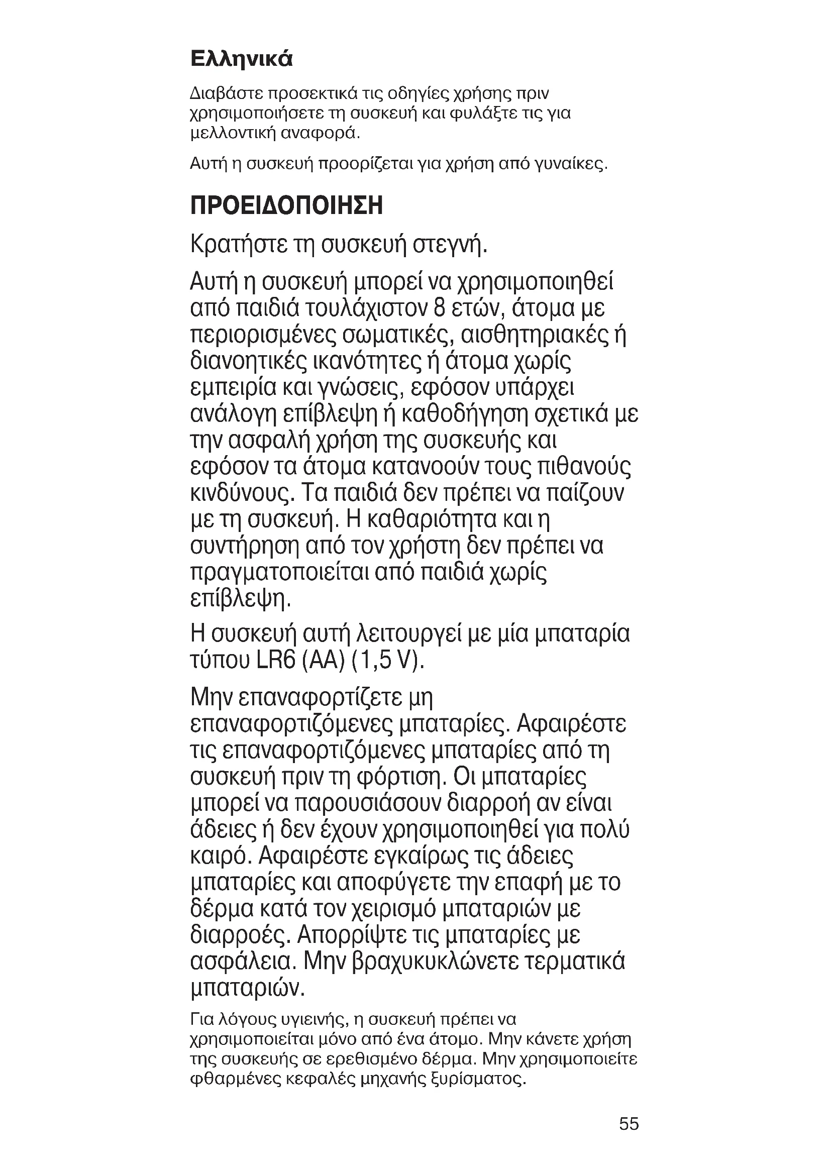 Διαβάστε προσεκτικά τις οδηγίες χρήσης πριν χρησιμοποιήσετε τη συσκευή και φυλάξτε τις για μελλοντική αναφορά. Αυτή η συσκευή προορίζεται για χρήση από γυναίκες. ΠΡΟΕΙΔΟΠΟΙΗΣΗ Κρατήστε τη συσκευή στεγνή. Αυτή η συσκευή μπορεί να χρησιμοποιηθεί από παιδιά τουλάχιστον 8 ετών, άτομα με περιορισμένες σωματικές, αισθητηριακές ή διανοητικές ικανότητες ή άτομα χωρίς εμπειρία και γνώσεις, εφόσον υπάρχει ανάλογη επίβλεψη ή καθοδήγηση σχετικά με την ασφαλή χρήση της συσκευής και εφόσον τα άτομα κατανοούν τους πιθανούς κινδύνους. Τα παιδιά δεν πρέπει να παίζουν με τη συσκευή. Η καθαριότητα και η συντήρηση από τον χρήστη δεν πρέπει να πραγματοποιείται από παιδιά χωρίς