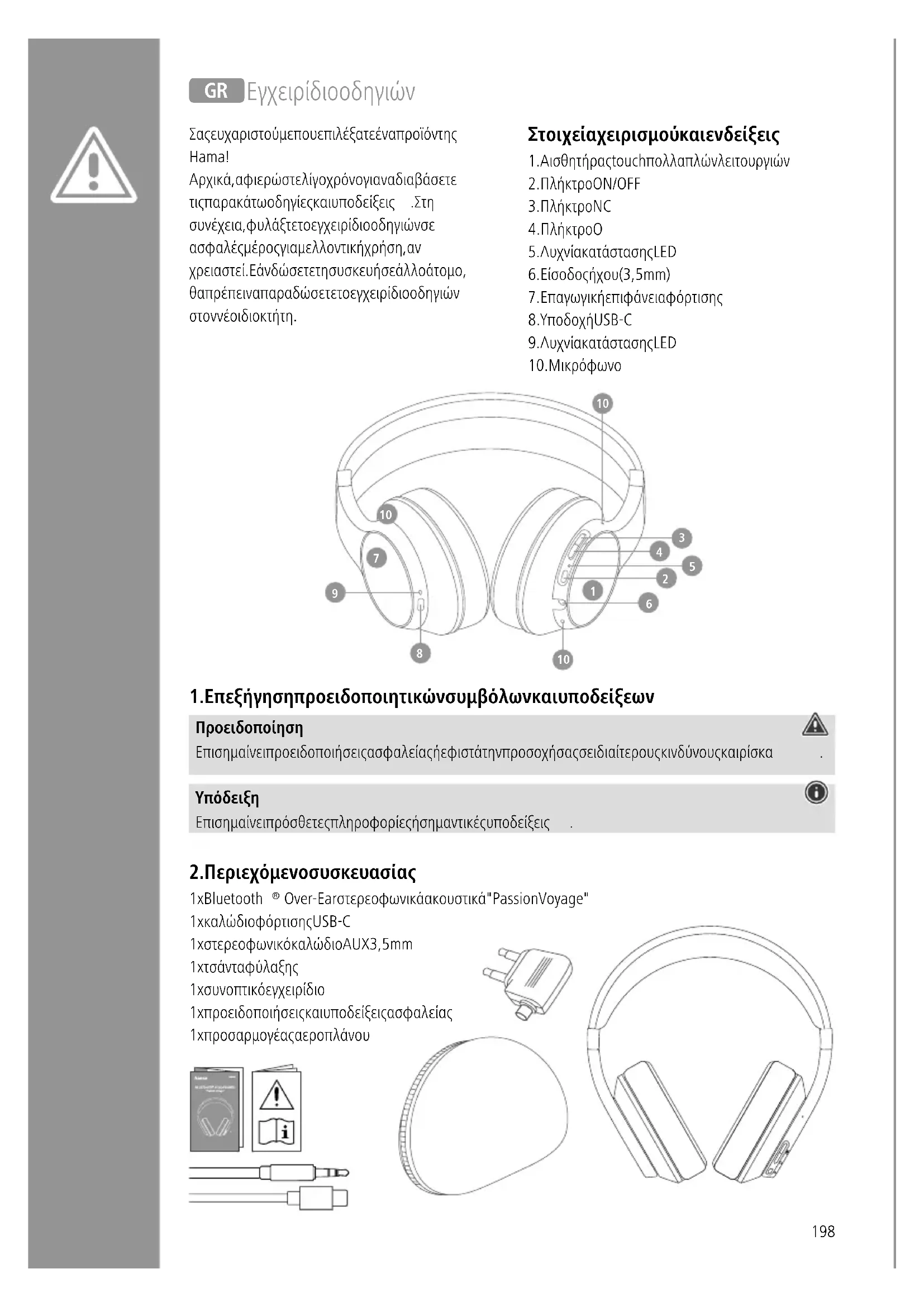 Over-Ear στερεοφωνικά ακουστικά "Passion Voyage" 1 x καλώδιο φόρτισης USB-C 1 x στερεοφωνικό καλώδιο AUX 3,5 mm 1 x τσάντα φύλαξης 1 x συνοπτικό εγχειρίδιο 1 x προειδοποιήσεις και υποδείξεις ασφαλείας 1 x προσαρμογέας αεροπλάνου J Εγχειρίδιο οδηγιών Σας ευχαριστούμε που επιλέξατε ένα προϊόν της Hama! Αρχικά, αφιερώστε λίγο χρόνο για να διαβάσετε τις παρακάτω οδηγίες και υποδείξεις