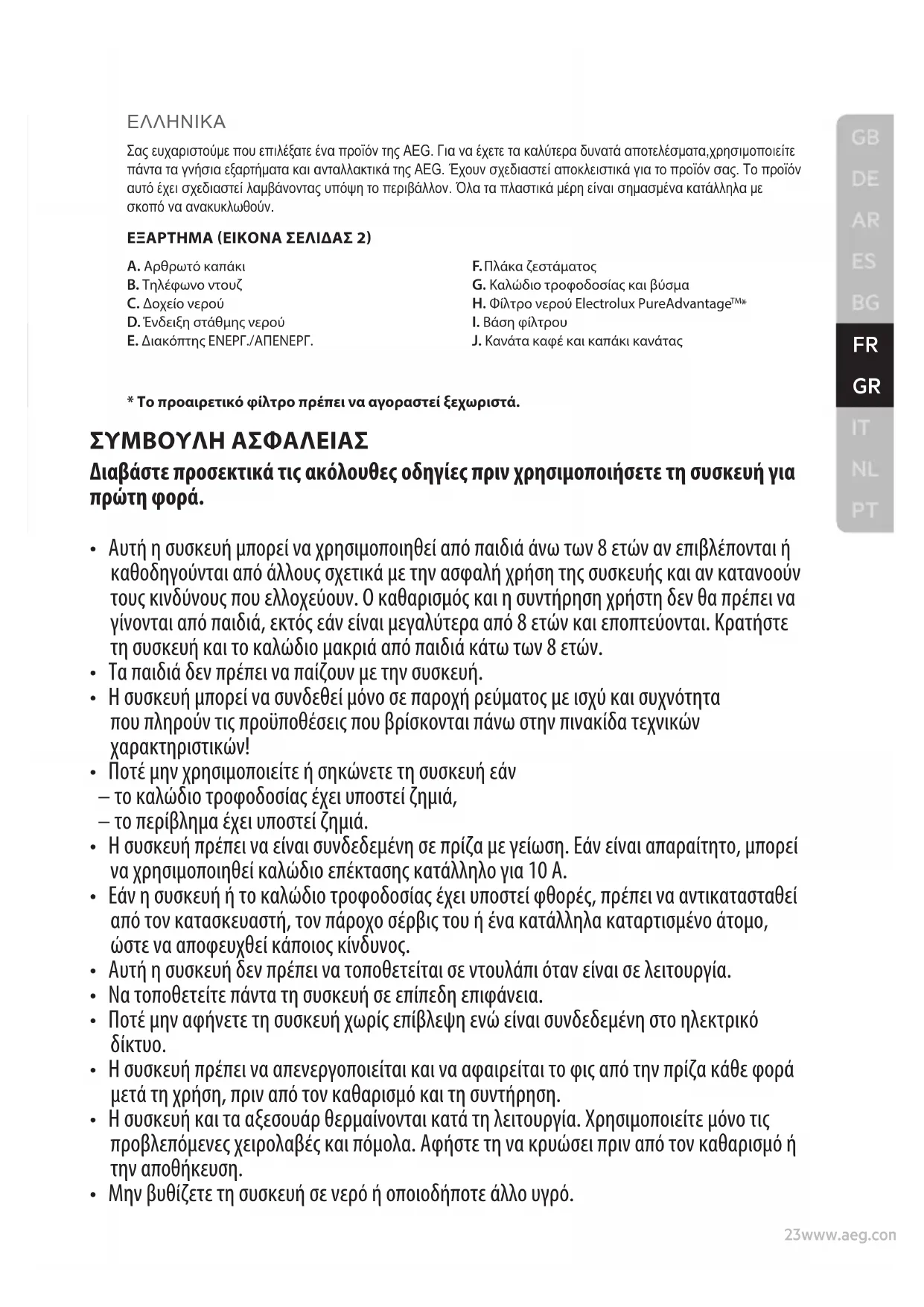 Σας ευχαριστούμε που επιλέξατε ένα προϊόν της AEG. Για να έχετε τα καλύτερα δυνατά αποτελέσματα,χρησιμοποιείτε πάντα τα γνήσια εξαρτήματα και ανταλλακτικά της AEG. Έχουν σχεδιαστεί αποκλειστικά για το προϊόν σας. Το προϊόν αυτό έχει σχεδιαστεί λαμβάνοντας υπόψη το περιβάλλον. Όλα τα πλαστικά μέρη είναι σημασμένα κατάλληλα με σκοπό να ανακυκλωθούν. ΕΞΑΡΤΗΜΑ (ΕΙΚΌΝΑ ΣΕΛΙΔΑΣ 2) A. Αρθρωτό καπάκι B. Τηλέφωνο ντουζ C. Δοχείο νερού D. Ένδειξη στάθμης νερού E. Διακόπτης ΕΝΕΡΓ./ΑΠΕΝΕΡΓ. F. Πλάκα ζεστάματος G. Καλώδιο τροφοδοσίας και βύσμα H. Φίλτρο νερού Electrolux PureAdvantage