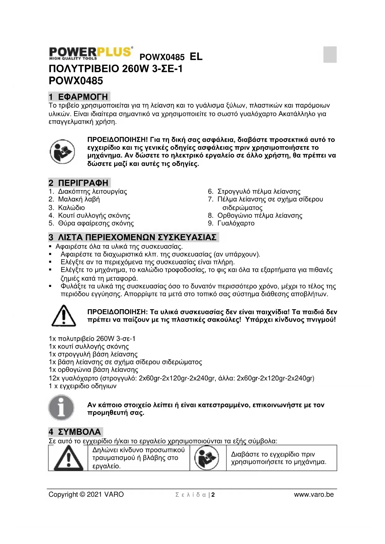 Διαβάστε το εγχειρίδιο πριν χρησιμοποιήσετε το μηχάνημα.POWX0485 EL Copyright © 2021 VARO Σ ε λ ί δ α | 3 www.varo.be