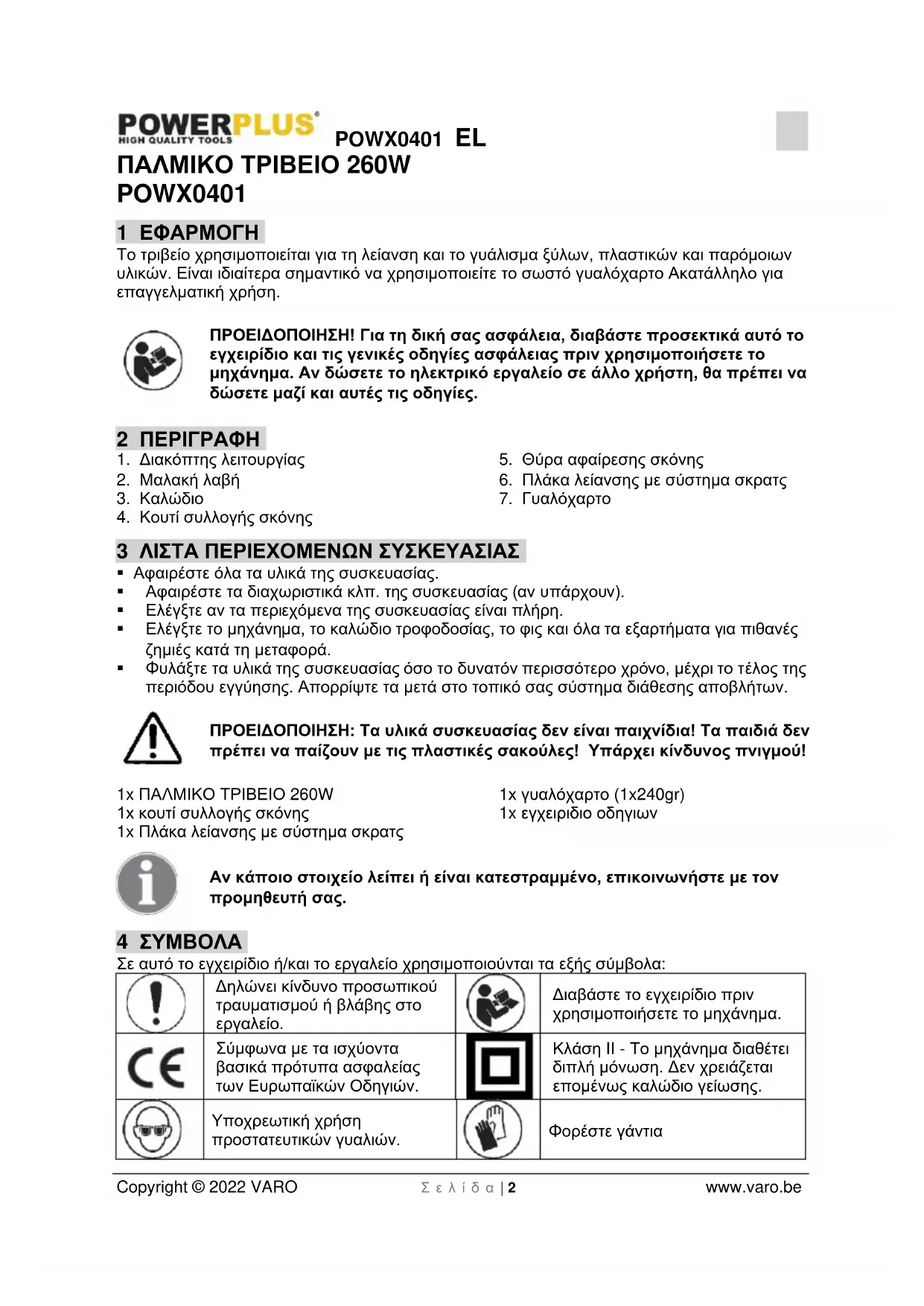 - 15 ΔΗΛΩΣΗ ΣΥΜΜΟΡΦΩΣΗΣ POWX0401 EL Copyright © 2022 VARO Σ ε λ ί δ α | 2 www.varo.be ΠΑΛΜΙΚΟ ΤΡΙΒΕΙΟ 260W POWX0401 1 ΕΦΑΡΜΟΓΗ Το τριβείο χρησιμοποιείται για τη λείανση και το γυάλισμα ξύλων, πλαστικών και παρόμοιων υλικών. Είναι ιδιαίτερα σημαντικό να χρησιμοποιείτε το σωστό γυαλόχαρτο Ακατάλληλο για επαγγελματική χρήση. ΠΡΟΕΙΔΟΠΟΙΗΣΗ! Για τη δική σας ασφάλεια, διαβάστε προσεκτικά αυτό το εγχειρίδιο και τις γενικές οδηγίες ασφάλειας πριν χρησιμοποιήσετε το μηχάνημα. Αν δώσετε το ηλεκτρικό εργαλείο σε άλλο χρήστη, θα πρέπει να δώσετε μαζί και αυτές τις οδηγίες. 2 ΠΕΡΙΓΡΑΦΗ p. 9