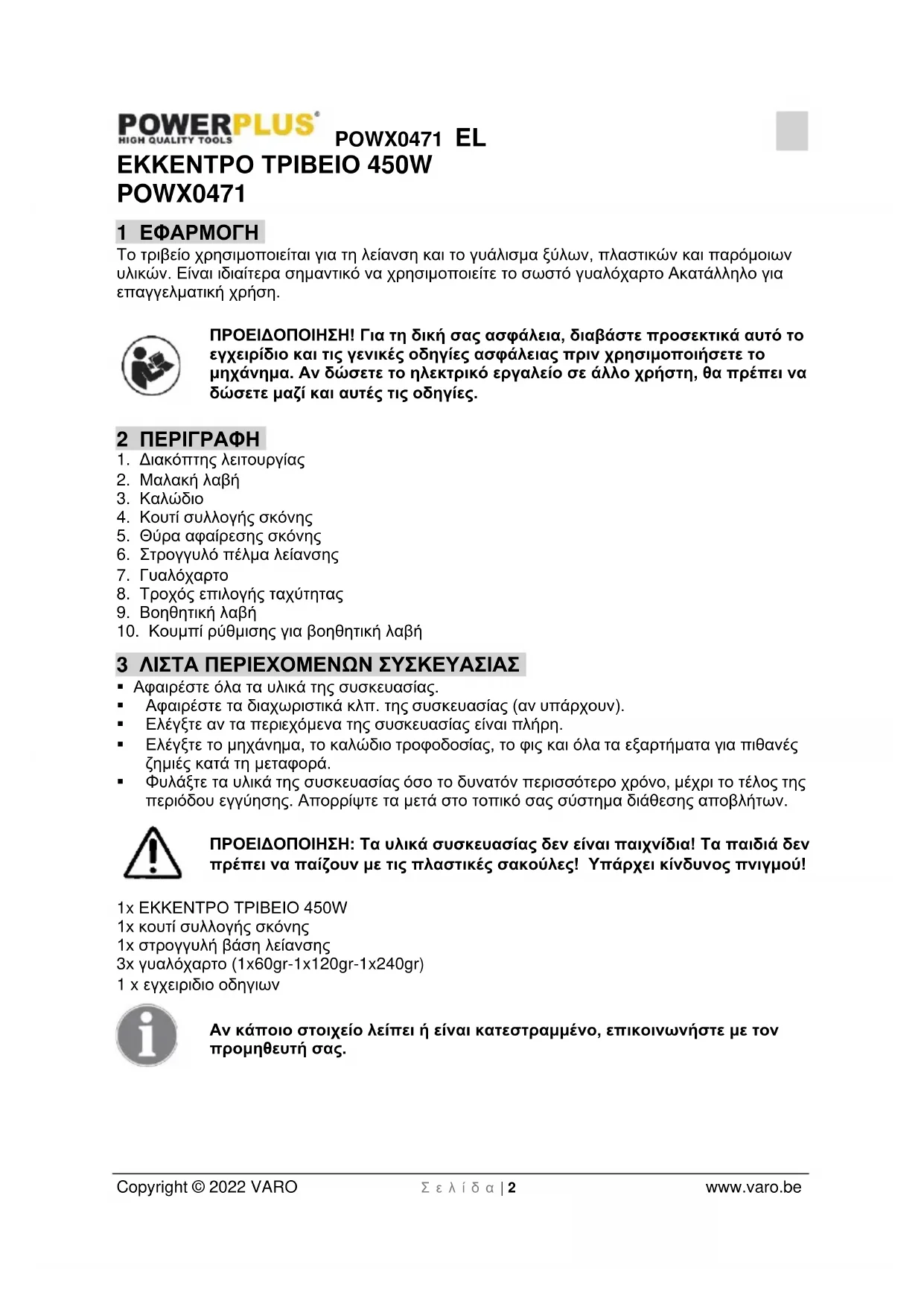 - Φυλάξτε τα υλικά της συσκευασίας όσο το δυνατόν περισσότερο χρόνο, μέχρι το τέλος της περιόδου εγγύησης. Απορρίψτε τα μετά στο τοπικό σας σύστημα διάθεσης αποβλήτων. ΠΡΟΕΙΔΟΠΟΙΗΣΗ: Τα υλικά συσκευασίας δεν είναι παιχνίδια! Τα παιδιά δεν πρέπει να παίζουν με τις πλαστικές σακούλες! Υπάρχει κίνδυνος πνιγμού! 1x ΕΚΚΕΝΤΡΟ ΤΡΙΒΕΙΟ 450W 1x κουτί συλλογής σκόνης 1x στρογγυλή βάση λείανσης 3x γυαλόχαρτο (1x60gr-1x120gr-1x240gr) 1 x εγχειριδιο oδηγιων Αν κάποιο στοιχείο λείπει ή είναι κατεστραμμένο, επικοινωνήστε με τον προμηθευτή σας.POWX0471 EL Copyright © 2022 VARO Σ ε λ ί δ α | 3 www.varo.be 4 ΣΥΜΒΟΛΑ Σε αυτό το εγχειρίδιο ή/και το εργαλείο χρησιμοποιούνται τα εξής σύμβολα:
