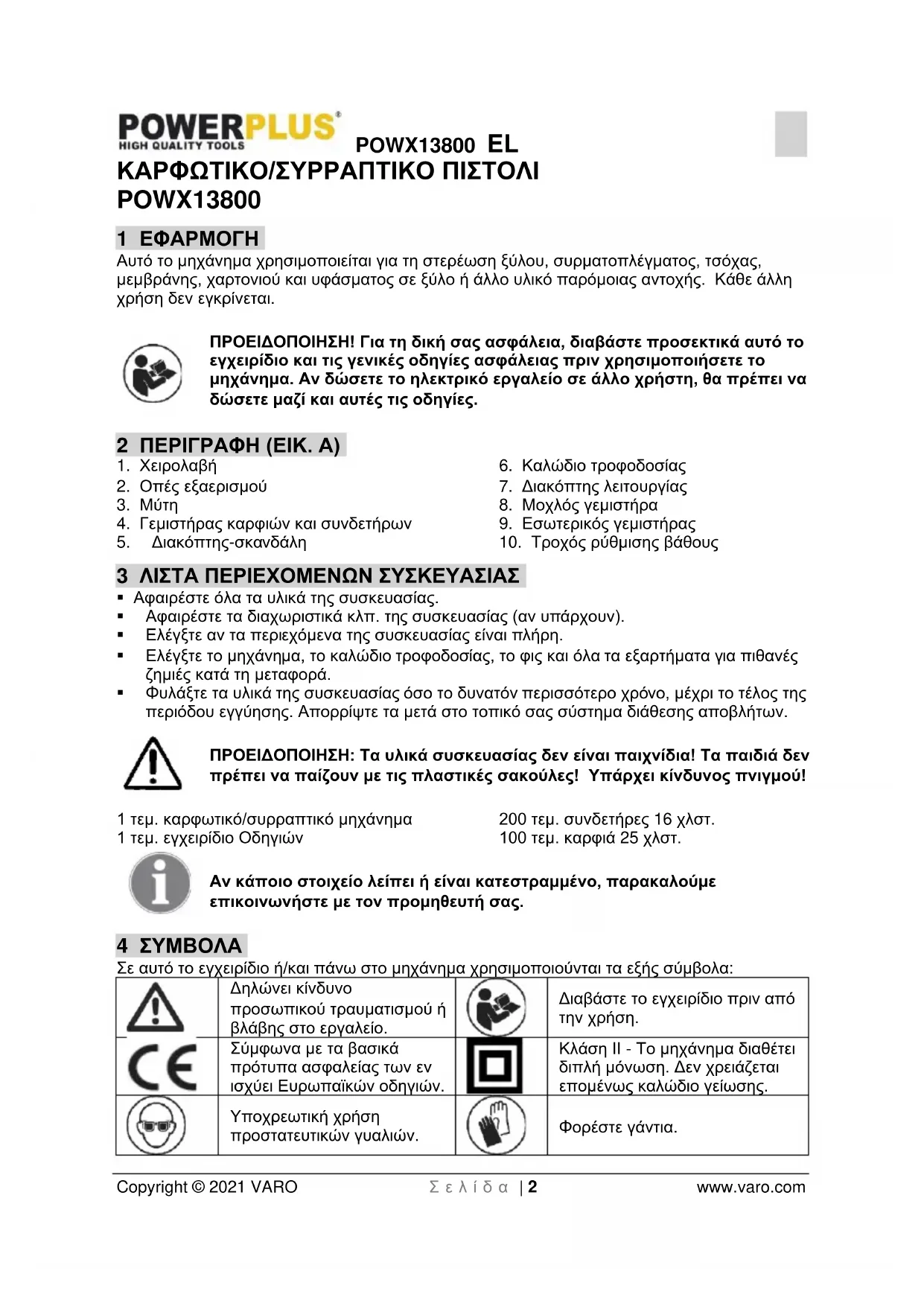 - 15 ΔΗΛΩΣΗ ΣΥΜΜΟΡΦΩΣΗΣ POWX13800 EL Copyright © 2021 VARO Σ ε λ ί δ α | 2 www.varo.com ΚΑΡΦΩΤΙΚΟ/ΣΥΡΡΑΠΤΙΚΟ ΠΙΣΤΟΛΙ POWX13800 1 ΕΦΑΡΜΟΓΗ Αυτό το μηχάνημα χρησιμοποιείται για τη στερέωση ξύλου, συρματοπλέγματος, τσόχας, μεμβράνης, χαρτονιού και υφάσματος σε ξύλο ή άλλο υλικό παρόμοιας αντοχής. Κάθε άλλη χρήση δεν εγκρίνεται. ΠΡΟΕΙΔΟΠΟΙΗΣΗ! Για τη δική σας ασφάλεια, διαβάστε προσεκτικά αυτό το εγχειρίδιο και τις γενικές οδηγίες ασφάλειας πριν χρησιμοποιήσετε το μηχάνημα. Αν δώσετε το ηλεκτρικό εργαλείο σε άλλο χρήστη, θα πρέπει να δώσετε μαζί και αυτές τις οδηγίες. 2 ΠΕΡΙΓΡΑΦΗ (ΕΙΚ. A) p. 9