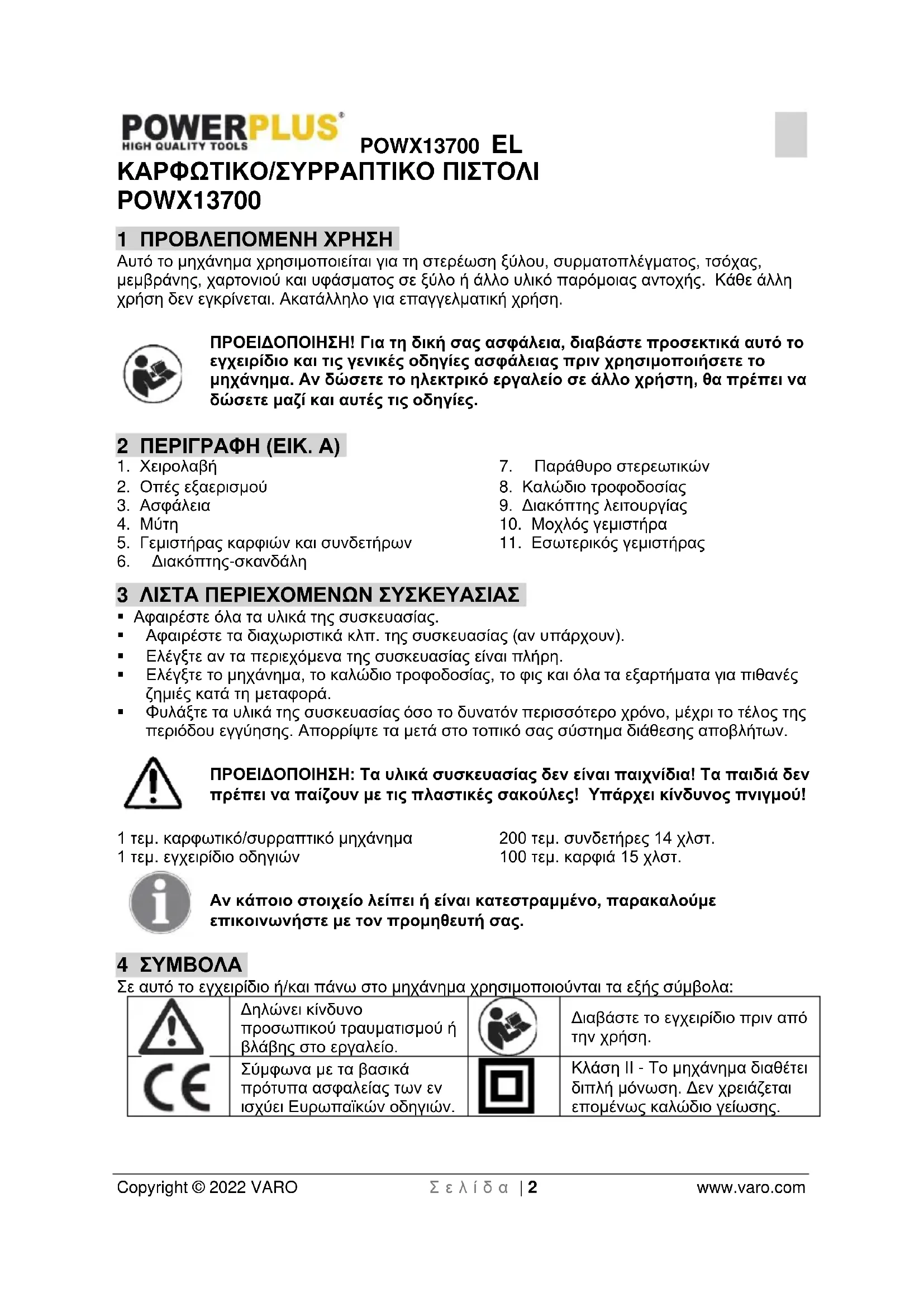 - 14 ΔΗΛΩΣΗ ΣΥΜΜΟΡΦΩΣΗΣ POWX13700 EL Copyright © 2022 VARO Σ ε λ ί δ α | 2 www.varo.com ΚΑΡΦΩΤΙΚΟ/ΣΥΡΡΑΠΤΙΚΟ ΠΙΣΤΟΛΙ POWX13700 1 ΠΡΟΒΛΕΠΟΜΕΝΗ ΧΡΗΣΗ Αυτό το μηχάνημα χρησιμοποιείται για τη στερέωση ξύλου, συρματοπλέγματος, τσόχας, μεμβράνης, χαρτονιού και υφάσματος σε ξύλο ή άλλο υλικό παρόμοιας αντοχής. Κάθε άλλη χρήση δεν εγκρίνεται. Ακατάλληλο για επαγγελματική χρήση. ΠΡΟΕΙΔΟΠΟΙΗΣΗ! Για τη δική σας ασφάλεια, διαβάστε προσεκτικά αυτό το εγχειρίδιο και τις γενικές οδηγίες ασφάλειας πριν χρησιμοποιήσετε το μηχάνημα. Αν δώσετε το ηλεκτρικό εργαλείο σε άλλο χρήστη, θα πρέπει να δώσετε μαζί και αυτές τις οδηγίες. 2 ΠΕΡΙΓΡΑΦΗ (ΕΙΚ. A) p. 8