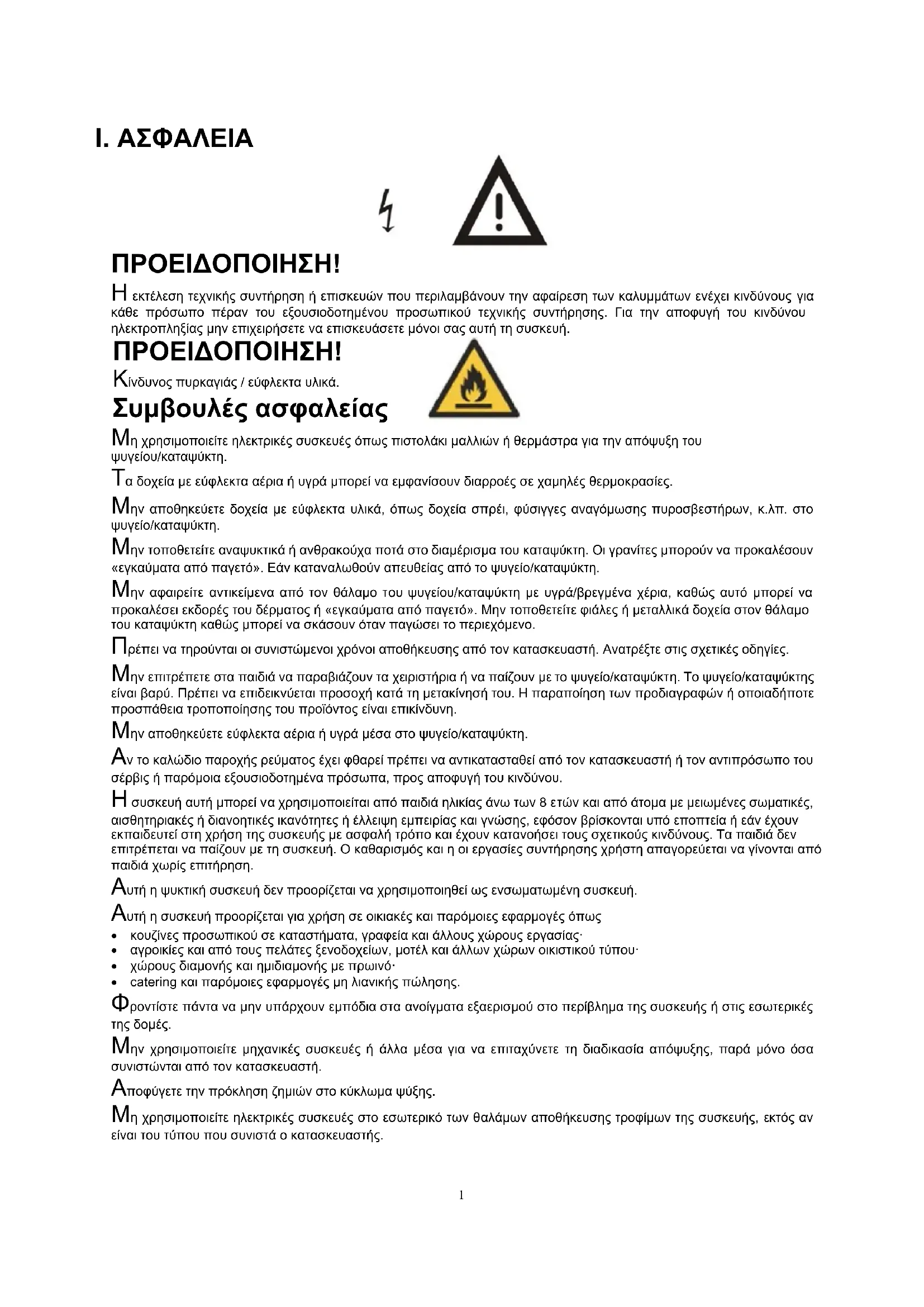 ΠΡΟΕΙΔΟΠΟΙΗΣΗ! Η εκτέλεση τεχνικής συντήρηση ή επισκευών που περιλαμβάνουν την αφαίρεση των καλυμμάτων ενέχει κινδύνους για κάθε πρόσωπο πέραν του εξουσιοδοτημένου προσωπικού τεχνικής συντήρησης. Για την αποφυγή του κινδύνου ηλεκτροπληξίας μην επιχειρήσετε να επισκευάσετε μόνοι σας αυτή τη συσκευή. ΠΡΟΕΙΔΟΠΟΙΗΣΗ! Κίνδυνος πυρκαγιάς / εύφλεκτα υλικά. Συμβουλές ασφαλείας Μη χρησιμοποιείτε ηλεκτρικές συσκευές όπως πιστολάκι μαλλιών ή θερμάστρα για την απόψυξη του ψυγείου/καταψύκτη. Τα δοχεία με εύφλεκτα αέρια ή υγρά μπορεί να εμφανίσουν διαρροές σε χαμηλές θερμοκρασίες. Μην αποθηκεύετε δοχεία με εύφλεκτα υλικά, όπως δοχεία σπρέι, φύσιγγες αναγόμωσης πυροσβεστήρων, κ.λπ. στο ψυγείο/καταψύκτη. Μην τοποθετείτε αναψυκτικά ή ανθρακούχα ποτά στο διαμέρισμα του καταψύκτη. Οι γρανίτες μπορούν να προκαλέσουν «εγκαύματα από παγετό». Εάν καταναλωθούν απευθείας από το ψυγείο/καταψύκτη. Μην αφαιρείτε αντικείμενα από τον θάλαμο του ψυγείου/καταψύκτη με υγρά/βρεγμένα χέρια, καθώς αυτό μπορεί να προκαλέσει εκδορές του δέρματος ή «εγκαύματα από παγετό». Μην τοποθετείτε φιάλες ή μεταλλικά δοχεία στον θάλαμο του καταψύκτη καθώς μπορεί να σκάσουν όταν παγώσει το περιεχόμενο. Πρέπει να τηρούνται οι συνιστώμενοι χρόνοι αποθήκευσης από τον κατασκευαστή. Ανατρέξτε στις σχετικές οδηγίες. Μην επιτρέπετε στα παιδιά να παραβιάζουν τα χειριστήρια ή να παίζουν με το ψυγείο/καταψύκτη. Το ψυγείο/καταψύκτης είναι βαρύ. Πρέπει να επιδεικνύεται προσοχή κατά τη μετακίνησή του. Η παραποίηση των προδιαγραφών ή οποιαδήποτε προσπάθεια τροποποίησης του προϊόντος είναι επικίνδυνη. Μην αποθηκεύετε εύφλεκτα αέρια ή υγρά μέσα στο ψυγείο/καταψύκτη. Αν το καλώδιο παροχής ρεύματος έχει φθαρεί πρέπει να αντικατασταθεί από τον κατασκευαστή ή τον αντιπρόσωπο του σέρβις ή παρόμοια εξουσιοδοτημένα πρόσωπα, προς αποφυγή του κινδύνου. Η συσκευή αυτή μπορεί να χρησιμοποιείται από παιδιά ηλικίας άνω των 8 ετών και από άτομα με μειωμένες σωματικές, αισθητηριακές ή διανοητικές ικανότητες ή έλλειψη εμπειρίας και γνώσης, εφόσον βρίσκονται υπό εποπτεία ή εάν έχουν εκπαιδευτεί στη χρήση της συσκευής με ασφαλή τρόπο και έχουν κατανοήσει τους σχετικούς κινδύνους. Τα παιδιά δεν επιτρέπεται να παίζουν με τη συσκευή. Ο καθαρισμός και η οι εργασίες συντήρησης χρήστη απαγορεύεται να γίνονται από παιδιά χωρίς επιτήρηση. Αυτή η ψυκτική συσκευή δεν προορίζεται να χρησιμοποιηθεί ως ενσωματωμένη συσκευή. Αυτή η συσκευή προορίζεται για χρήση σε οικιακές και παρόμοιες εφαρμογές όπως