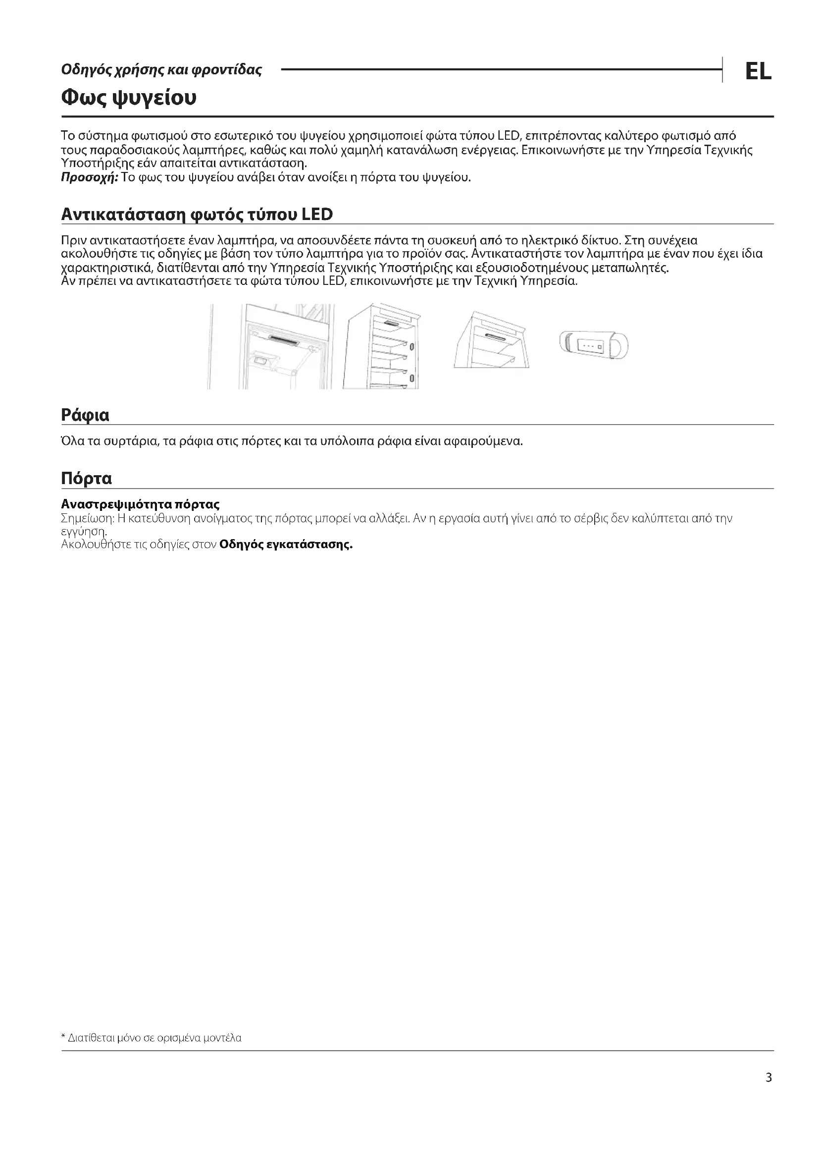 Οδηγός χρήσης και φροντίδας Φως ψυγείου Το σύστημα φωτισμού στο εσωτερικό του ψυγείου χρησιμοποιεί φώτα τύπου LED, επιτρέποντας καλύτερο φωτισμό από τους παραδοσιακούς λαμπτήρες, καθώς και πολύ χαμηλή κατανάλωση ενέργειας. Επικοινωνήστε με την Υπηρεσία Τεχνικής Υποστήριξης εάν απαιτείται αντικατάσταση. Προσοχή: Το φως του ψυγείου ανάβει όταν ανοίξει η πόρτα του ψυγείου. Αντικατάσταση φωτός τύπου LED Πριν αντικαταστήσετε έναν λαμπτήρα, να αποσυνδέετε πάντα τη συσκευή από το ηλεκτρικό δίκτυο. Στη συνέχεια ακολουθήστε τις οδηγίες με βάση τον τύπο λαμπτήρα για το προϊόν σας. Αντικαταστήστε τον λαμπτήρα με έναν που έχει ίδια χαρακτηριστικά, διατίθενται από την Υπηρεσία Τεχνικής Υποστήριξης και εξουσιοδοτημένους μεταπωλητές. Αν πρέπει να αντικαταστήσετε τα φώτα τύπου LED, επικοινωνήστε με την Τεχνική Υπηρεσία.