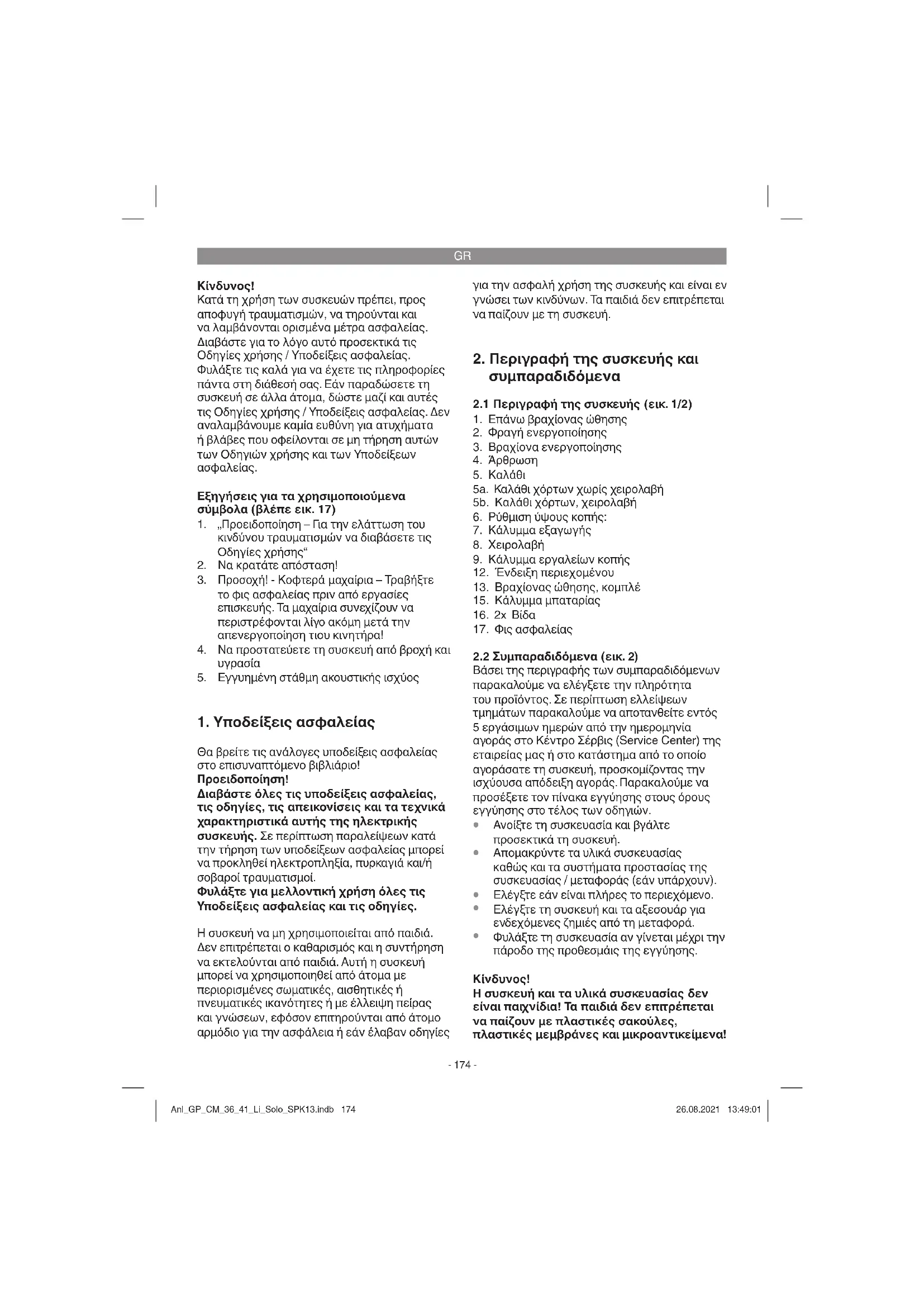 επαναχρησιμοποίηση Η συσκευή βρίσκεται σε μία συσκευασία προς αποφυγή ζημιών κατά τη μεταφορά Αυτή η συσκευασία αποτελείται από πρώτες ύλες και έτσι μπορεί να επαναχρησιμοποιηθεί ή να ανακυκλωθεί. Η συσκευή και τα εξαρτήματά της αποτελούνται από διάφορα υλικά, όπως π.χ. μέταλλο και πλαστικά υλικά. Δεν επιτρέπεται η απόρριψη ελαττωματικών συσκευών στα οικιακά απορρίμματα. Σωστή απόρριψη είναι η παράδοση σε κατάλληλα κέντρα συλλογής μεταχειρισμένων συσκευών. Εάν δεν γνωρίζετε πού βρίσκεται παρόμοιο κέντρο συλλογής μεταχειρισμένων συσκευών, ρωτήστε στη διοίκηση της κοινότητάς σας. Anl_GP_CM_36_41_Li_Solo_SPK13.indb 181Anl_GP_CM_36_41_Li_Solo_SPK13.indb 181 26.08.2021 13:49:0326.08.2021 13:49:03GR