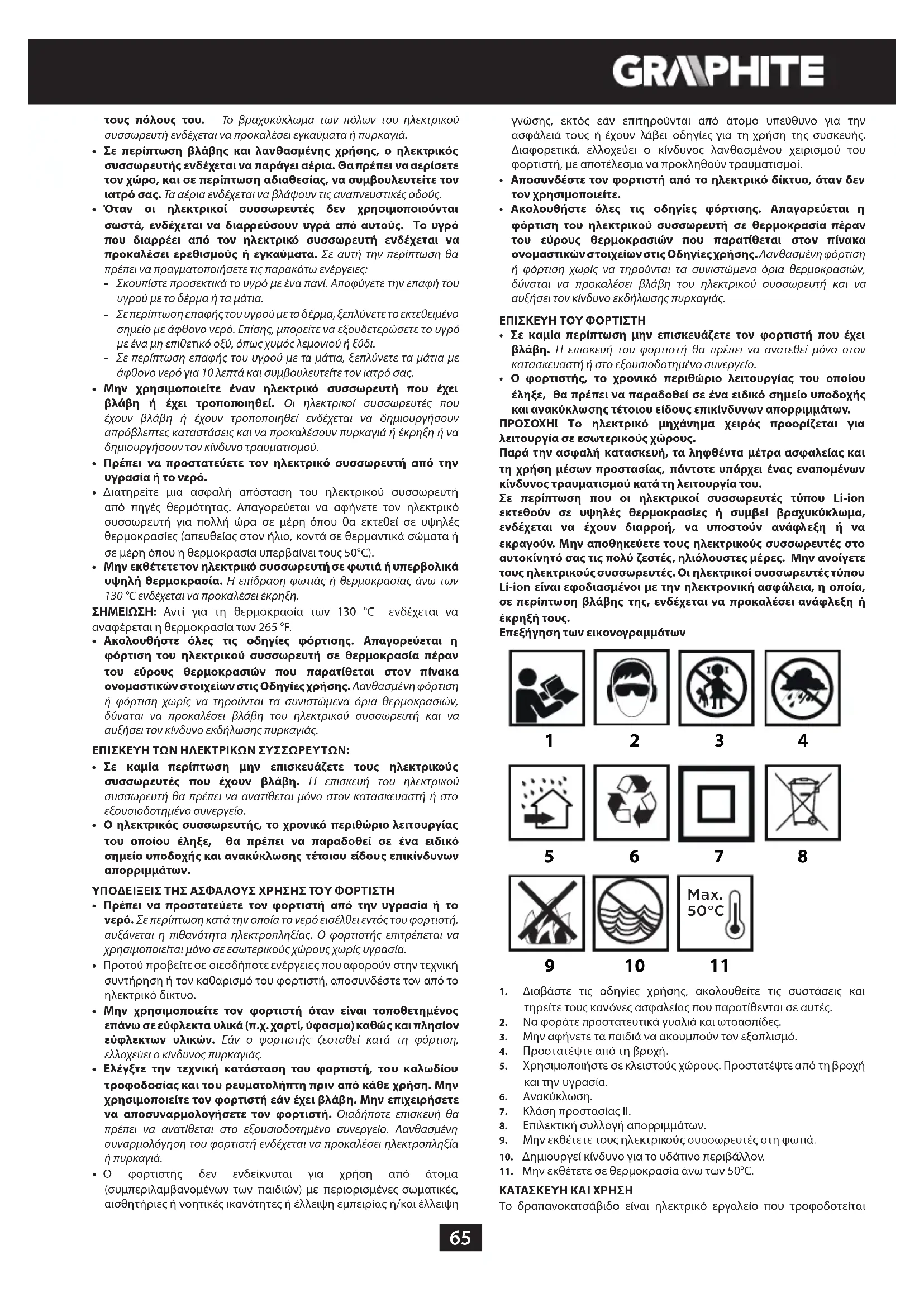 - Ακολουθήστε όλες τις οδηγίες φόρτισης. Απαγορεύεται η φόρτιση του ηλεκτρικού συσσωρευτή σε θερμοκρασία πέραν του εύρους θερμοκρασιών πο υ παρατίθεται στον πίνακα ονομαστικών στοιχείων στις Οδηγίες χρήσης. Λανθασμένη φόρτιση ή φόρτιση χωρίς να τηρούνται τα συνιστώμενα όρια θερμοκρασιών, δύναται να προκαλέσει βλάβη του ηλεκτρικού συσσωρευτή και να αυξήσει τον κίνδυνο εκδήλωσης πυρκαγιάς. ΕΠΙΣΚΕΥΗ ΤΟΥ ΦΟΡΤΙΣΤΗ