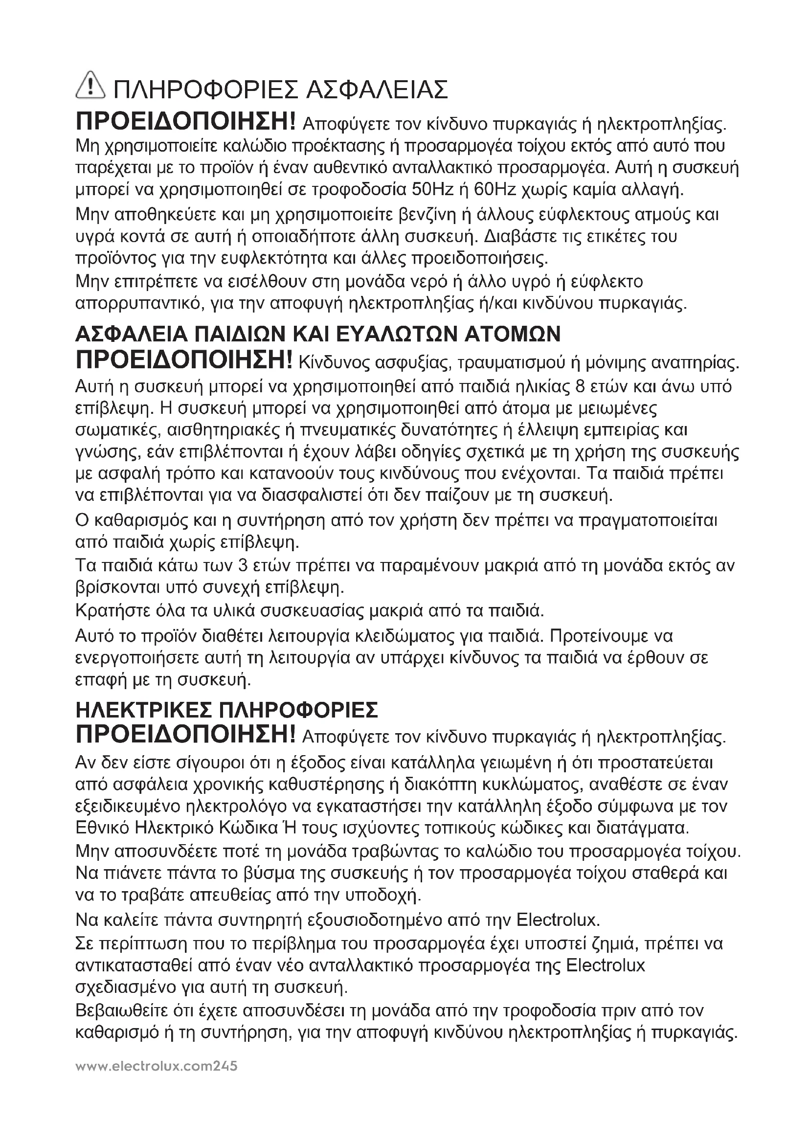 Μπορείτε να αναζητήσετε περισσότερα θέματα αντιμετώπισης προβλημάτων και οδηγούς Συχνών Ερωτήσεων στην ιστοσελίδα μας Ή στην εφαρμογή της Electrolux, στις σελίδες πληροφοριών προϊόντος, ή να επικοινωνήσετε απευθείας με ένα εξουσιοδοτημένο κέντρο σέρβις της Electrolux για υποστήριξη. Ευχαριστούμε! Φροντίστε να έχετε διαθέσιμο το PNC και τον σειριακό αριθμό της μονάδας όταν επικοινωνείτε με το σέρβις της Electrolux. Αυτές οι πληροφορίες είναι διαθέσιμες στην ετικέτα βαθμονόμησης η οποία βρίσκεται στο κάτω μέρος της μονάδας.www.electrolux.com256 VEILIGHEIDSINFORMATIE WAARSCHUWING! Voorkom brandgevaar of een elektrische schok. Gebruik geen ander verlengsnoer of wandadapter dan het snoer dat bij het product of de originele reserveadapter is geleverd. Dit apparaat kan worden gebruikt met een 50Hz- of 60Hz-voeding zonder enige verandering. Zorg dat er geen benzine of andere brandbare dampen en vloeistoen in de buurt van dit of enig ander apparaat worden opgeslagen of gebruikt. Lees de productetiketten voor brandbaarheid en andere waarschuwingen. Voorkom dat er water of andere vloeibare of brandbare reinigingsmiddelen in het apparaat terecht komen om elektrische schokken en/of brandgevaar te voorkomen.