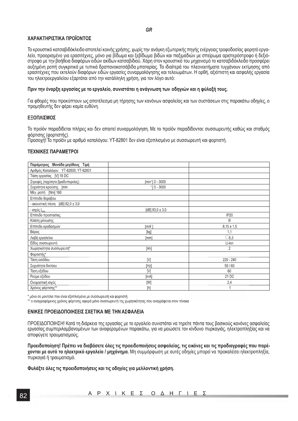 Το προϊόν παραδίδεται πλήρες και δεν απαιτεί συναρμολόγηση. Με το προϊόν παραδίδονται: συσσωρευτής καθώς και σταθμός φόρτισης (φορτιστής). Προσοχή! Το προϊόν με αριθμό καταλόγου: YT-82801 δεν είναι εξοπλισμένο με συσσωρευτή και φορτιστή. ΤΕΧΝΙΚΕΣ ΠΑΡΑΜΕΤΡΟΙ Παράμετρος Μονάδα μεγέθους Τιμή Αριθμός Καταλόγου YT-82800, YT-82801 Τάση εργασίας [V] 18 DC Στροφές (ταχύτητα βραδυπορείας) [min
