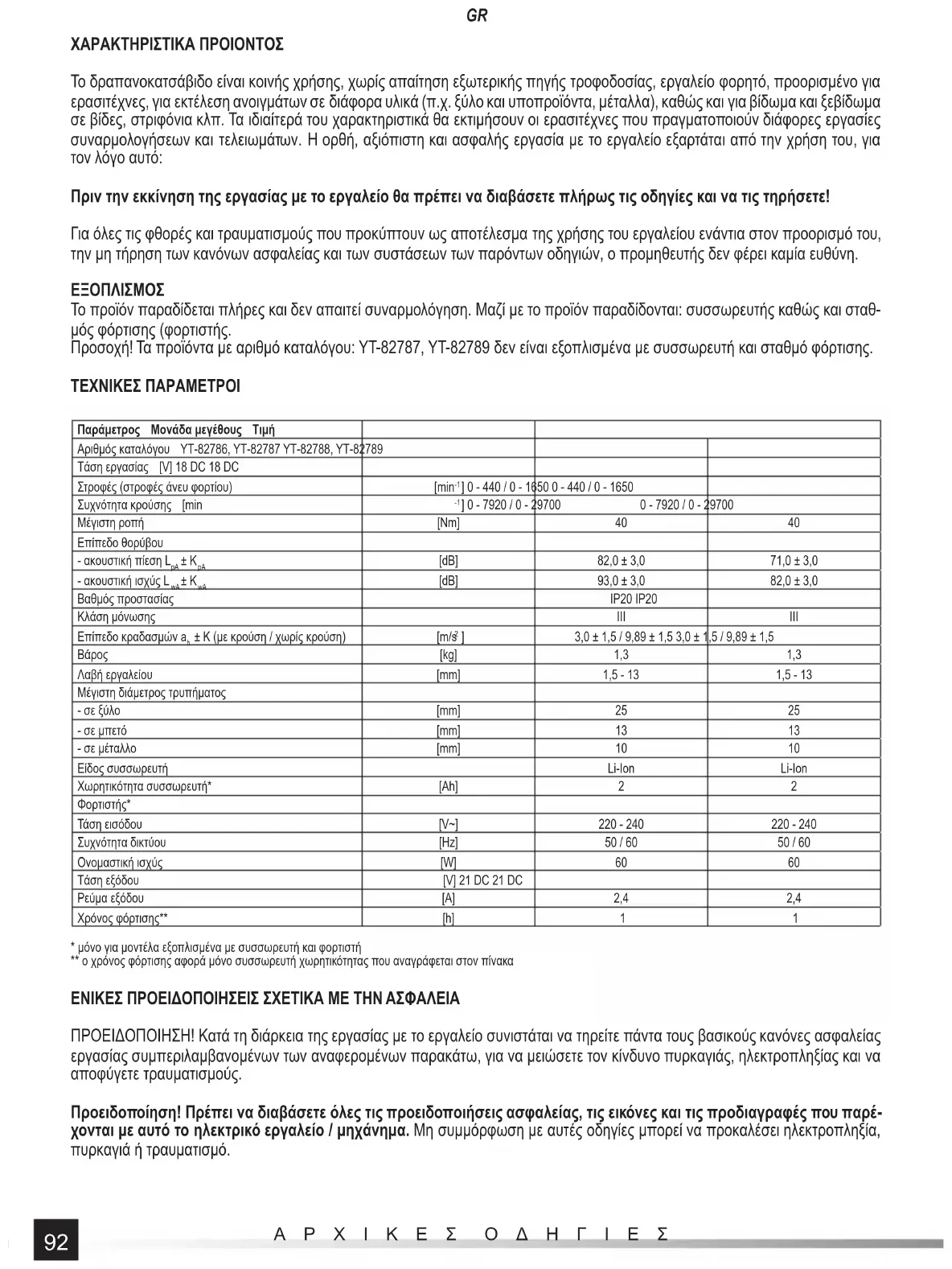 Το προϊόν παραδίδεται πλήρες και δεν απαιτεί συναρμολόγηση. Μαζί με το προϊόν παραδίδονται: συσσωρευτής καθώς και σταθ- μός φόρτισης (φορτιστής. Προσοχή! Τα προϊόντα με αριθμό καταλόγου: YT-82787, YT-82789 δεν είναι εξοπλισμένα με συσσωρευτή και σταθμό φόρτισης. ΤΕΧΝΙΚΕΣ ΠΑΡΑΜΕΤΡΟΙ Παράμετρος Μονάδα μεγέθους Τιμή Αριθμός καταλόγου YT-82786, YT-82787 YT-82788, YT-82789 Τάση εργασίας [V] 18 DC 18 DC Στροφές (στροφές άνευ φορτίου) [min