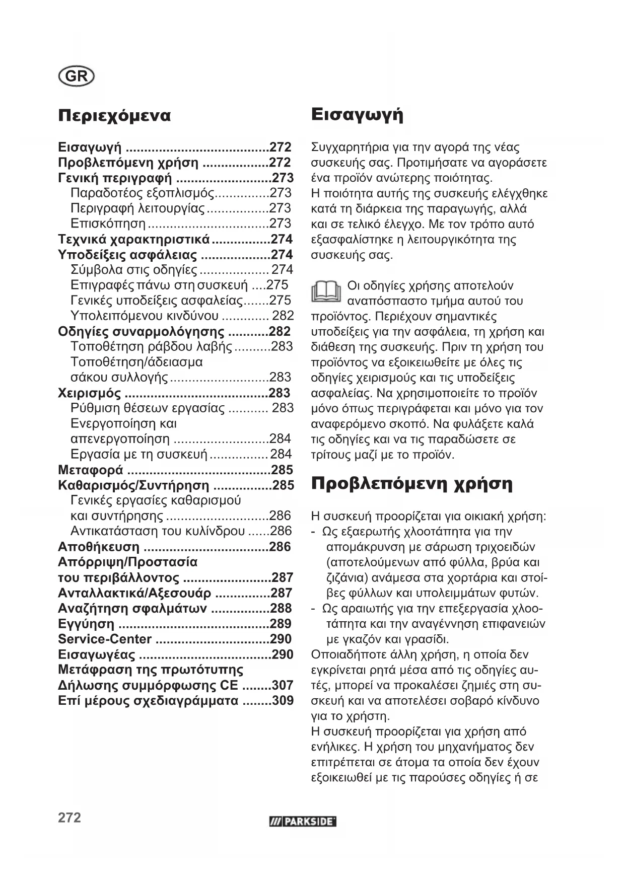 Συγχαρητήρια για την αγορά της νέας συσκευής σας. Προτιμήσατε να αγοράσετε ένα προϊόν ανώτερης ποιότητας. Η ποιότητα αυτής της συσκευής ελέγχθηκε κατά τη διάρκεια της παραγωγής, αλλά και σε τελικό έλεγχο. Με τον τρόπο αυτό εξασφαλίστηκε η λειτουργικότητα της συσκευής σας. Οι οδηγίες χρήσης αποτελούν αναπόσπαστο τμήμα αυτού του προϊόντος. Περιέχουν σημαντικές υποδείξεις για την ασφάλεια, τη χρήση και διάθεση της συσκευής. Πριν τη χρήση του προϊόντος να εξοικειωθείτε με όλες τις οδηγίες χειρισμούς και τις υποδείξεις ασφαλείας. Να χρησιμοποιείτε το προϊόν μόνο όπως περιγράφεται και μόνο για τον αναφερόμενο σκοπό. Να φυλάξετε καλά τις οδηγίες και να τις παραδώσετε σε τρίτους μαζί με το προϊόν. Προβλεπόμενη χρήση Η συσκευή προορίζεται για οικιακή χρήση:- Ως εξαερωτής χλοοτάπητα για την απομάκρυνση με σάρωση τριχοειδών (αποτελούμενων από φύλλα, βρύα και ζιζάνια) ανάμεσα στα χορτάρια και στοί-βες φύλλων και υπολειμμάτων φυτών. - Ως αραιωτής για την επεξεργασία χλοο-τάπητα και την αναγέννηση επιφανειών με γκαζόν και γρασίδι. Οποιαδήποτε άλλη χρήση, η οποία δεν εγκρίνεται ρητά μέσα από τις οδηγίες αυ-τές, μπορεί να προκαλέσει ζημιές στη συ-σκευή και να αποτελέσει σοβαρό κίνδυνο για το χρήστη.Η συσκευή προορίζεται για χρήση από ενήλικες. Η χρήση του μηχανήματος δεν επιτρέπεται σε άτομα τα οποία δεν έχουν εξοικειωθεί με τις παρούσες οδηγίες ή σε273