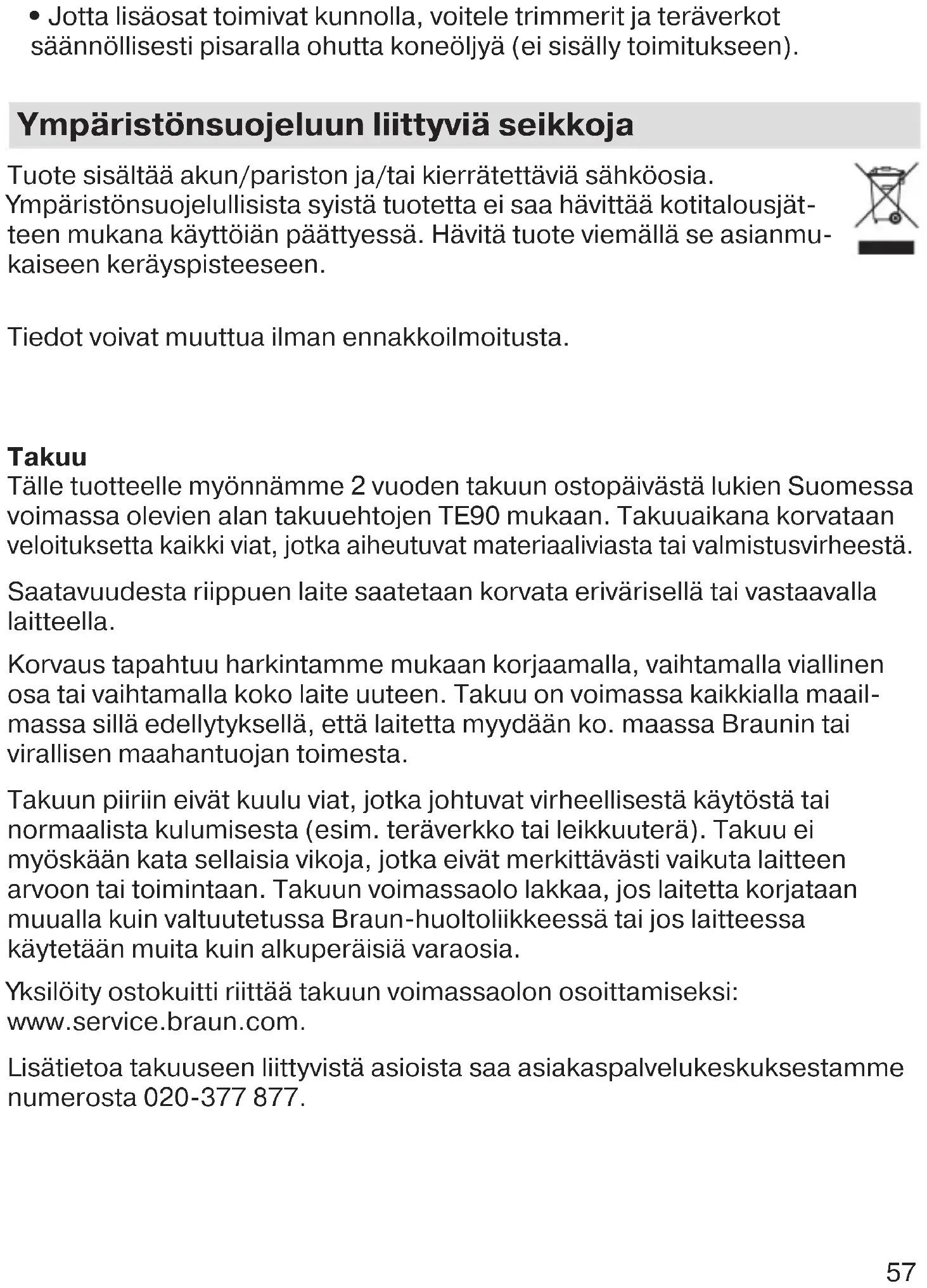H ΠΡΟΚΤΕΡ & ΓΚΑΜΠΛ ΕΛΛΑΣ ΜΕΠΕ με αρ. ΓΕΜΗ 003818801000 που εδρεύει στο Μαρούσι Αττικής, στην οδό Αγ. Κωνσταντίνου αρ. 49, Τ.Κ. 15124 παρέχει δύο (2) χρόνια εγγύηση, στο προϊόν, ξεκινώντας από την 90012280_Type5542_BT_7350_7340_7330_7320_5365_5360_5342_5340_MN_ANZ.indd 6190012280_Type5542_BT_7350_7340_7330_7320_5365_5360_5342_5340_MN_ANZ.indd 61 13.09.21 09:1913.09.21 09:1962 ημερομηνία αγοράς. Μέσα στην περίοδο εγγύησης καλύπτουμε, χωρίς χρέωση, οποιοδήποτε ελάττωμα προερχόμενο από κακή κατασκευή ή κακής ποιότητάς υλικό, είτε επισκευάζοντας είτε αντικαθιστώντας ολόκληρη τη συσκευή σύμφωνα με την κρίση μας. Ανάλογα με τη διαθεσιμότητα, το ανταλλακτικό ενδέχεται να είναι σε διαφορετικό χρώμα ή να είναι αντίστοιχο μοντέλο. Αυτή η εγγύηση ισχύει για προϊόντα που διατίθεται στην ελληνική επικράτεια. Η εγγύηση δεν καλύπτει: καταστροφή από κακή, ακατάλληλη ή/και επαγγελματική χρήση, φυσιολογική φθορά ή ελαττώματα λόγω αμέλειας του χρήστη. Η εγγύηση ακυρώνεται αν έχουν γίνει επισκευές από μη εξουσιοδοτημένα άτομα ή δεν έχουν χρησιμοποιηθεί γνήσια ανταλλακτικά Braun. Η παρούσα εγγύηση παρέχεται επιπλέον των δικαιωμάτων σας από τη σύμβαση αγοράς του προϊόντος σύμφωνα με την εφαρμοστέα νομοθεσία και δεν θίγει σε τίποτα τα δικαιώματά σας από αυτήν. Σε περίπτωση αντικατάστασης του προϊόντος ή ανταλλακτικού του στα πλαίσια της παρούσας εγγύησης, η εγγύηση δεν ανανεώνεται. Για να επιτύχετε service μέσα στην περίοδο της εγγύησης, παραδώστε ή στείλτε την συσκευή με την απόδειξη αγοράς σε ένα Εξουσιοδοτημένο Κατάστημα Service της Braun: www.service.braun.com. Καλέστε στο 800 801 3458 από σταθερό για να πληροφορηθείτε για το πλησιέστερο Εξουσιοδοτημένο Κατάστημα Service της Braun. 90012280_Type5542_BT_7350_7340_7330_7320_5365_5360_5342_5340_MN_ANZ.indd 6290012280_Type5542_BT_7350_7340_7330_7320_5365_5360_5342_5340_MN_ANZ.indd 62 13.09.21 09:1913.09.21 09:19