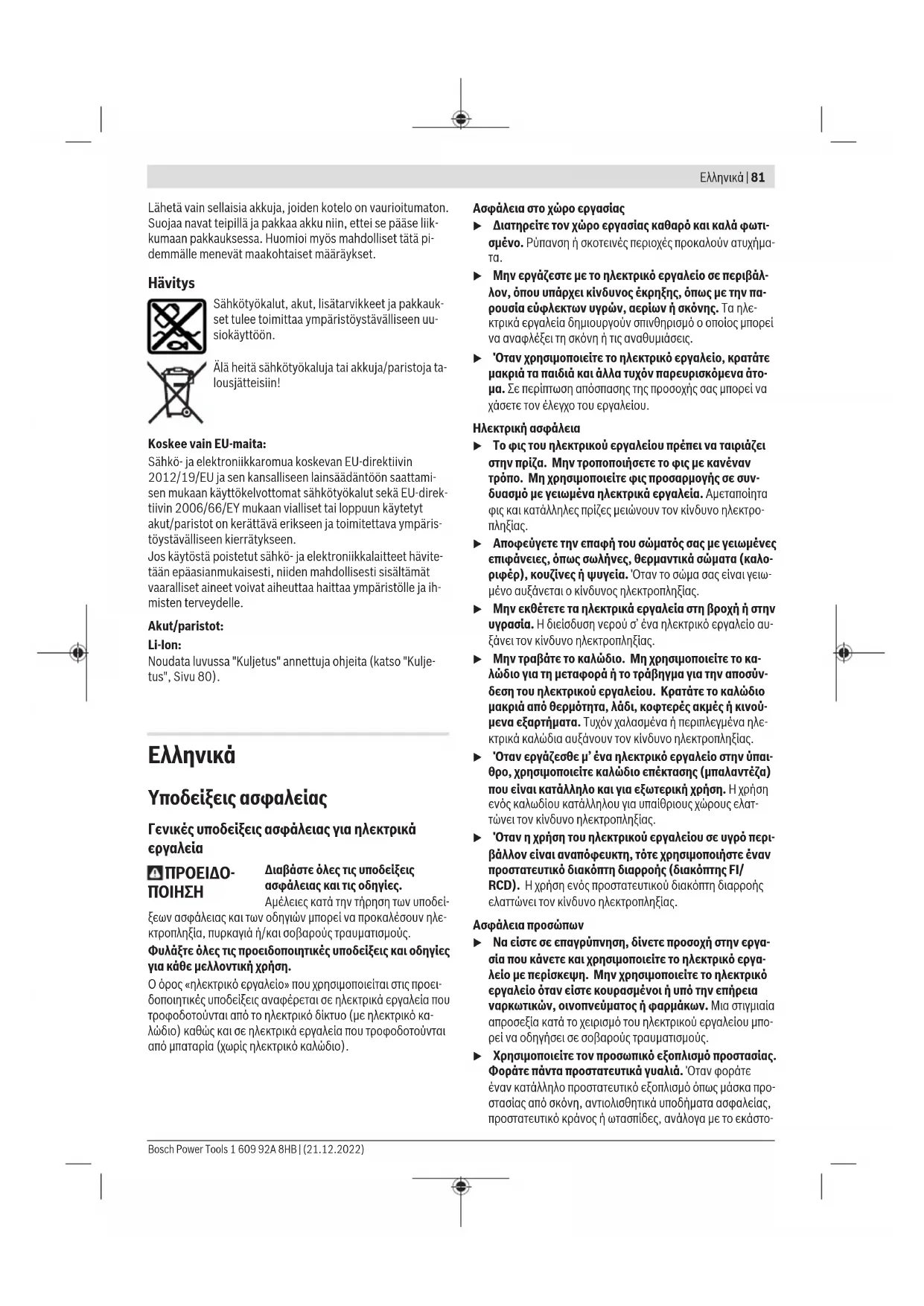 u Δώστε το ηλεκτρικό εργαλείο σας για συντήρηση από εξειδικευμένο προσωπικό, χρησιμοποιώντας μόνο γνή- σια ανταλλακτικά. Έτσι εξασφαλίζετε τη διατήρηση της ασφάλειας του ηλεκτρικού εργαλείου. Υποδείξεις ασφαλείας για όλες τις εφαρμογές Κοινές προειδοποιήσεις ασφάλειας συνηθισμένες για λείανση ή τρίψιμο u Αυτό το ηλεκτρικό εργαλείο προορίζεται για λειτουργία ως λειαντήρας ή τριβείο. Διαβάστε όλες τις υποδείξεις ασφαλείας, οδηγίες, εικονογραφήσεις και όλα τα τεχνι- κά στοιχεία, που συνοδεύουν αυτό το ηλεκτρικό εργα- λείο. Αμέλειες κατά την τήρηση των ακόλουθων υποδείξε- ων μπορεί να προκαλέσουν ηλεκτροπληξία, πυρκαγιά και/ή σοβαρούς τραυματισμούς. 1 609 92A 8HB | (21.12.2022) Bosch Power ToolsΕλληνικά | 83 u Οι εργασίες, όπως χρήση συρματόβουρτσας, στίλβωση ή κοπή, δε συνίσταται να εκτελούνται με αυτό το ηλε- κτρικό εργαλείο. Οι εργασίες, για τις οποίες το ηλεκτρικό εργαλείο δεν είναι σχεδιασμένο, μπορεί να δημιουργήσουν επικίνδυνες καταστάσεις και να προκαλέσουν τραυματι-