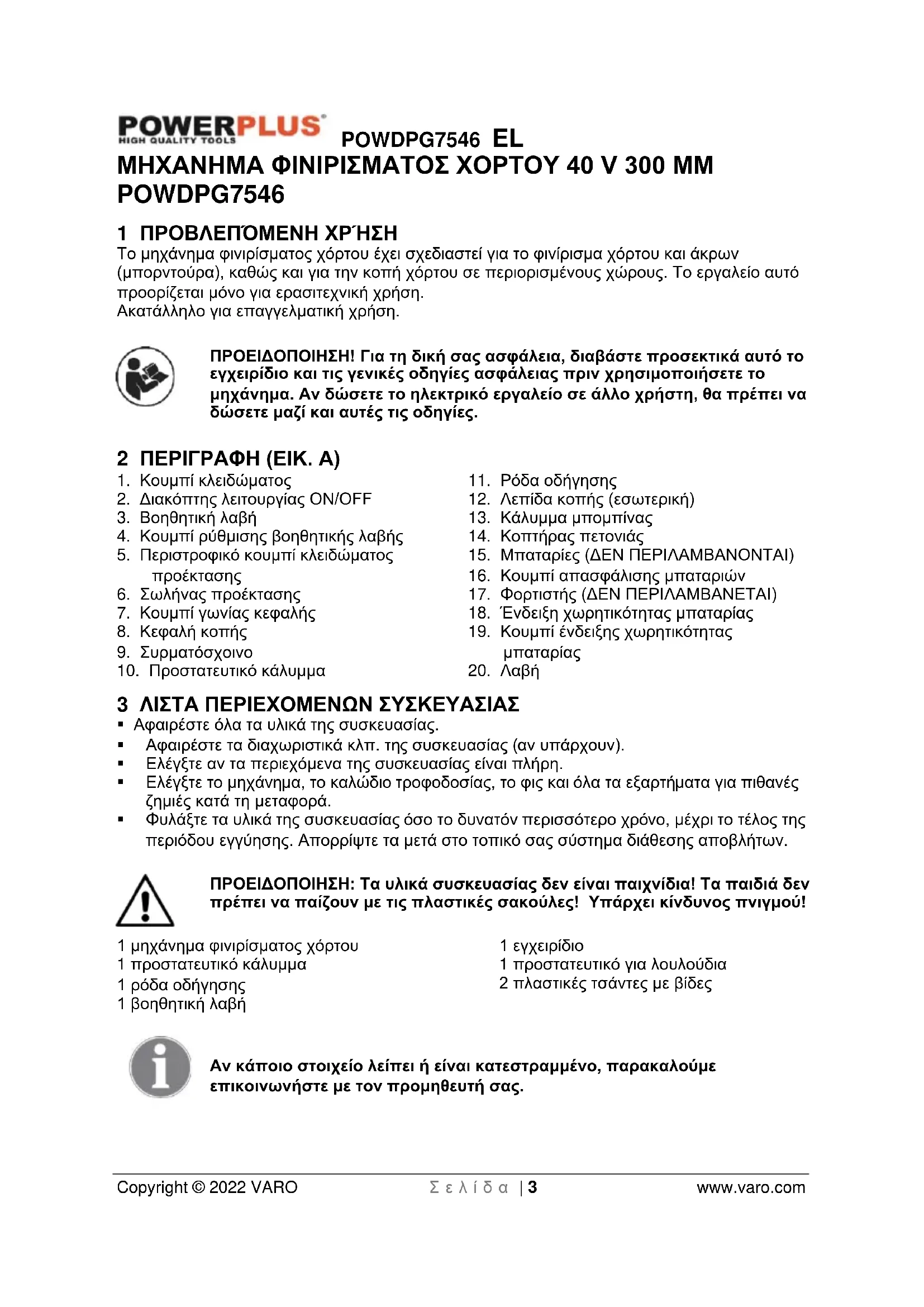 - 17 ΔΗΛΩΣΗ ΣΥΜΜΟΡΦΩΣΗΣ POWDPG7546 EL Copyright © 2022 VARO Σ ε λ ί δ α | 3 www.varo.com ΜΗΧΑΝΗΜΑ ΦΙΝΙΡΙΣΜΑΤΟΣ ΧΟΡΤΟΥ 40 V 300 MM POWDPG7546 1 ΠΡΟΒΛΕΠΌΜΕΝΗ ΧΡΉΣΗ Το μηχάνημα φινιρίσματος χόρτου έχει σχεδιαστεί για το φινίρισμα χόρτου και άκρων (μπορντούρα), καθώς και για την κοπή χόρτου σε περιορισμένους χώρους. Το εργαλείο αυτό προορίζεται μόνο για ερασιτεχνική χρήση. Ακατάλληλο για επαγγελματική χρήση. ΠΡΟΕΙΔΟΠΟΙΗΣΗ! Για τη δική σας ασφάλεια, διαβάστε προσεκτικά αυτό το εγχειρίδιο και τις γενικές οδηγίες ασφάλειας πριν χρησιμοποιήσετε το μηχάνημα. Αν δώσετε το ηλεκτρικό εργαλείο σε άλλο χρήστη, θα πρέπει να δώσετε μαζί και αυτές τις οδηγίες. 2 ΠΕΡΙΓΡΑΦΗ (EIK. A) p. 14