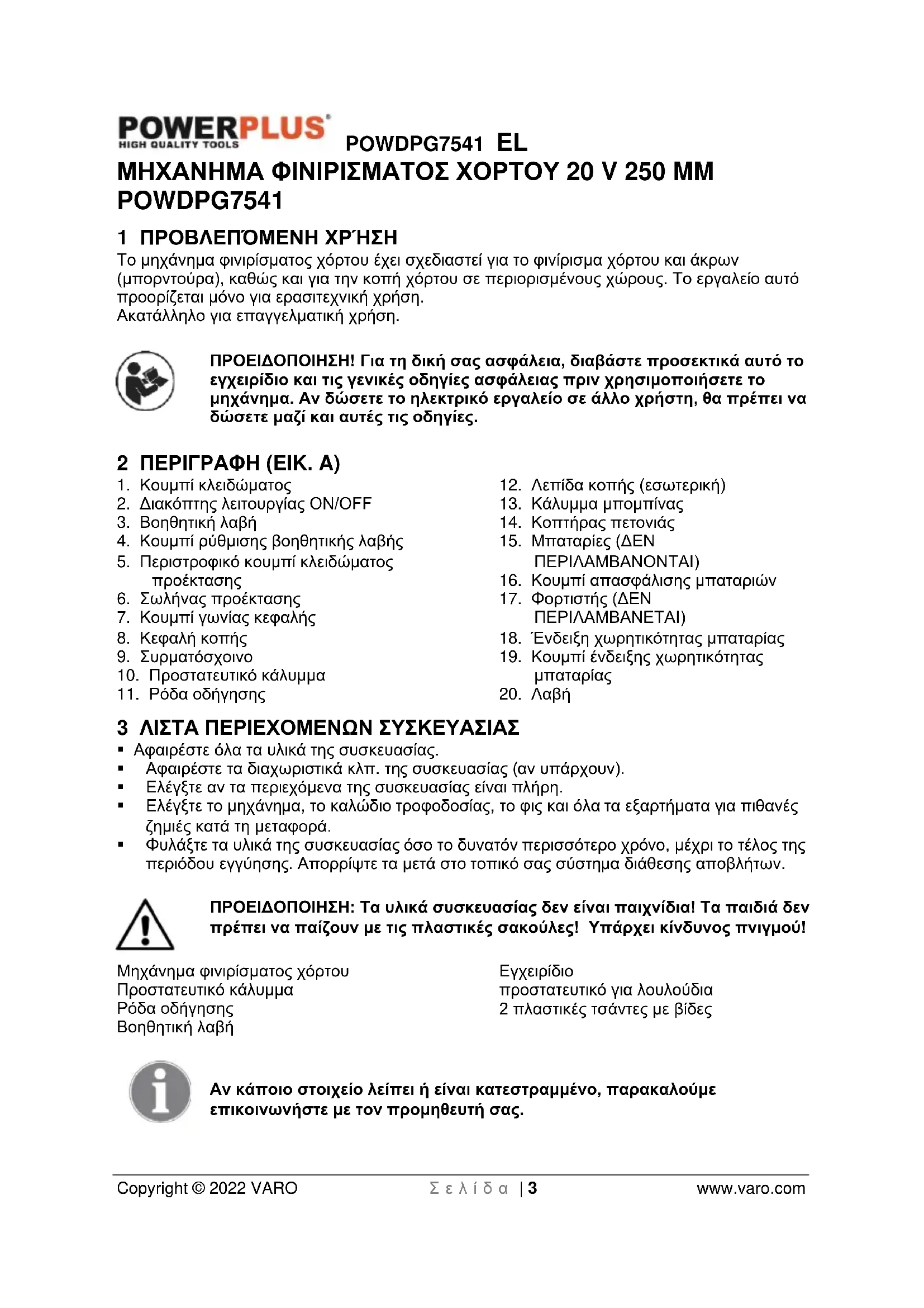 - 17 ΔΗΛΩΣΗ ΣΥΜΜΟΡΦΩΣΗΣ POWDPG7541 EL Copyright © 2022 VARO Σ ε λ ί δ α | 3 www.varo.com ΜΗΧΑΝΗΜΑ ΦΙΝΙΡΙΣΜΑΤΟΣ ΧΟΡΤΟΥ 20 V 250 MM POWDPG7541 1 ΠΡΟΒΛΕΠΌΜΕΝΗ ΧΡΉΣΗ Το μηχάνημα φινιρίσματος χόρτου έχει σχεδιαστεί για το φινίρισμα χόρτου και άκρων (μπορντούρα), καθώς και για την κοπή χόρτου σε περιορισμένους χώρους. Το εργαλείο αυτό προορίζεται μόνο για ερασιτεχνική χρήση. Ακατάλληλο για επαγγελματική χρήση. ΠΡΟΕΙΔΟΠΟΙΗΣΗ! Για τη δική σας ασφάλεια, διαβάστε προσεκτικά αυτό το εγχειρίδιο και τις γενικές οδηγίες ασφάλειας πριν χρησιμοποιήσετε το μηχάνημα. Αν δώσετε το ηλεκτρικό εργαλείο σε άλλο χρήστη, θα πρέπει να δώσετε μαζί και αυτές τις οδηγίες. 2 ΠΕΡΙΓΡΑΦΗ (EIK. A) p. 14
