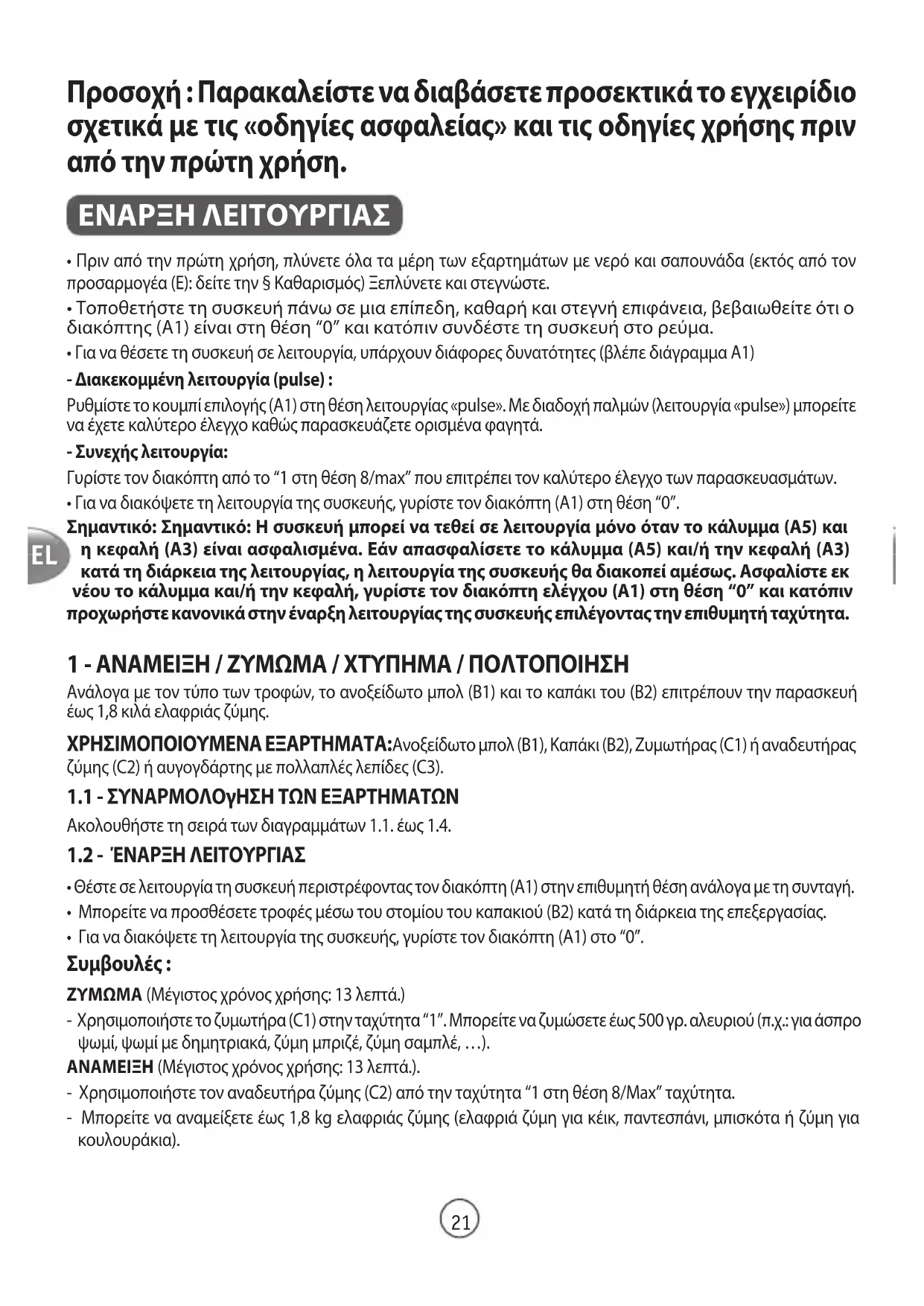 - Θέστε σε λειτουργία τη συσκευή περιστρέφοντας τον διακόπτη (A1) στην επιθυμητή θέση ανάλογα με τη συνταγή. • Μπορείτε να προσθέσετε τροφές μέσω του στομίου του καπακιού (B2) κατά τη διάρκεια της επεξεργασίας.• Για να διακόψετε τη λειτουργία της συσκευής, γυρίστε τον διακόπτη (A1) στο “0”. Συμβουλές : ΖΥΜΩΜΑ (Μέγιστος χρόνος χρήσης: 13 λεπτά.)- Χρησιμοποιήστε το ζυμωτήρα (C1) στην ταχύτητα “1”. Μπορείτε να ζυμώσετε έως 500 γρ. αλευριού (π.χ.: για άσπρο ψωμί, ψωμί με δημητριακά, ζύμη μπριζέ, ζύμη σαμπλέ, …).ΑΝΑΜΕΙΞΗ (Μέγιστος χρόνος χρήσης: 13 λεπτά.).- Χρησιμοποιήστε τον αναδευτήρα ζύμης (C2) από την ταχύτητα “1 στη θέση 8/Max” ταχύτητα. - Μπορείτε να αναμείξετε έως 1,8 kg ελαφριάς ζύμης (ελαφριά ζύμη για κέικ, παντεσπάνι, μπισκότα ή ζύμη για κουλουράκια).22