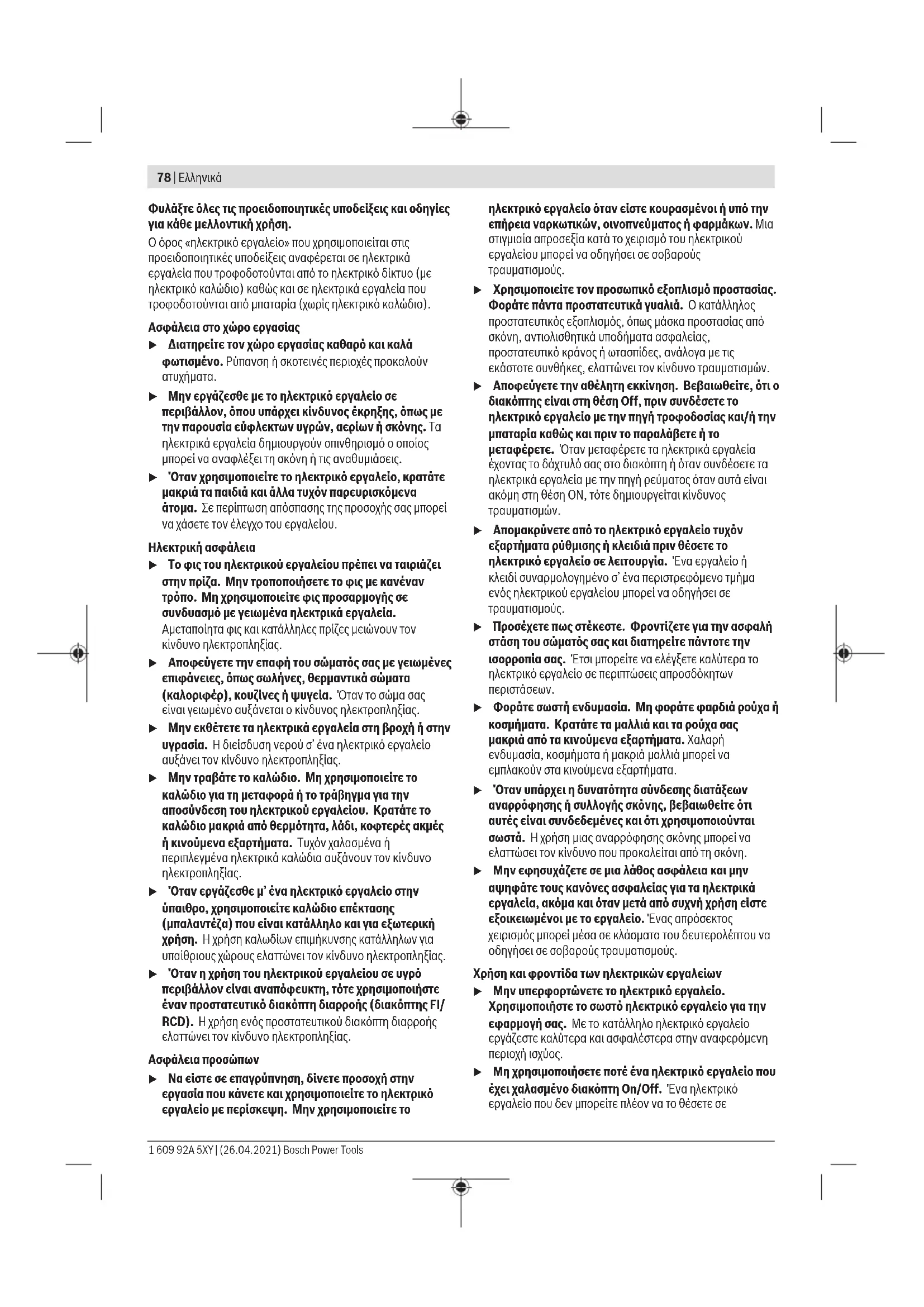 Διαβάστε όλες τις υποδείξεις ασφαλείας, οδηγίες, εικονογραφήσεις και όλα τα τεχνικά στοιχεία, που συνοδεύουν αυτό το ηλεκτρικό εργαλείο. Αμέλειες κατά την τήρηση των ακόλουθων υποδείξεων μπορεί να προκαλέσουν ηλεκτροπληξία, πυρκαγιά και/ή σοβαρούς τραυματισμούς. Bosch Power Tools 1 609 92A 5XY | (26.04.2021)78 | Ελληνικά Φυλάξτε όλες τις προειδοποιητικές υποδείξεις και οδηγίες για κάθε μελλοντική χρήση. Ο όρος «ηλεκτρικό εργαλείο» που χρησιμοποιείται στις προειδοποιητικές υποδείξεις αναφέρεται σε ηλεκτρικά εργαλεία που τροφοδοτούνται από το ηλεκτρικό δίκτυο (με ηλεκτρικό καλώδιο) καθώς και σε ηλεκτρικά εργαλεία που τροφοδοτούνται από μπαταρία (χωρίς ηλεκτρικό καλώδιο). Ασφάλεια στο χώρο εργασίας u Διατηρείτε τον χώρο εργασίας καθαρό και καλά φωτισμένο. Ρύπανση ή σκοτεινές περιοχές προκαλούν